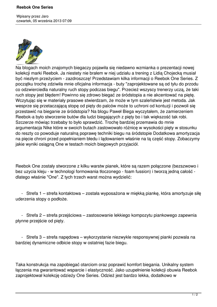 Reebok One Series Wpisany przez Jaro czwartek, 05 września 2013 07:09 Na blogach moich znajomych biegaczy pojawiła się niedawno wzmianka o prezentacji nowej kolekcji marki Reebok. Ja niestety nie brałem w niej udziału a trening z Lidią Chojecką musiał być niezłym przeżyciem - zazdroszczę! Przedstawiam kilka informacji o Reebok One Series. Z początku trochę zdziwiła mnie oficjalna informacja - buty "zaprojektowane są od tyłu do przodu co odzwierciedla naturalny ruch stopy podczas biegu". Przecież wszyscy trenerzy uczą, że taki ruch stopy jest błędem! Powinno się zdrowo biegać ze śródstopia a nie akcentować na piętę. Wczytując się w materiały prasowe stwierdzam, że może w tym szaleństwie jest metoda. Jak wesprze się przetaczającą stopę od pięty do palców może to uchroni od kontuzji i pozwoli się przestawić na bieganie ze śródstopia? Na blogu Paweł Biega wyczytałem, że zamierzeniem Reebok-a było stworzenie butów dla ludzi biegających z pięty bo i tak większość tak robi. Szczerze mówiąc trzebaby to było sprawdzić. Trochę bardziej przemawia do mnie argumentacja Nike które w swoich butach zastowowało różnicę w wysokości pięty w stosunku do reszty co powoduje naturalną poprawę techniki biegu na śródstopie Dodatkowa amortyzacja na pięcie chroni przed popełnianiem błedu i lądowaniem właśnie na tą część stopy. Zobaczymy jakie wyniki osiągną One w testach moich biegowych przyjaciół. Reebok One zostały stworzone z kilku warstw pianek, które są razem połączone (bezszwowo i bez uzycia kleju - w technologi formowania tłoczonego - foam fussion) i tworzą jedną całość dlatego właśnie "One". Z tych trzech warst można wydzielić: - Strefa 1 – strefa kontaktowa – została wyposażona w miękką piankę, która amortyzuje siłę uderzenia stopy o podłoże. - Strefa 2 – strefa przejściowa – zastosowanie lekkiego kompozytu piankowego zapewnia płynne przejście od pięty. - Strefa 3 – strefa napędowa – wykorzystanie niezwykle responsywnej pianki pozwala na bardziej dynamiczne odbicie stopy w ostatniej fazie biegu. Taka konstrukcja ma zapobiegać otarciom oraz poprawić komfort biegania. Unikalny system łączenia ma gwarantować wsparcie i elastyczność. Jako uzupełnienie kolekcji obuwia Reebok zaprojektował kolekcję odzieży One Series. Odzież jest bardzo lekka, dodatkowo w 1/2 Reebok One Series Wpisany przez Jaro czwartek, 05 września 2013 07:09 strategicznych miejscach rozmieszczono siateczkę umożliwiającą lepszy przepływ powietrza. Wzory stworzone przez Reebok zapewnią stylowy wygląd bez kompromisów w kwestii funkcjonalności, a odblaskowe elementy sprawią, że nocny trening będzie bezpieczny. Firma z Massachusetts wchodzi w segment już lekko zapomniany przez innych producentów biegaczy amatorów. Jestem ciekaw jak się powiedzie ten eksperyment. Oferta wygląda ciekawie i z pewnością będę śledził testy tego sprzętu. 2/2