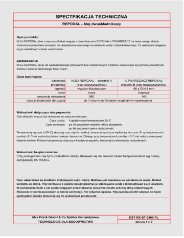 SPECTFIKACJA TECHNICZNA REPOXAL – klej dwuskładnikowy Opis produktu: KLEJ-REPOXAL (bez rozpuszczalnika) reaguje z utwardzaczem REPOXAL-UTWARDZACZ na bazie swego składu. Chemiczna przemiana prowadzi do utwardzenia odpornego na działanie wody i chemikaliów kleju. Te własności osiągane są po określonym czasie utwardzania. Zastosowania: KLEJ-REPOXAL służy do wodoszczelnego zamykania tulei dystansowych z betonu włóknistego za pomocą specjalnych korków z betonu włóknistego firmy Frank. Dane techniczne: własności produktów lepkość kolor proporcje mieszania czas przydatności do użycia KLEJ REPOXAL – składnik A UTWARDZACZ REPOXAL (bez rozpuszczalnika) składnik B (bez rozpuszczalnika) wysoko tiksotropowy 90 s DIN 4 mm szary brązowy 860 140 do 1 roku w zamkniętym oryginalnym opakowaniu Wskazówki dotyczące otrzymywania: Oba składniki muszą być dokładnie ze sobą wymieszane. Czas użycia: Czas schnięcia: 4 godziny przy temperaturze 20o C po 48 godzinach możliwe lekkie obciążenie po 96 godzinach pełna obciążalność Temperatury wyższe (>20 C) skracają czas użycia i reakcji, temperatury niższe wydłużają ten czas. Przy temperaturach o poniżej +5o C nie zachodzą żadne reakcje chemiczne. Dlatego przy temperaturach poniżej +5o C nie należy wykonywać klejenia korków. Podane temperatury dotyczą w każdym przypadku temperatury elementów budowlanych. Wskazówki bezpieczeństwa: Przy posługiwaniu się tymi produktami należy stosować się do zaleceń zasad bezpieczeństwa wg normy europejskiej 91/155/EG. Klej i utwardzacz są środkami drażniącymi oczy i skórę. Możliwe jest uczulenie po kontakcie ze skórą. Unikać kontaktu ze skórą. Przy kontakcie z oczami należy przemyć je intensywnie wodą i skonsultować się z lekarzem. W pomieszczeniach o nie wystarczającym przewietrzaniu stosować środki ochrony dróg oddechowych. Stosować w pomieszczeniach o dobrej wentylacji. Nie wdychać oparów. Klej zawiera środki wiążące na bazie epoksydów. Należy stosować się do wskazówek producenta. Max Frank GmbH & Co Spółka Komandytowa DST-RX-ST-0809-PL TECHNOLOGIE DLA BUDOWNICTWA strona 1 z 2 SPECTFIKACJA TECHNICZNA REPOXAL – klej dwuskładnikowy Tabela trwałości. Znajdujących się w kleju REPOXAL środków wiążących przeciwko różnym czynnikom. Próby obciążenia zostały przeprowadzone w temperaturze 20o C, właściwości sprawdzane były co miesiąc. 2 latach próbę przerwano. czynnik czas obciążenia właściwości kleju trwałość woda destylowana 2 lata bez zmian trwały woda bieżąca woda mineralna gazowana CO2 2 lata bez zmian trwały 2 lata bez zmian trwały woda morska 2 lata bez zmian trwały woda z pływalni 2 lata bez zmian trwały ścieki 2 lata bez zmian trwały roztwór sody (10%) 2 lata bez zmian trwały roztwór sody (20%) 2 lata bez zmian trwały ług potasowy (5%) 2 lata bez zmian trwały ług potasowy (25%) 2 lata bez zmian trwały ług potasowy (50%) 2 lata bez zmian trwały kwas solny (10%) 2 lata bez zmian trwały kwas siarkowy (10%) po 2 miesiącach bez zmian nie trwały kwas siarkowy (20%) po 2 miesiącach tworzenie się pęcherzyków nie trwały kwas azotowy (10%) 2 lata tworzenie się pęcherzyków warunkowo lekkie przebarwienie trwały podchlorek wapniowy (5%) 2 lata bez zmian trwały kwasy siarkawe (10%) 2 lata bez zmian trwały siarczek sodowy (20%) 2 lata bez zmian trwały siarczek sodowy (40%) 2 lata bez zmian trwały ług pralniczy 2 lata bez zmian trwały kwas karboksylowy (5%) 1,5 roku tworzenie się pęcherzyków nie trwały gliceryna 2 lata bez zmian trwały olej jadalny 2 lata bez zmian trwały ocet winny 2 lata bez zmian trwały kapusta kiszona 2 lata bez zmian trwały mleko 2 lata bez zmian trwały serwatka 2 lata bez zmian trwały coca-cola 2 lata bez zmian trwały benzyna 2 lata bez zmian trwały alkohol metylowy (50%) 2 lata bez zmian trwały alkohol etylowy (50%) 2 lata bez zmian trwały powierzchnia rozpuszczona nie trwały metan ozon formaldehydy 7 dni izobutan 7 dni Max Frank GmbH & Co Spółka Komandytowa Oddział w Polsce, 02-220 Warszawa ul. Łopuszańska 36 tel. 022-577 05 81, 022-577-07 18, fax: 022-846 27 37 www.maxfrank.pl e-mail: [email protected] REPOXAL - klej dwuskładnikowy DST-RX-ST-0809-PL strona 2 z 2
