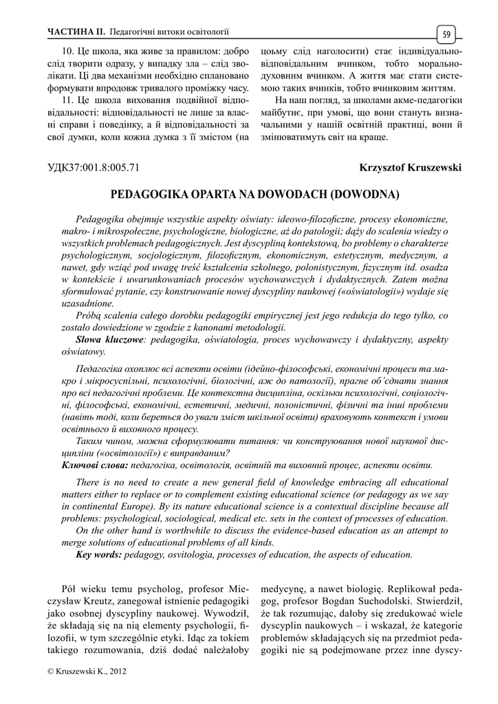 ЧАСТИНА ІI. Педагогічні витоки освітології 10. Це школа, яка живе за правилом: добро слід творити одразу, у випадку зла – слід зволікати. Ці два механізми необхідно сплановано формувати впродовж тривалого проміжку часу. 11. Це школа виховання подвійної відповідальності: відповідальності не лише за власні справи і поведінку, а й відповідальності за свої думки, коли кожна думка з її змістом (на УДК37:001.8:005.71 59 цоьму слід наголосити) стає індивідуальновідповідальним вчинком, тобто моральнодуховним вчинком. А життя має стати системою таких вчинків, тобто вчинковим життям. На наш погляд, за школами акме-педагогіки майбутнє, при умові, що вони стануть визначальними у нашій освітній практиці, вони й змінюватимуть світ на краще. Krzysztof Kruszewski PEDAGOGIKA OPARTA NA DOWODACH (DOWODNA) Pedagogika obejmuje wszystkie aspekty oświaty: ideowo-filozoficzne, procesy ekonomiczne, makro- i mikrospołeczne, psychologiczne, biologiczne, aż do patologii; dąży do scalenia wiedzy o wszystkich problemach pedagogicznych. Jest dyscypliną kontekstową, bo problemy o charakterze psychologicznym, socjologicznym, filozoficznym, ekonomicznym, estetycznym, medycznym, a nawet, gdy wziąć pod uwagę treść kształcenia szkolnego, polonistycznym, fizycznym itd. osadza w kontekście i uwarunkowaniach procesów wychowawczych i dydaktycznych. Zatem można sformułować pytanie, czy konstruowanie nowej dyscypliny naukowej («oświatologii») wydaje się uzasadnione. Próbą scalenia całego dorobku pedagogiki empirycznej jest jego redukcja do tego tylko, co zostało dowiedzione w zgodzie z kanonami metodologii. Słowa kluczowe: pedagogika, oświatologia, proces wychowawczy i dydaktyczny, aspekty oświatowy. Педагогіка охоплює всі аспекти освіти (ідейно-філософські, економічні процеси та макро і мікросуспільні, психологічні, біологічні, аж до патології), прагне об’єднати знання про всі педагогічні проблеми. Це контекстна дисципліна, оскільки психологічні, соціологічні, філософські, економічні, естетичні, медичні, полоністичні, фізичні та інші проблеми (навіть тоді, коли береться до уваги зміст шкільної освіти) враховують контекст і умови освітнього й виховного процесу. Таким чином, можна сформулювати питання: чи конструювання нової наукової дисципліни («освітології») є виправданим? Ключові слова: педагогіка, освітологія, освітній та виховний процес, аспекти освіти. There is no need to create a new general field of knowledge embracing all educational matters either to replace or to complement existing educational science (or pedagogy as we say in continental Europe). By its nature educational science is a contextual discipline because all problems: psychological, sociological, medical etc. sets in the context of processes of education. On the other hand is worthwhile to discuss the evidence-based education as an attempt to merge solutions of educational problems of all kinds. Key words: pedagogy, osvitologia, processes of education, the aspects of education. Pół wieku temu psycholog, profesor Mieczysław Kreutz, zanegował istnienie pedagogiki jako osobnej dyscypliny naukowej. Wywodził, że składają się na nią elementy psychologii, filozofii, w tym szczególnie etyki. Idąc za tokiem takiego rozumowania, dziś dodać należałoby © Kruszewski K., 2012 medycynę, a nawet biologię. Replikował pedagog, profesor Bogdan Suchodolski. Stwierdził, że tak rozumując, dałoby się zredukować wiele dyscyplin naukowych – i wskazał, że kategorie problemów składających się na przedmiot pedagogiki nie są podejmowane przez inne dyscy- 60 CZĘŚĆ ІI. Źródła pedagogiczne oświatologii pliny, a już szczególnie w całym ich złożeniu i wzajemnych uwarunkowaniach. Pedagogika jest więc nauką obejmującą wszystkie aspekty oświaty, od podstaw ideowo-filozoficznych, przez procesy ekonomiczne, makroi mikrospołeczne, psychologiczne, biologiczne, aż do patologii, dążąc do scalenia zdobywanej wiedzy na temat wszystkich problemów pedagogicznych, choć osiągnięcie takiej syntezy jest oczywiście niemożliwe. Ze swojej istoty pedagogika jest dyscypliną kontekstową, bo problemy o charakterze psychologicznym, socjologicznym, filozoficznym, ekonomicznym, estetycznym, medycznym, a nawet, gdy wziąć pod uwagę treść kształcenia szkolnego, polonistycznym, fizycznym itd. osadzają ją w kontekście szeroko rozumianych procesów wychowawczych i dydaktycznych oraz uwarunkowań tych procesów. Podobnie rzecz ma się z subdyscyplinami pedagogiki. Na przykład dydaktykę można by zdefiniować jako subdyscyplinę pedagogiki, rozpatrującą uczenie się jako główną czynność regulującą stosunki człowieka z otoczeniem zorganizowanym celowo według planowanych zmian, jakie mają zajść w tym człowieku. Na przedmiot dydaktyki składają się więc: • natura i organizowan