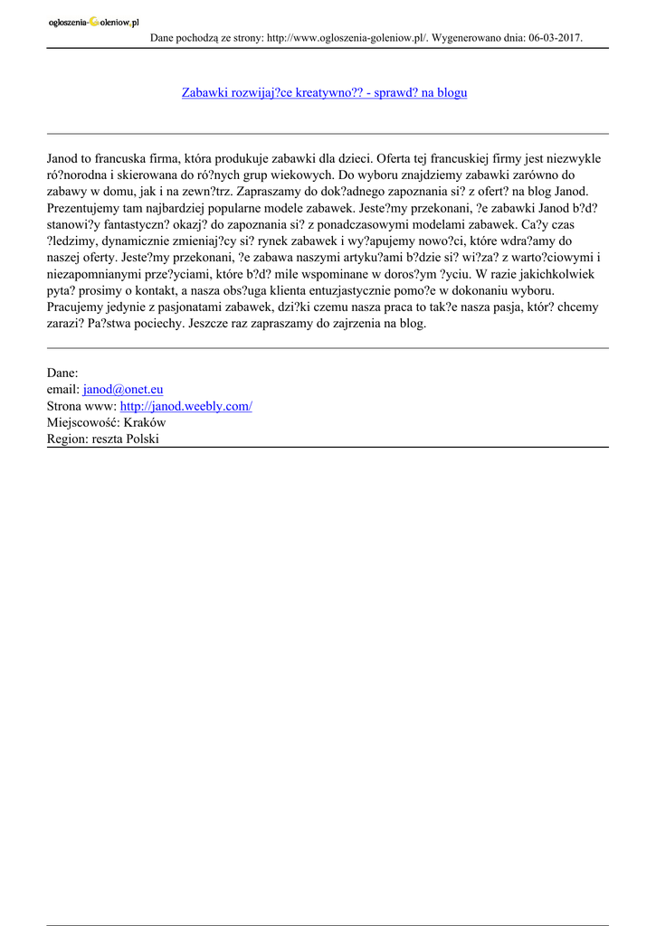 Dane pochodzą ze strony: http://www.ogloszenia-goleniow.pl/. Wygenerowano dnia: 06-03-2017. Zabawki rozwijaj?ce kreatywno?? - sprawd? na blogu Janod to francuska firma, która produkuje zabawki dla dzieci. Oferta tej francuskiej firmy jest niezwykle ró?norodna i skierowana do ró?nych grup wiekowych. Do wyboru znajdziemy zabawki zarówno do zabawy w domu, jak i na zewn?trz. Zapraszamy do dok?adnego zapoznania si? z ofert? na blog Janod. Prezentujemy tam najbardziej popularne modele zabawek. Jeste?my przekonani, ?e zabawki Janod b?d? stanowi?y fantastyczn? okazj? do zapoznania si? z ponadczasowymi modelami zabawek. Ca?y czas ?ledzimy, dynamicznie zmieniaj?cy si? rynek zabawek i wy?apujemy nowo?ci, które wdra?amy do naszej oferty. Jeste?my przekonani, ?e zabawa naszymi artyku?ami b?dzie si? wi?za? z warto?ciowymi i niezapomnianymi prze?yciami, które b?d? mile wspominane w doros?ym ?yciu. W razie jakichkolwiek pyta? prosimy o kontakt, a nasza obs?uga klienta entuzjastycznie pomo?e w dokonaniu wyboru. Pracujemy jedynie z pasjonatami zabawek, dzi?ki czemu nasza praca to tak?e nasza pasja, któr? chcemy zarazi? Pa?stwa pociechy. Jeszcze raz zapraszamy do zajrzenia na blog. Dane: email: [email protected] Strona www: http://janod.weebly.com/ Miejscowość: Kraków Region: reszta Polski