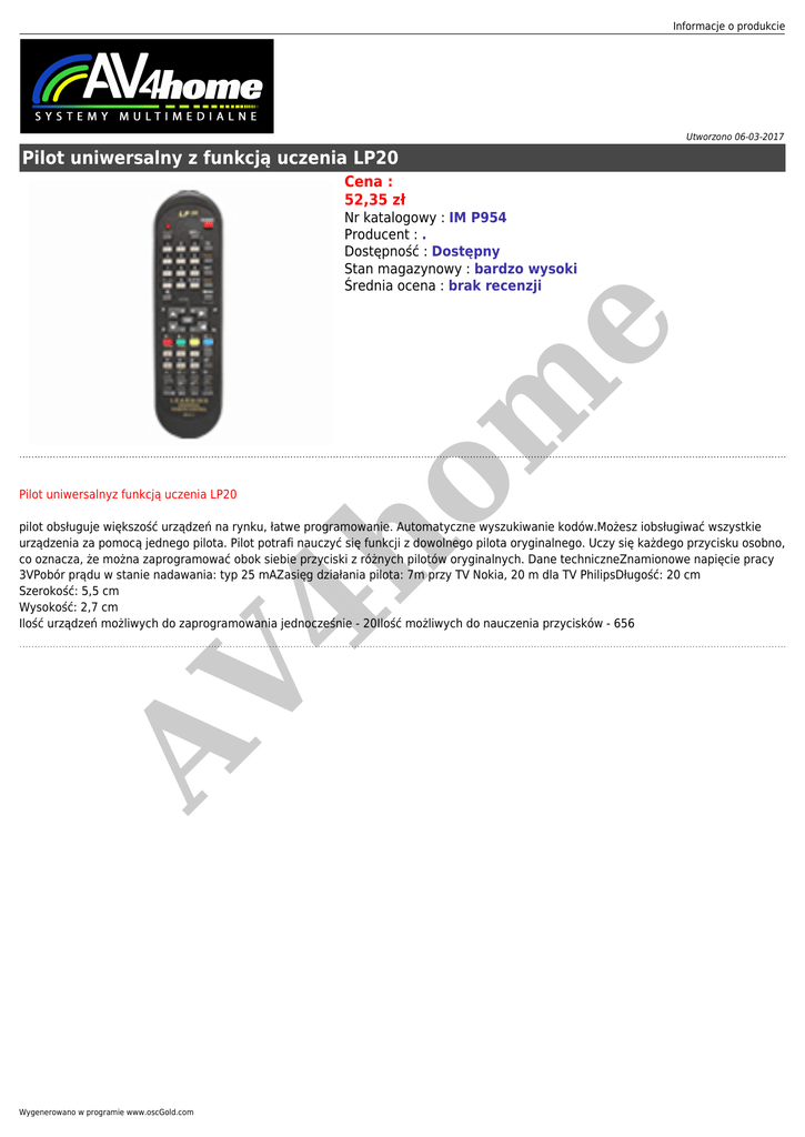 Informacje o produkcie Utworzono 06-03-2017 Pilot uniwersalny z funkcją uczenia LP20 Cena : 52,35 zł Pilot uniwersalnyz funkcją uczenia LP20 om e Nr katalogowy : IM P954 Producent : . Dostępność : Dostępny Stan magazynowy : bardzo wysoki Średnia ocena : brak recenzji AV 4h pilot obsługuje większość urządzeń na rynku, łatwe programowanie. Automatyczne wyszukiwanie kodów.Możesz iobsługiwać wszystkie urządzenia za pomocą jednego pilota. Pilot potrafi nauczyć się funkcji z dowolnego pilota oryginalnego. Uczy się każdego przycisku osobno, co oznacza, że można zaprogramować obok siebie przyciski z różnych pilotów oryginalnych. Dane techniczneZnamionowe napięcie pracy 3VPobór prądu w stanie nadawania: typ 25 mAZasięg działania pilota: 7m przy TV Nokia, 20 m dla TV PhilipsDługość: 20 cm Szerokość: 5,5 cm Wysokość: 2,7 cm Ilość urządzeń możliwych do zaprogramowania jednocześnie - 20Ilość możliwych do nauczenia przycisków - 656 Wygenerowano w programie www.oscGold.com