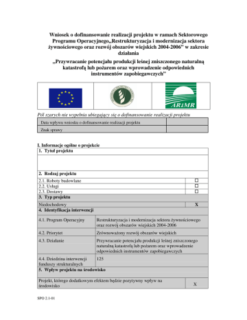 Wniosek o dofinansowanie realizacji projektu w ramach Sektorowego Programu Operacyjnego„Restrukturyzacja i modernizacja sektora ywno ciowego oraz rozwój obszarów wiejskich 2004-2006” w zakresie działania „Przywracanie potencjału produkcji le nej zniszczonego naturaln katastrof lub po arem oraz wprowadzenie odpowiednich instrumentów zapobiegawczych” Pól szarych nie wypełnia ubiegaj cy si o dofinansowanie realizacji projektu Data wpływu wniosku o dofinansowanie realizacji projektu Znak sprawy I. Informacje ogólne o projekcie 1. Tytuł projektu 2. Rodzaj projektu 2.1. Roboty budowlane 2.2. Usługi 2.3. Dostawy 3. Typ projektu X Niedochodowy 4. Identyfikacja interwencji 4.1. Program Operacyjny Restrukturyzacja i modernizacja sektora ywno ciowego oraz rozwój obszarów wiejskich 2004-2006 4.2. Priorytet Zrównowa ony rozwój obszarów wiejskich 4.3. Działanie Przywracanie potencjału produkcji le nej zniszczonego naturaln katastrof lub po arem oraz wprowadzenie odpowiednich instrumentów zapobiegawczych 4.4. Dziedzina interwencji 125 funduszy strukturalnych 5. Wpływ projektu na rodowisko Projekt, którego dodatkowym efektem b dzie pozytywny wpływ na rodowisko SPO 2.1-01 X 6. Zgodno projektu z polityk równych szans Projekt neutralny pod wzgl dem równych szans kobiet i m czyzn II. Identyfikacja ubiegaj cego si o dofinansowanie realizacji projektu 7. Dane ubiegaj cego si o dofinansowanie realizacji projektu 7.1. Nazwa nadle nictwa 7.2. Numer identyfikacji podatkowej NIP 7.3. Numer identyfikacyjny w krajowym rejestrze urz dowym podmiotów gospodarki narodowej (REGON) 7.4. Adres (województwo, powiat, gmina, kod pocztowy, miejscowo ulica, numer domu, numer lokalu) 7.5.Numer telefonu 7.6. Numer faksu 7.7. Adres poczty elektronicznej 8. Nadle niczy 8.1. Imi i nazwisko 8.2. Numer telefonu 8.3. Numer faksu 8.4. Adres poczty elektronicznej 9. Pełnomocnik ubiegaj cego si o dofinansowanie realizacji projektu 9.1. Imi i nazwisko 9.2. Adres (województwo, powiat, gmina, kod pocztowy, miejscowo ulica, numer domu, numer lokalu) 9.3. Stanowisko 9.4. Numer telefonu 9.5. Numer faksu 9.6. Adres poczty elektronicznej 10. Dane osoby uprawnionej/ osób uprawnionych do kontaktu 10.1. Imi i nazwisko 10.2. Stanowisko 10.3. Adres (województwo, powiat, gmina, kod pocztowy, miejscowo ulica, numer domu, numer lokalu) 10.4. Numer telefonu 10.5. Numer faksu 10.6. Adres poczty elektronicznej III. Kryteria dost pu 11. Obszary le ne bezpo rednio uszkodzone w wyniku katastrofy naturalnej lub po aru (grupa A) X 12. Obszary le ne nieuszkodzone, na których istnieje zwi kszone zagro enie na skutek zaistniałej katastrofy naturalnej lub po aru (grupa B) IV. Opis projektu 13. Lokalizacja projektu 13.1. Regionalna dyrekcja Lasów Pa stwowych 13.2. Województwo/ województwa 13.3. Powiat/ powiaty 13.4. Le nictwo/ le nictwa 13.5. Oddział/ oddziały 13.6. Obr b ewidencyjny/ obr by ewidencyjne 14. Charakterystyka obszaru, na którym projekt b dzie realizowany 14.1. Miejski 14.2. Wiejski 14.3. Projekt realizowany na obszarze o niekorzystnych warunkach gospodarowania (ONW) 14.4. Rodzaj ONW (je eli w pkt 14.3. zaznaczono kwadrat wyboru) 14.3.a Obszar górski 14.3.b Obszar podlegaj cym specyficznym utrudnieniom 14.3.c Obszar pozostały (I i II strefa nizinna) 15. Planowane cele projektu 16. Zakres projektu 17. Charakterystyka projektu 17.1. Przywracanie potencjału produkcji le 17.2. Przywracanie potencjału produkcji le 17.3. Przywracanie potencjału produkcji le 17.4. Przywracanie potencjału produkcji le nej zniszczonego wiatrem nej zniszczonego po arem nej zniszczonego powodzi nej zniszczonego oki ci 17.5. Przywracanie potencjału produkcji le nej zniszczonego lawin 17.6. Przywracanie potencjału produkcji le nej zniszczonego obsuni ciami gruntu 17.7. Przywracanie potencjału produkcji le nej zniszczonego szkodliwymi czynnikami biotycznymi 17.8. Wprowadzenie odpowiednich instrumentów zapobiegawczych 18. Podmioty obj te projektem 18.1. Nadle nictwo 18.2. Nadle nictwo i wła ciciel/wła ciciele lasów prywatnych 19. Powierzchnia lasów obj tych projektem 19.1. Lasy stanowi ce własno Skarbu Pa stwa, w zarz dzie Pa stwowego Gospodarstwa Le nego Lasy Pa stwowego 19.2. Lasy prywatne 19.3. Suma pkt 19.1. i 19.2. 20. Zgodno projektu z celami Sektorowego Programu Operacyjnego „Restrukturyzacja i modernizacja sektora ywno ciowego oraz rozwój obszarów wiejskich 20042006” 20.1. Przygotowanie le nego materiału rozmno eniowego na potrzeby odbudowy uszkodzonych lasów 20.2. Uporz dkowanie uszkodzonej powierzchni le nej 20.3. Odnowienie lasu wraz z piel gnacj i ochron zało onych upraw 20.4. Piel gnacja i ochrona uszkodzonych drzewostanów oraz cennych obiektów przyrodniczych 20.5. Udost pnianie terenów le nych dla wypełniania funkcji społecznych lasu 20.6. Wzmocnienie systemu ochrony przeciwpo arowej 21. Harmonogram realizacji projektu Etap Etap I Planowany termin rozpocz cia etapu (miesi c/ rok) ha ha ha Cel główny Cele dodatkowe Planowany termin zako czenia etapu (miesi c/ rok) Etap II 22. Koszty realizacji projektu (w złotych) Rodzaje kosztów 22.1. Pozyskanie, zbiór, zakup nasion, szyszek i owoców oraz ich łuszczenie 22.2. Przechowywanie, przysposobienie i stratyfikacja nasion 22.3. Zagospodarowywanie drzewostanów nasiennych i zachowawczych 22.4. Produkcja i zakup materiału sadzeniowego 22.5. Melioracje agrotechniczne Koszty projektu Koszty kwalifikowalne projektu 22.6. Przygotowanie gleby pod odnowienia, przebudow , poprawki i uzupełnienia 22.7. Odnowienie i przebudowa powierzchni le nych 22.8. Wykonanie poprawek i uzupełnie 22.9. Piel gnowanie upraw, młodników i drzewostanów 22.10. Inwentaryzacja i ochrona cennych obiektów przyrodniczych, ł cznie z nowelizacj programów ochrony przyrody 22.11. Budowa i modernizacja obiektów szkółkarskich oraz zakup maszyn i urz dze szkółkarskich 22.12. Budowa i modernizacja elementów zagospodarowania rekreacyjnego i turystycznego 22.13. Budowa i moderniza