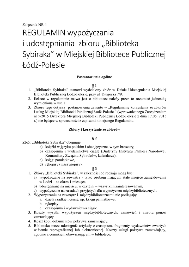 Załącznik NR 4 REGULAMIN wypożyczania i udostępniania zbioru „Biblioteka Sybiraka” w Miejskiej Bibliotece Publicznej Łódź-Polesie Postanowienia ogólne §1 1. „Biblioteka Sybiraka” stanowi wydzielony zbiór w Dziale Udostępniania Miejskiej Biblioteki Publicznej Łódź-Polesie, przy ul. Długosza 7/9. 2. Ilekroć w regulaminie mowa jest o bibliotece należy przez to rozumieć jednostkę wymienioną w ust. 1. 3. Zbioru tego dotyczą postanowienia zawarte w „Regulaminie korzystania ze zbiorów i usług Miejskiej Biblioteki Publicznej Łódź-Polesie ” (wprowadzonego Zarządzeniem nr 5/2015 Dyrektora Miejskiej Biblioteki Publicznej Łódź-Polesie z dnia 17.06. 2015 r.) nie będące w sprzeczności z zapisami niniejszego Regulaminu. Zbiory i korzystanie ze zbiorów §2 Zbiór „Biblioteka Sybiraka” obejmuje: a) książki w języku polskim i obcojęzyczne, w tym broszury, b) czasopisma i wydawnictwa ciągłe (Biuletyny Instytutu Pamięci Narodowej, Komunikaty Związku Sybiraków, kalendarze), c) księgi pamiątkowe, d) rękopisy (maszynopisy). §3 1. Zbiory „Biblioteki Sybiraka”, w zależności od rodzaju mogą być: a) wypożyczane na zewnątrz - tylko osobom mającym stałe miejsce zameldowania w Łodzi – na okres 1 miesiąca, b) udostępniane na miejscu, w czytelni – wszystkim zainteresowanym, c) wypożyczane na zasadach przyjętych dla wypożyczeń międzybibliotecznych. 2. Wypożyczaniu na zewnątrz i międzybibliotecznemu nie podlegają: a. dzieła rzadkie i cenne, np. księgi pamiątkowe, b. rękopisy c. czasopisma i wydawnictwa ciągłe. 3. Koszty wysyłki wypożyczeń międzybibliotecznych, zamówień i zwrotu ponosi zamawiający. 4. Koszt kopii dokumentów pokrywa zamawiający. 5. Biblioteka może udostępnić artykuły z czasopism, fragmenty wydawnictw zwartych w formie reprograficznej lub elektronicznej. Koszty usługi pokrywa zamawiający, zgodnie z cennikiem obowiązującym w bibliotece. 6. Użytkownik ponosi odpowiedzialność materialną za wszelkie szkody powstałe z jego winy w zbiorach „Biblioteki Sybiraka”. 7. Udostępnianie i korzystanie ze zbiorów „Biblioteki Sybiraka” powinno odbywać się zgodnie z ustawą o prawie autorskim i prawach pokrewnych. Postanowienia końcowe §4 Odstępstwa od Regulaminu, w szczególności korzystanie z obiektów szczególnie cennych, wymagają zgody dyrektora biblioteki.
