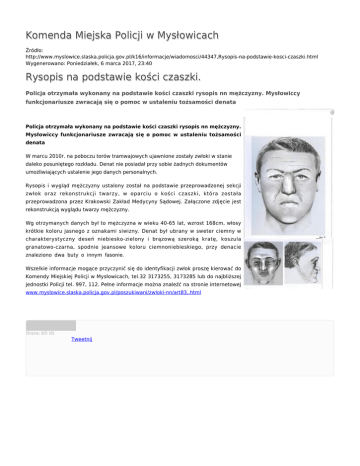 Komenda Miejska Policji w Mysłowicach Źródło: http://www.myslowice.slaska.policja.gov.pl/k16/informacje/wiadomosci/44347,Rysopis-na-podstawie-kosci-czaszki.html Wygenerowano: Poniedziałek, 6 marca 2017, 23:40 Rysopis na podstawie kości czaszki. Policja otrzymała wykonany na podstawie kości czaszki rysopis nn mężczyzny. Mysłowiccy funkcjonariusze zwracają się o pomoc w ustaleniu tożsamości denata Policja otrzymała wykonany na podstawie kości czaszki rysopis nn mężczyzny. Mysłowiccy funkcjonariusze zwracają się o pomoc w ustaleniu tożsamości denata W marcu 2010r. na poboczu torów tramwajowych ujawnione zostały zwłoki w stanie daleko posuniętego rozkładu. Denat nie posiadał przy sobie żadnych dokumentów umożliwiających ustalenie jego danych personalnych. Rysopis i wygląd mężczyzny ustalony został na podstawie przeprowadzonej sekcji zwłok oraz rekonstrukcji twarzy, w oparciu o kości czaszki, która została przeprowadzona przez Krakowski Zakład Medycyny Sądowej. Załączone zdjęcie jest rekonstrukcją wyglądu twarzy mężczyzny. Wg otrzymanych danych był to mężczyzna w wieku 40-65 lat, wzrost 168cm, włosy krótkie koloru jasnego z oznakami siwizny. Denat był ubrany w sweter ciemny w charakterystyczny deseń niebiesko-zielony i brązową szeroką kratę, koszula granatowo-czarna, spodnie jeansowe koloru ciemnoniebieskiego, przy denacie znaleziono dwa buty o innym fasonie. Wszelkie informacje mogące przyczynić się do identyfikacji zwłok proszę kierować do Komendy Miejskiej Policji w Mysłowicach, tel.32 3173255, 3173285 lub do najbliższej jednostki Policji tel. 997, 112. Pełne informacje można znaleźć na stronie internetowej www.myslowice.slaska.policja.gov.pl/poszukiwani/zwloki-nn/art83,.html Ocena: 0/5 (0) Tweetnij