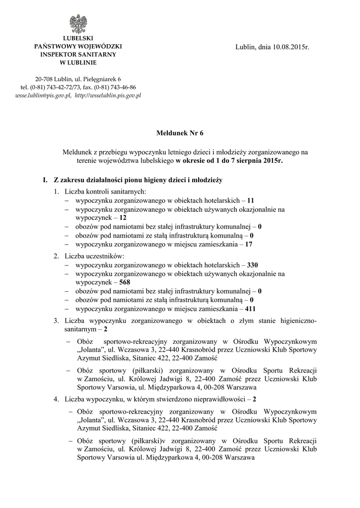 LUBELSKI PAŃSTWOWY WOJEWÓDZKI INSPEKTOR SANITARNY W LUBLINIE Lublin, dnia 10.08.2015r. 20-708 Lublin, ul. Pielęgniarek 6 tel. (0-81) 743-42-72/73, fax. (0-81) 743-46-86 [email protected], http://wsselublin.pis.gov.pl Meldunek Nr 6 Meldunek z przebiegu wypoczynku letniego dzieci i młodzieży zorganizowanego na terenie województwa lubelskiego w okresie od 1 do 7 sierpnia 2015r. I. Z zakresu działalności pionu higieny dzieci i młodzieży 1. Liczba kontroli sanitarnych: wypoczynku zorganizowanego w obiektach hotelarskich – 11 wypoczynku zorganizowanego w obiektach używanych okazjonalnie na wypoczynek – 12 obozów pod namiotami bez stałej infrastruktury komunalnej – 0 obozów pod namiotami ze stałą infrastrukturą komunalną – 0 wypoczynku zorganizowanego w miejscu zamieszkania – 17 2. Liczba uczestników: wypoczynku zorganizowanego w obiektach hotelarskich – 330 wypoczynku zorganizowanego w obiektach używanych okazjonalnie na wypoczynek – 568 obozów pod namiotami bez stałej infrastruktury komunalnej – 0 obozów pod namiotami ze stałą infrastrukturą komunalną – 0 wypoczynku zorganizowanego w miejscu zamieszkania – 411 3. Liczba wypoczynku zorganizowanego w obiektach o złym stanie higienicznosanitarnym – 2 Obóz sportowo-rekreacyjny zorganizowany w Ośrodku Wypoczynkowym „Jolanta”, ul. Wczasowa 3, 22-440 Krasnobród przez Uczniowski Klub Sportowy Azymut Siedliska, Sitaniec 422, 22-400 Zamość Obóz sportowy (piłkarski) zorganizowany w Ośrodku Sportu Rekreacji w Zamościu, ul. Królowej Jadwigi 8, 22-400 Zamość przez Uczniowski Klub Sportowy Varsowia, ul. Międzyparkowa 4, 00-208 Warszawa 4. Liczba wypoczynku, w którym stwierdzono nieprawidłowości – 2 Obóz sportowo-rekreacyjny zorganizowany w Ośrodku Wypoczynkowym „Jolanta”, ul. Wczasowa 3, 22-440 Krasnobród przez Uczniowski Klub Sportowy Azymut Siedliska, Sitaniec 422, 22-400 Zamość Obóz sportowy (piłkarski)v zorganizowany w Ośrodku Sportu Rekreacji w Zamościu, ul. Królowej Jadwigi 8, 22-400 Zamość przez Uczniowski Klub Sportowy Varsowia ul. Międzyparkowa 4, 00-208 Warszawa 5. Liczba nałożonych mandatów karnych/na sumę – 2 mandaty na kwotę 150 zł Obóz sportowo-rekreacyjny zorganizowany w Ośrodku Wypoczynkowym „Jolanta”, ul. Wczasowa 3, 22-440 Krasnobród przez Uczniowski Klub Sportowy Azymut Siedliska, Sitaniec 422, 22-400 Zamość - nałożono grzywnę w drodze mandatu karnego w wysokości 50zł za zły stan sanitarno-higieniczny pokoju: pomieszczenie utrzymane brudno, z zalegającymi nieczystościami i kurzem za tapczanami, w miejscach trudnodostępnych i na podłodze. Pokój ciasny, brak dostępu do łóżka, łóżka złączone, brak dostępu do szafy odzieżowej (zastawiona łóżkami). Kontrola sprawdzająca wykazała usunięcie stwierdzonych usterek, stan sanitarnoporządkowy zajmowanych pomieszczeń w dniu kontroli nie budził zastrzeżeń. Obóz sportowy (piłkarski)v zorganizowany w Ośrodku Sportu Rekreacji w Zamościu, ul. Królowej Jadwigi 8, 22-400 Zamość przez Uczniowski Klub Sportowy Varsowia ul. Międzyparkowa 4, 00-208 Warszawa - nałożono grzywnę w drodze mandatu karnego w wysokości 100zł za zły stan sanitarno- higieniczny pomieszczeń: w ubikacjach brudne deski sedesowe, podłoga, szczególnie za muszlami ustępowymi, w kątach zalegający kurz, włosy, nieczystości, miejscami brudne ściany; uszkodzone 2 deski sedesowe; w pokojach podłoga brudna za szafkami, w kątach, w miejscach trudnodostępnych- zalegający kurz, nieczystości, miejscami pajęczyny; w jednym pokoju nie zapewniono odstępu pomiędzy 4 tapczanami; przepełnione kosze na śmieci w pokojach, w jednym kosz połamany; w jednej łazience brak półek na przybory toaletowe i środki higieny osobistej (trzymane na podłodze). Kontrola sprawdzająca wykazała usunięcie stwierdzonych usterek, stan sanitarnoporządkowy zajmowanych pomieszczeń w dniu kontroli nie budził zastrzeżeń. 6. Liczba wydanych decyzji – 0 7. Liczba wniosków o unieruchomienie – 0 8. Liczba wypoczynku unieruchomionego – 0 9. Liczba wypoczynku nie zgłoszonego tzw. „dzikiego” – 0 Zatrucia – 0 Wykaz wypoczynku skontrolowanego w okresie od 1 do 7 sierpnia 2015r. przez Państwową Inspekcję Sanitarną I. Formy wyjazdowe 1. Organizator – Katolickie Stowarzyszenie Moria, ul. Biskupa Ignacego Świrskiego 57, 08-110 Siedlce; rekolekcje oazowe zorganizowano w Szkole Podstawowej z Oddziałami Przedszkola, ul. Warszawska 19, 21-580 Wisznice – oceniono pozytywnie 2. Organizator – MLKS Józefowia, ul. Dolna 19, 05-420 Józefów; obóz sportowy zorganizowano w Zajeździe Nadrzecze, Nadrzecze 36, 23-400 Biłgoraj – oceniono pozytywnie 3. Organizator – Klub Sportowy Lublinianka Sp. z o. o., ul. S. Leszczyńskiego 19, 20-068 Lublin; obóz sportowy zorganizowano w Szkolnym Schronisku Młodzieżowym „Sitareczka”, ul. Zamojska 2, 23-400 Biłgoraj – oceniono pozytywnie 4. Organizator – Sebastian Zima F.H.U. Pro-Swim Kryspinów 378, 32-060 Liszki; obóz rekreacyjno-sportowy zorganizowano w Centrum Szkoleniowo-Wypoczynkowym „DUO”, ul. Turystyczna 10 a, 23-300 Janów Lubelski – oceniono pozytywnie 5. Organizator – Biuro Podróży i Turystyki Almatur Lublin, ul. Langiewicza 20, 20-034 Lublin; obóz rekreacyjny zorganizowano w Ośrodku Wypoczynkowym Almatur Lucjan Bukryj, ul. Turystyczna 10E, 23-300 Janów Lubelski – oceniono pozytywnie 6. Organizator – Biuro Turystyki Przyrodniczej „PERKOZ”, ul. Rynek 14, 20-111 Lublin; kolonię zorganizowano w Ośrodku Jeździeckim „KARINO”, ul. Turystyczna 2, 23-300 Janów Lubelski – oceniono pozytywnie 7. Organizator – Biuro Turystyki Przyrodniczej „PERKOZ”, ul. Rynek 14, 20-111 Lublin; kolonię zorganizowano w Ośrodku Edukacji Ekologicznej przy Nadleśnictwie, ul. Bohaterów Porytowego Wzgórza 35 H, 23-300 Janów Lubelski – oceniono pozytywnie 8. Organizator – Oddział Wojewódzki Związku Ochotniczych Straży Poż