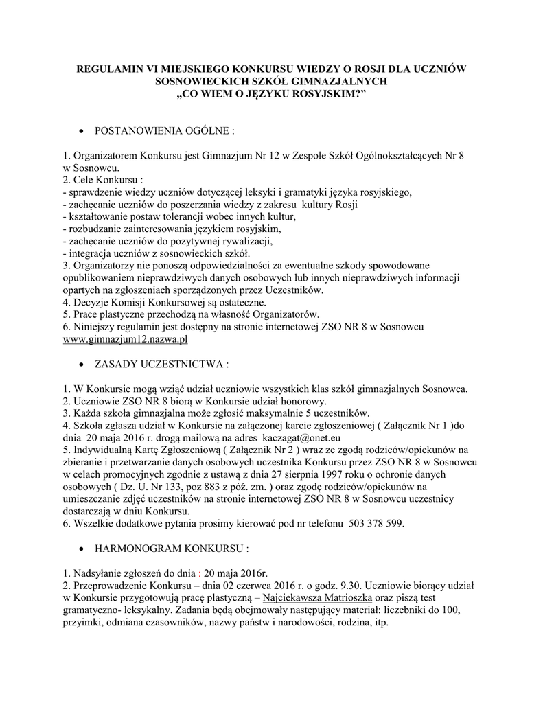 REGULAMIN VI MIEJSKIEGO KONKURSU WIEDZY O ROSJI DLA UCZNIÓW SOSNOWIECKICH SZKÓŁ GIMNAZJALNYCH „CO WIEM O JĘZYKU ROSYJSKIM?” POSTANOWIENIA OGÓLNE : 1. Organizatorem Konkursu jest Gimnazjum Nr 12 w Zespole Szkół Ogólnokształcących Nr 8 w Sosnowcu. 2. Cele Konkursu : - sprawdzenie wiedzy uczniów dotyczącej leksyki i gramatyki języka rosyjskiego, - zachęcanie uczniów do poszerzania wiedzy z zakresu kultury Rosji - kształtowanie postaw tolerancji wobec innych kultur, - rozbudzanie zainteresowania językiem rosyjskim, - zachęcanie uczniów do pozytywnej rywalizacji, - integracja uczniów z sosnowieckich szkół. 3. Organizatorzy nie ponoszą odpowiedzialności za ewentualne szkody spowodowane opublikowaniem nieprawdziwych danych osobowych lub innych nieprawdziwych informacji opartych na zgłoszeniach sporządzonych przez Uczestników. 4. Decyzje Komisji Konkursowej są ostateczne. 5. Prace plastyczne przechodzą na własność Organizatorów. 6. Niniejszy regulamin jest dostępny na stronie internetowej ZSO NR 8 w Sosnowcu www.gimnazjum12.nazwa.pl ZASADY UCZESTNICTWA : 1. W Konkursie mogą wziąć udział uczniowie wszystkich klas szkół gimnazjalnych Sosnowca. 2. Uczniowie ZSO NR 8 biorą w Konkursie udział honorowy. 3. Każda szkoła gimnazjalna może zgłosić maksymalnie 5 uczestników. 4. Szkoła zgłasza udział w Konkursie na załączonej karcie zgłoszeniowej ( Załącznik Nr 1 )do dnia 20 maja 2016 r. drogą mailową na adres [email protected] 5. Indywidualną Kartę Zgłoszeniową ( Załącznik Nr 2 ) wraz ze zgodą rodziców/opiekunów na zbieranie i przetwarzanie danych osobowych uczestnika Konkursu przez ZSO NR 8 w Sosnowcu w celach promocyjnych zgodnie z ustawą z dnia 27 sierpnia 1997 roku o ochronie danych osobowych ( Dz. U. Nr 133, poz 883 z póź. zm. ) oraz zgodę rodziców/opiekunów na umieszczanie zdjęć uczestników na stronie internetowej ZSO NR 8 w Sosnowcu uczestnicy dostarczają w dniu Konkursu. 6. Wszelkie dodatkowe pytania prosimy kierować pod nr telefonu 503 378 599. HARMONOGRAM KONKURSU : 1. Nadsyłanie zgłoszeń do dnia : 20 maja 2016r. 2. Przeprowadzenie Konkursu – dnia 02 czerwca 2016 r. o godz. 9.30. Uczniowie biorący udział w Konkursie przygotowują pracę plastyczną – Najciekawsza Matrioszka oraz piszą test gramatyczno- leksykalny. Zadania będą obejmowały następujący materiał: liczebniki do 100, przyimki, odmiana czasowników, nazwy państw i narodowości, rodzina, itp. Czas pracy ucznia z arkuszem będzie wynosił 60 minut. Kryteria oceny prac plastycznych to : wkład pracy, walory artystyczne, zgodność z tematyką konkursową. Technika dowolna. Prace plastyczne muszą być na odwrocie opisane – należy uwzględnić nazwisko i imię autora i opiekuna, nazwę i adres szkoły. Prace plastyczne uczniowie dostarczają w dniu Konkursu. KRYTERIA OCENY : 1.Prace konkursowe będą oceniane przez Komisję Konkursową w składzie : Barbara Bubik Cieślik, Agata Kaczyńska 2. Za pracę plastyczną można uzyskać 5 punktów. 3. Za test można uzyskać punktów 100. 4. Ostatecznym wynikiem ucznia będzie suma punktów przyznanych za pracę plastyczną i test. NAGRODY I WYRÓŻNIENIA : 1. Dla laureatów Konkursu ( I – III ) miejsce przewidziano nagrody i dyplomy. 2. Wszyscy uczestnicy otrzymają dyplomy uczestnictwa. 3. Wszyscy nauczyciele zostaną nagrodzeni Listami Gratulacyjnymi. 4. Nagrody i dyplomy zostaną dostarczone do szkół uczestników do dnia 13 czerwca 2016 r. 5. Wyniki Konkursu zostaną opublikowane na stronie internetowej ZSO NR 8 w Sosnowcu www.gimnazjum12.nazwa.pl Załącznik Nr 1 KARTA ZGŁOSZENIOWA VI MIEJSKIEGO KONKURSU O ROSJI DLA UCZNIÓW SOSNOWIECKICH SZKÓŁ GIMNAZJALNYCH „ CO WIEM O JĘZYKU ROSYJSKIM?” Imię i nazwisko ucznia, klasa : 1...................................................................................................................... 2...................................................................................................................... 3...................................................................................................................... 4...................................................................................................................... 5...................................................................................................................... Nazwa, adres i telefon szkoły : ….................................................................................................................... ….................................................................................................................... Imię i nazwisko nauczyciela : ….................................................................................................................... Załącznik Nr 2 …............................... …............ pieczątka szkoły KARTA ZGŁOSZENIOWA VI MIEJSKIEGO KONKURSU O ROSJI DLA UCZNIÓW SOSNOWIECKICH SZKÓŁ GIMNAZJALNYCH „ CO WIEM O JĘZYKU ROSYJSKIM? ” Imię i nazwisko ucznia, klasa : ........................................................................................................................ Nazwa, adres i telefon szkoły : ….................................................................................................................... ….................................................................................................................... Imię i nazwisko nauczyciela : ….................................................................................................................... …........................................................ ( pieczątka dyrektora szkoły ) …..................................................... ( podpis uczestnika Konkursu ) OŚWIADCZENIE RODZICA / OPIEKUNA Wyrażam zgodę na zbieranie i przetwarzanie danych osobowych mojego dziecka do celów związanych z jego udziałem w VI Miejskim Konkursie Wiedzy o Rosji organiz