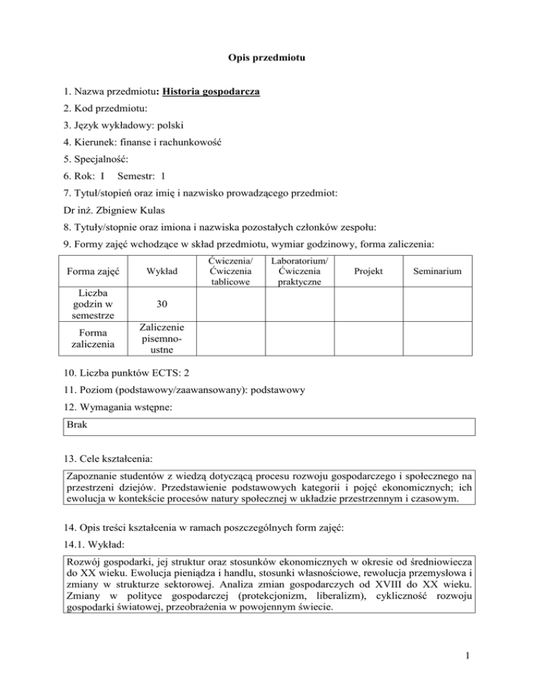 1 Opis przedmiotu 1. Nazwa przedmiotu