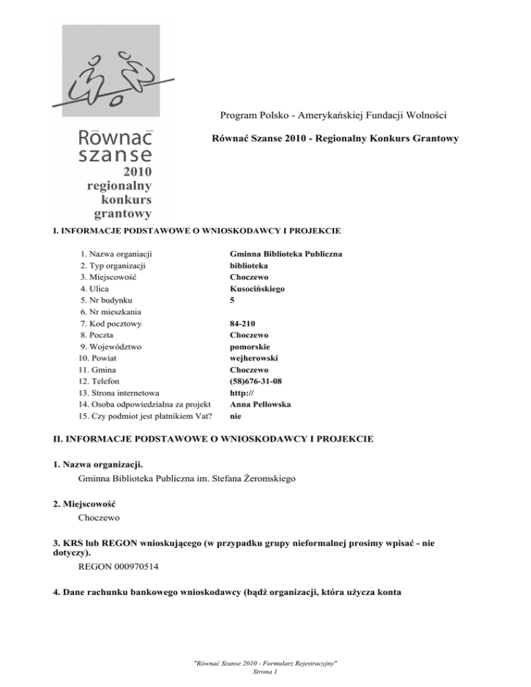 Program Polsko - Amerykańskiej Fundacji Wolności Równać Szanse 2010 - Regionalny Konkurs Grantowy 2010 regionalny konkurs grantowy I. INFORMACJE PODSTAWOWE O WNIOSKODAWCY I PROJEKCIE 1. Nazwa organiacji 2. Typ organizacji 3. Miejscowość 4. Ulica 5. Nr budynku 6. Nr mieszkania 7. Kod pocztowy 8. Poczta 9. Województwo 10. Powiat 11. Gmina 12. Telefon 13. Strona internetowa 14. Osoba odpowiedzialna za projekt 15. Czy podmiot jest płatnikiem Vat? Gminna Biblioteka Publiczna biblioteka Choczewo Kusocińskiego 5 84-210 Choczewo pomorskie wejherowski Choczewo (58)676-31-08 http:// Anna Pellowska nie II. INFORMACJE PODSTAWOWE O WNIOSKODAWCY I PROJEKCIE 1. Nazwa organizacji. Gminna Biblioteka Publiczna im. Stefana Żeromskiego 2. Miejscowość Choczewo 3. KRS lub REGON wnioskującego (w przypadku grupy nieformalnej prosimy wpisać - nie dotyczy). REGON 000970514 4. Dane rachunku bankowego wnioskodawcy (bądź organizacji, która użycza konta "Równać Szanse 2010 - Formularz Rejestracyjny" Strona 1 wnioskodawcy). - numer rachunku 03835000042601982620000010 - właściciel rachunku Gminna Biblioteka Publiczna - REGON właściciela rachunku 000970514 - nazwa banku Kaszubski Bank Spółdzielczy - adres banku ul. Pierwszych Osadników 32 84-210 Choczewo 5. Kiedy organizacja powstała. 1lipca 2000r. 6. Cele organizacji. maksymalnie 250 znaków prowadzenie działalności biblioteczno-informacyjnej,zaspokajanie i rozwijanie potrzeb czytelniczych, wspomaganie systemu edukacji i wychowania, upowszechnianie wiedzy na temat nauki i kultury. 7. Formy działań. maksymalnie 250 znaków gromadzenie i opracowywanie materiałów bibliotecznych, udostępnianie i wypożyczanie zbiorów bibliotecznych, prowadzenie działalności informacyjno - bibliograficznej, popularyzacja książki i czytelnictwa,współpraca z lokalnymi instytucjami. 8. Ilość osób zaangażowanych w prowadzenie organizacji (pracownicy etatowi, wolontariusze). maksymalnie 100 znaków trzech pracowników etatowych w tym kierownik, pracownik obsługi i księgowa 9. Kwota budżetu ogółem w 2009 roku oraz sponsorzy (proszę wymienić tylko najważniejszych). maksymalnie 200 153800zł 10. Informacje o dotacjach otrzymanych w latach 2008 - 2010 (wysokość, tytuł projektu, dotujący). maksymalnie 700 znaków 3031 zł - 2008r. dotacja Ministerialna 1539 zł - 2009r. dotacja Ministerialna 1300 zł - 2010r. dotacja Ministerialna 2213,95zł - 2010r. Fundacja "Akademia Orange dla bibliotek" na pokrycie kosztów związanych z internetem 11. Informacje o dotacjach otrzymanych od PFDiM lub ze środków PAFW w latach 2008 - 2010 (rok, wysokość, nazwa programu, tytuł projektu) maksymalnie 700 znaków "Równać Szanse 2010 - Formularz Rejestracyjny" Strona 2 brak 12. Nazwa projektu. Quo vadis 13. Koordynator - osoba odpowiedzialna za realizację projektu (tel., e-mail). Anna Pellowska [email protected] 663-495-135 14. Imię i nazwisko osoby/osób uprawnionych do podpisania umowy (tel., e-mail). Kierownik biblioteki-Beata Żuk (58)676-31-08 15. Imię i nazwisko osoby odpowiedzialnej za rozliczenie projektu (tel., e-mail). Księgowa Sabina Cicirko-Grzybek 782-964-610 16. Kwota całkowita projektu (wartość budżetu projektu). 10000zł 17. Kwota dotacji, o którą ubiega się organizacja. 7000zł III. INFORMACJA O PROJEKCIE (na co zostanie przeznaczona dotacja) 1. Nazwa projektu: Quo vadis 2. Streszczenie projektu (skrótowy opis celu projektu, jego uczestników, zaplanowanych działań i sposobu ich przeprowadzenia, spodziewanych efektów projektu oraz informacja, na co zostanie przeznaczona dotacja). maksymalnie 1600 znaków Celem projektu jest zmiana perspektywy postrzegania przez młodzież własnej podmiotowości i uświadomienie możliwości jej udziału w procesach rozwoju społecznego i indywidualnego.Uczestnikami będzie 15 osobowa grupa młodzieży (13 - 16 lat), która zbada losy absolwentów szkoły pod kątem wykształcenia, obecnie wykonywanego zajęcia oraz statusu społecznego.Samodzielnie przygotują ankiety badawcze, będą nawiązywać nowe kontakty oraz szukać źródeł informacji.Wyniki badań opracują statystycznie i przygotują prezentację multimedialną.Zaproszą do udziału w interesujące ich osoby, spotkają się z psychologiem i pedagogiem na warsztatach z zakresu orientacji zawodowej,poznają lokalnych pracodawców.Na warsztatach uczyć się będą sztuki autoprezentacji i budowania pozytywnych relacji.Podczas zajęć, spotkań z gośćmi i wyjazdu poznają tajniki pracy w wybranych zawodach -będą mieli okazję do analizy swoich mocnych i słabych stron.Zajęcia będą odbywały się raz w tygodniu (w Bibliotece, Szkole i w terenie).Następnie opracują materiał informacyjny z zakresu działań wraz z wnioskami,który zostanie opublikowany w postaci folderu i udostępniony lokalnej społeczności na święcie projektu.Młodzież podzieli się swoimi wnioskami z rówieśnikami ze szkoły, podczas fety, na którą zaprosi Wójta Gminy, swoich rozmówców oraz sponsorów.Efektem wdrożenia projektu będzie:nawiązanie i rozwój dialogu międzypokoleniowego, podniesienie umiejętności pracy w grupie i budowania pozytywnych relacji, niwelacja postawy wycofania oraz ciekawe spędzenie czasu wolnego.Dotacja umożliwi sfinansowanie działań i zakup sprzętu. 3. Liczba uczestników projektu (bezpośrednio - młodzież aktywnie uczestnicząca w większości "Równać Szanse 2010 - Formularz Rejestracyjny" Strona 3 działań projektu i pośrednio - wszystkie osoby zaangażowane lub uczestniczące w przynajmniej jednym fragmencie realizowanego projektu). maksymalnie 120 znaków Bezpośrednio - 15 osób, pośrednio - cała społeczność lokalna ok. 600 osób 4. Czas trwania projektu (od - do) 1 stycznia 2011r. - 30 czerwca 2011r. 5. Jakie konkretne potrzeby mają młodzi ludzie w waszym środowisku? (wymień 5 najważniejszych potrzeb i wskaż na jakiej podstawie je określasz). Potrzeba maksymalnie 200 znaków Potrzeba sza