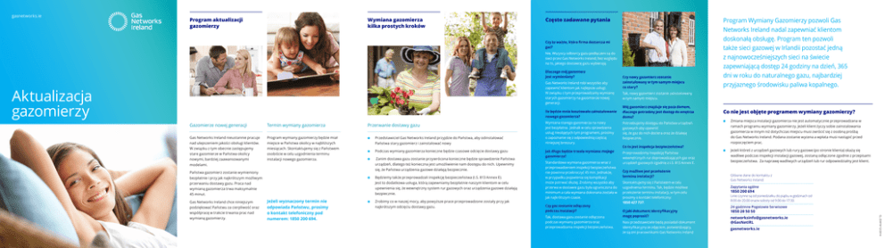 gasnetworks.ie Program aktualizacji gazomierzy Wymiana gazomierza kilka prostych kroków Często zadawane pytania Czy to ważne, która firma dostarcza mi gaz? Nie. Wszyscy odbiorcy gazu podłączeni są do sieci przez Gas Networks Ireland, bez względu na to, jakiego dostawcę gazu wybierają. Dlaczego mój gazomierz jest wymieniany? Gas Networks Ireland robi wszystko aby zapewnić klientom jak najlepsze usługi. W związku z tym przeprowadzamy wymianę starych gazomierzy na gazomierze nowej generacji. Aktualizacja gazomierzy Ile będzie mnie kosztowało zainstalowanie nowego gazomierza? Gazomierze nowej generacji Termin wymiany gazomierza Gas Networks Ireland nieustannie pracuje Program wymiany gazomierzy będzie miał nad ulepszeniem jakości obsługi klientów. miejsce w Państwa okolicy w najbliższych W związku z tym obecnie zastępujemy miesiącach. Skontaktujemy się z Państwem stare gazomierze w Państwa okolicy osobiście w celu uzgodnienia terminu nowymi, bardziej zaawansowanymi instalacji nowego gazomierza. Przerwanie dostawy gazu lPrzedstawiciel Gas Networks Ireland przyjdzie do Państwa, aby odinstalować Państwa stary gazomierz i zainstalować nowy lPodczas wymiany gazomierza konieczne będzie czasowe odcięcie dostawy gazu lZanim dostawa gazu zostanie przywrócona konieczne będzie sprawdzenie Państwa urządzeń, dlatego też konieczna jest umożliwienie nam dostępu do nich. Upewnimy modelami. się, że Państwa urządzenia gazowe działają bezpiecznie. Państwa gazomierz zostanie wymieniony lBędziemy także przeprowadzali inspekcję bezpieczeństwa (I.S. 813 Annex E). bezpłatnie i przy jak najkrótszym możliwym przerwaniu dostawy gazu. Praca nad Jest to dodatkowa usługa, którą zapewniamy bezpłatnie naszym klientom w celu wymianą gazomierza trwa maksymalnie upewnienia się, że wewnętrzny system rur gazowych oraz urządzenia gazowe działają 45 minut. bezpiecznie. Gas Networks Ireland chce niniejszym podziękować Państwu za cierpliwość oraz wymianą gazomierzy. lZrobimy co w naszej mocy, aby powyższe prace przeprowadzone zostały przy jak najkrótszym odcięciu dostawy gazu. Tak, nowy gazomierz zostanie zainstalowany w tym samym miejscu. Mój gazomierz znajduje się poza domem, dlaczego potrzebny jest dostęp do wnętrza domu? Wymiana starego gazomierza na nowy jest bezpłatna. Jednak w celu sprawdzenia usług nieobjętych tym programem, prosimy o zapoznanie się z odpowiednią częścią niniejszej broszury. Potrzebujemy dostępu do Państwa urządzeń gazowych aby upewnić się, że gaz do nich dociera oraz że działają bezpiecznie. Jak długo będzie trwała wymiana mojego gazomierza? Przeprowadzimy inspekcję Państwa wewnętrznych rur doprowadzających gaz oraz urządzeń gazowych zgodnie z I.S. 813 Annex E. Standardowa wymiana gazomierza wraz z przeprowadzeniem inspekcji bezpieczeństwa nie powinna przekroczyć 45 min. Jednakże, w przypadku pojawienia się komplikacji może potrwać dłużej. Zrobimy wszystko aby przerwa w dostawie gazu była ograniczona do minimum a cała wymiana dokonana została w jak najkrótszym czasie. Czy gaz zostanie odłączony podczas instalacji? Tak, dostawa gazu zostanie odłączona podczas wymiany gazomierza oraz przeprowadzania inspekcji bezpieczeństwa. Co to jest inspekcja bezpieczeństwa? Czy możliwe jest przełożenie terminu instalacji? Skontaktujemy się z Państwem w celu uzgodnienia terminu. Tak, będzie możliwe przełożenie terminu instalacji, w tym celu prosimy o kontakt telefoniczny: 1850 427 737. O jaki dokument identyfikacyjny mogę poprosić? Nasi przedstawiciele będą posiadali dokument identyfikacyjny ze zdjęciem, potwierdzający, że są oni pracownikami Gas Networks Ireland Co nie jest objęte programem wymiany gazomierzy? lZmiana miejsca instalacji gazomierza nie jest automatycznie przeprowadzana w ramach programu wymiany gazomierzy. Jeżeli klient życzy sobie zainstalowania gazomierza w innym niż dotychczas miejscu musi zwrócić się z osobną prośbą do Gas Networks Ireland. Podana zostanie wycena a wpłata musi nastąpić przed rozpoczęciem prac. l Jeżeli któreś z urządzeń gazowych lub rury gazowe (po stronie klienta) okażą się wadliwe podczas inspekcji instalacji gazowej, zostaną odłączone zgodnie z przepisami bezpieczeństwa. Za naprawę wadliwych urządzeń lub rur odpowiedzialny jest klient. Główne dane do kontaktu z Gas Networks Ireland: Zapytania ogólne 1850 200 694 Linie czynne są od poniedziałku do piątku w godzinach od 8:00 do 20:00 orazw soboty od 9:00 do 17:30. 24-godzinne Pogotowie Serwisowe 1850 20 50 50 [email protected] @GasNetIRL gasnetworks.ie CL 25819/12/2014 współpracę w trakcie trwania prac nad Jeżeli wyznaczony termin nie odpowiada Państwu, prosimy o kontakt telefoniczny pod numerem: 1850 200 694. Czy nowy gazomierz zostanie zainstalowany w tym samym miejscu co stary? Program Wymiany Gazomierzy pozwoli Gas Networks Ireland nadal zapewniać klientom doskonałą obsługę. Program ten pozwoli także sieci gazowej w Irlandii pozostać jedną z najnowocześniejszych sieci na świecie zapewniającą dostęp 24 godziny na dzień, 365 dni w roku do naturalnego gazu, najbardziej przyjaznego środowisku paliwa kopalnego.