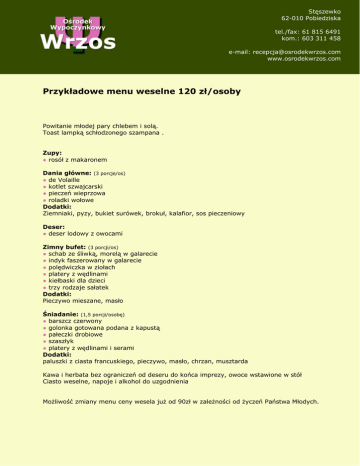 Stęszewko 62-010 Pobiedziska tel./fax: 61 815 6491 kom.: 603 311 458 e-mail: [email protected] www.osrodekwrzos.com Przykładowe menu weselne 120 zł/osoby Powitanie młodej pary chlebem i solą. Toast lampką schłodzonego szampana . Zupy: ● rosół z makaronem Dania główne: (3 porcje/os) ● de Volaille ● kotlet szwajcarski ● pieczeń wieprzowa ● roladki wołowe Dodatki: Ziemniaki, pyzy, bukiet surówek, brokuł, kalafior, sos pieczeniowy Deser: ● deser lodowy z owocami Zimny bufet: (3 porcji/os) ● schab ze śliwką, morelą w galarecie ● indyk faszerowany w galarecie ● polędwiczka w ziołach ● platery z wędlinami ● kiełbaski dla dzieci ● trzy rodzaje sałatek Dodatki: Pieczywo mieszane, masło Śniadanie: (1,5 porcji/osobę) ● barszcz czerwony ● golonka gotowana podana z kapustą ● pałeczki drobiowe ● szaszłyk ● platery z wędlinami i serami Dodatki: paluszki z ciasta francuskiego, pieczywo, masło, chrzan, musztarda Kawa i herbata bez ograniczeń od deseru do końca imprezy, owoce wstawione w stół Ciasto weselne, napoje i alkohol do uzgodnienia Możliwość zmiany menu ceny wesela już od 90zł w zależności od życzeń Państwa Młodych.
