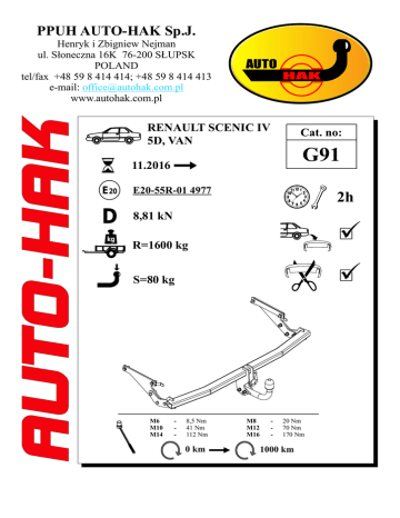 PPUH AUTO-HAK Sp.J. Henryk i Zbigniew Nejman ul. Słoneczna 16K 76-200 SŁUPSK POLAND tel/fax +48 59 8 414 414; +48 59 8 414 413 e-mail: [email protected] www.autohak.com.pl AUTO HAK RENAULT SCENIC IV 5D, VAN G91 11.2016 E20 E20-55R-01 4977 D 8,81 kN kg 2h R=1600 kg S=80 kg M6 M10 M14 - 8,5 Nm 41 Nm 112 Nm 0 km M8 M12 M16 - 20 Nm 70 Nm 170 Nm 1000 km OD PRODUCENTA: PL Dziękujemy za wybór produkowanego przez naszą firmę zaczepu kulowego. Jego niezawodność została potwierdzona licznymi testami oraz opiniami zadowolonych klientów. Jednakże niezawodność zaczepów kulowych jest zależna również od prawidłowego montażu oraz prawidłowej eksploatacji. Z tego powodu prosimy Państwa o staranne przeczytanie niniejszej instrukcji montażu oraz przestrzeganie właściwych wskazówek. Zaczep należy zamontować w miejscach do tego celu przeznaczonych przez producenta samochodu. FROM MANUFACTURER: GB Thank you for buying our product. Their reliability has been confirmed in many tests. Reliability of towbar depends also on correct assembly and right operation. For this reasons we kindly ask to read carefully this instruction and apply to hints. The towbar should be install in points described by a car producer. VON DEM HERSTELLER: D F Die Zuverlässigkeit der Anhängekupplung ist jedoch auch von der ordnungsgemäßen Montage und der richtigen Nutzung abhängig. Daher werden Sie gebeten, sorgfältig die folgende Montageanleitung zu lesen und sich an die entsprechenden Anweisungen zu halten. Die Anhängekupplung muss an den vom Fahrzeughersteller vorgeschriebenen Befestigungsstellen montiert werden. DE LA PART DU FABRICANT: Merci d'avoir choisi le dispositif d'attelage aÌ boule produit par notre societ́e.́ Sa fiabilite´a et́e´confirmeé par de nombreux tests et a travers l'opinion des clients satisfaits. Toutefois, la fiabilite´des dispositifs d'attelage a`boule deṕend également d'une installation et d'une utilisation correcte. Pour cette raison, nous vous demandons de lire attentivement cette instruction de montage et d'en respecter les consignes. Le dispositif d'attelage a`boule doit et^re monte´dans des emplacements prev́us a cet effet par le fabricant de voiture. FRA PRODUCENTEN: DK Tak fordi De har valgt vores anhængertræk. Dets pålidelighed er blevet bekræftet i mange undersøgelser samt af tilfredse kunder. Vores anhængertræks pålidelighed er også afhængig af korrekt montering og korrekt betjening. Af denne grund beder vi Dem at læse denne instruktion grundigt og overholde de korrekte anvisninger. DE PRODUCTOR: E Gracias por la elección del enganche de bola producido por nuestra empresa. Su fiabilidad fue confirmada por numerosos testos y opiniones de los clientes quienes estuvieron contentos. Sin embargo la fiabilidad de enganche de bola depende también de un montaje adecuado y su explotación adecuada. Por esa causa por favor leer atentamente la instrucción del montaje y observar adecuadas indicadoras. VAN DE FABRIKANT: NL Bedankt voor de aanschaf van onze kogeltrekhaak. Hoe betrouwbaar die is blijkt wel uit vele tests en meningen van tevreden klanten. Toch is de betrouwbaarheid van een kogeltrekhaak er mede van afhankelijk dat deze correct gemonteerd is en op de juiste manier wordt gebruikt. Daarom wordt u verzocht deze montagehandleiding zorgvuldig te lezen en de aanwijzingen te volgen. FRA PRODUSENTEN: N Takk for at dere har valgt kulefestet produsert av vårt firma. Driftssikkerheten på kulefestet har blitt bekreftet av flere tester og tilbakemeldinger fra fornøyde kunder. Allikevel er driftssikkerheten også avhengig av en korrekt montering og riktig bruk. Derfor ber vi dere om å lese denne monteringsinstruksen nøye og anbefaler at dere følger veiledningen. ETT BUDSKAP FRÅN TILLVERKAREN: S Vi skulle vilja tacka er för ert val och inköp. Våra dragkrokars pålitlighet har bevisats av olika tester samt referenser från nöjda kunder. Man får inte glömma att dragkrokars pålitlighet beror också på rätt installation och rätt bruk. Därför skulle vi vilja be att ni läser noga denna installationsanvisning och följer alla regler och tips som den anger. Dragkroken ska installeras i ett ställe som blivit påpekade av biltillverkaren. DAL FABBRICANTE: IT -2- Vi ringraziamo per aver scelto il gancio di traino a sfera prodotto dalla nostra azienda. La sua affidabilità è stata confermata da numerosi test e dalle opinioni positive dei clienti. Tuttavia, il perfetto funzionamento dei ganci di traino a sfera dipende anche dalla correttezza del montaggio e dall'utilizzo appropriato. Per questo motivo, Vi preghiamo di leggere attentamente le presenti istruzioni di montaggio e di attenervi alle indicazioni in esse contenute. Il gancio di traino deve essere montato nei punti predisposti a tal fine dal fabbricante del veicolo. PL GB D F A-A DK E NL The clearance specified in appendix VII, diagram 25a/b of Regulation No. 55.01 UN EU must be guaranteed at laden weight of the vehicle. Der Freiraum nach Anhang VII, Abbildung 25a/b der Vorschriften 55.01 EG ist zu gewährleistenbei zulässigem Gesamtgewichtdes Fahrzeuges. L’espace libre doit etre garanti conformément a l’annexe VII, illustration 25a/b de la reglements 55.01 CE pour un poids total en charge autorisé du véhicule. I overensstemmelse med bilag VII, figur 25a/b til forordninger 55.01 EF for køretøjets tilladte totalvægt skal der garanteres en friplads. Hay que garantizar un espacio suelto según archivo adjunto VII, ilustración 25a/b regulaciones 55.01 UN EU de peso admisible y total del vehículo. De in bijlage VII afbeelding 25a/b vanreglement 55.01 UN EU gespecificeerde vrije ruimte moet bij een maximale gewichtsbelasting van het voertuig gegarandeerd zijn. N Det skal sørges for fritt rom ifølge vedlegget VII, illustrasjon 25a/b forskrifter 55.01 UN EU ved den tillatte totale vekten av fartøyet. S Man ska garantera ett fritt tillgängligt utrymme - se bilaga VII, diagram 25a/b 