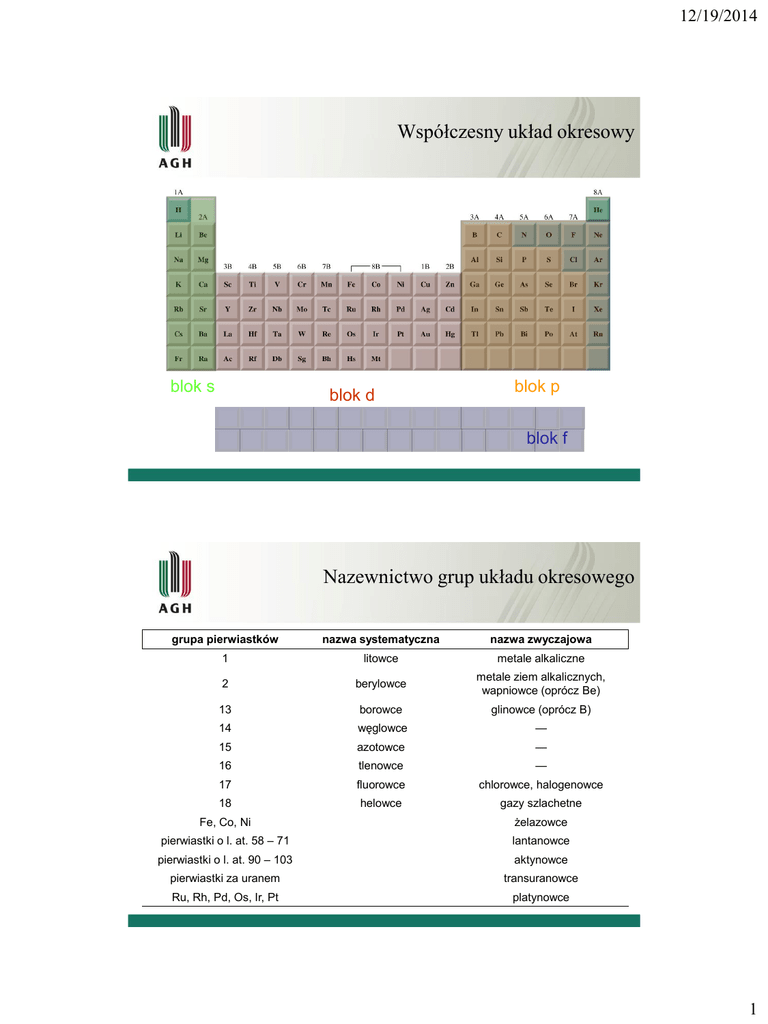 12/19/2014 Współczesny układ okresowy blok s blok d blok p blok f Nazewnictwo grup układu okresowego grupa pierwiastków nazwa systematyczna 1 litowce metale alkaliczne berylowce metale ziem alkalicznych, wapniowce (oprócz Be) 13 borowce glinowce (oprócz B) 14 węglowce — 15 azotowce — 16 tlenowce — 17 fluorowce chlorowce, halogenowce 18 helowce gazy szlachetne 2 nazwa zwyczajowa Fe, Co, Ni żelazowce pierwiastki o l. at. 58 – 71 lantanowce pierwiastki o l. at. 90 – 103 aktynowce pierwiastki za uranem transuranowce Ru, Rh, Pd, Os, Ir, Pt platynowce 1 12/19/2014 Rozpowszechnienie we wszechświecie i skorupie ziemskiej He H inne S Ar Ni Ca Al. Na Cr inne Rozpowszechnienie na Ziemi 2 12/19/2014 Rozpowszechnienie w organizmie ludzkim Wodór Symbol Liczba atomowa Nazwa Izotopy Masa atomowa [u] Stan skupienia Charakter chemiczny Blok energetyczny Elektroujemność (wg Paulinga) Wartościowość Konfiguracja elektronowa Potencjał elektrodowy (w 25 °C) [V] Energia jonizacji [kJ/mol] Gęstość (w 25 °C) [g/cm3] Temperatura topnienia [°C] Temperatura wrzenia (p=1atm) [°C] H 1 wodór 1H, 2H, 3H 1,00079 u gaz niemetal s 2,1 I 1s1 0,000(+1/0) 1312 0,071 -259,32 -252,88 3 12/19/2014 Za „wytwórcę” wodoru uchodzi lekarz i przyrodnik T. von Hohenheim (znany także jako T. Paracelsus). Prowadząc eksperymenty polegające na wrzucaniu metali do kwasów i zbieraniu do naczyń produktów tych reakcji, działając kwasem na żelazo zauważył wydzielanie się nieznanego gazu. Ponieważ gaz ten palił się nazwał go „palnym powietrzem”. R. Boyle w 1660 r. powtórzył eksperyment, zastosował H2SO4, i stwierdził, że wydzielający się gaz przestaje się palić w rozrzedzonym powietrzu. Opisał wybuchową naturę mieszanki wodoru z powietrzem, zwanej dziś mieszaniną piorunującą, a wówczas aria tonante (z włoskiego "powietrze grzmiące”). W 1776 r. H. Cavendish wykazał, że rozważany gaz jest substancją prostą lżejszą od powietrza, a w 1781 r. udowodnił, że produktem spalania jest H2O. Nie skojarzył jednak, że jest on składnikiem wody. Substancję uznano za pierwiastek dzięki A. L. Lavoisier, prowadzącemu badania nad otrzymaniem H2O z H2 i O2. Nadał mu nazwę „hydrogene” (łac. hydrogenium — tworzący wodę). T. Paracelsus R. Boyle H. Cavendish A. L. Lavoisie Własności fizyczne został skroplony po raz pierwszy w 1883 roku przez profesorów Universytetu Jagiellońskiego: chemika Karola Olszewskiego i fizyka Zygmunta Wróblewskiego bezbarwny gaz bez zapachu i smaku, słabo rozpuszczalny w wodzie, 14,4 razy lżejszy od powietrza rozpuszcza się w metalach: palladzie, platynie, niklu, żelazie powoduje korozję wodorową (pękanie) 4 12/19/2014 Własności chemiczne w temp. pokojowej niezbyt aktywny (potencjał normalny = 0) spala się w tlenie (w temp. powyżej 720K wybuchowo): 2H2 + O2 = 2H2O w podwyższonych temperaturach silny reduktor: Fe2O3 + H2 2FeO + H2O (800K) Fe2O3 + 3H2 2Fe + 3H2O (900K) WO3 + 3H2 W + 3H2O (1500K) tlenek wolframu (VI), WO3 – nieorganiczny związek chemiczny z grupy tlenków kwasowych zawierający wolfram na VI stopniu utlenienia; cytrynowe ciało stałe; tworzy dwa hydraty: monohydrat WO3·H2O i dihydrat WO3·2H2O Gęstość: 7,16 g/cm³ Temperatura topnienia: 1 473 °C Masa molowa: 231,84 g/mol Wodorki XmHn wodorki typu soli: związki tworzące sieci jonowe (jon H–), powstają w wyniku reakcji wodoru z litowcami i berylowcami (w wyjątkiem berylu i magnezu) w podwyższonej temperaturze, w reakcji z wodą wydziela się wodór: CaH2 + H2O CaO + 2H2 wodorki kowalencyjne: H2O, H2S, HF, HCl, CH4, SiH4, NH3, PH3 wodorki metaliczne (międzywęzłowe): produkty syntezy wodoru z metalami bloków d i f, ciała stałe składające się z sieci krystalicznej z wbudowanymi w przestrzenie międzywęzłowe atomami wodoru. Połączenia te są niestechiometryczne. Przykłady: PdH0,6, TiH1,73, ZrH1,92 5 12/19/2014 Najważniejsze związki organiczne Otrzymywanie 1. w skali laboratoryjnej: w reakcji wody z aktywnymi metalami (o ujemnym potencjale normalnym): 2Na + 2H2O H2 + 2NaOH w procesie elektrolizy: K: 2H+ + 2e – H2 A: 4OH– 2H2O + O2 reakcji metali z kwasami: Zn + 2HCl ZnCl2 + H2 6 12/19/2014 2. na skalę przemysłową: konwersja metanu z parą wodną: CH4+ H2O H2 + CO2 konwersja węglowodorów z ropy naftowej z parą wodną: CxH2y+ 2xH2O (2x+y)H2 + xCO2 produkt uboczny elektrolitycznego otrzymywania NaOH z NaCl dawniej z gazu wodnego otrzymywanego przez działanie pary wodnej na rozżarzony koks: C+ H2O H2 + CO Indium Tin Oxide (ITO) – roztwór stały tlenku indu(III) i tlenku cyny(IV) Fluorine doped Tin Oxide (FTO) Propidium iodide (PI) produkcja wodoru w ogniwach - potencjał tworzy się pod wpływem promieniowania elektromagnetycznego. Spirala Pt działa jako katoda, na której wydzielany jest wodór. Warstwa tlenku metalu zanurzona w elektrolicie działa jak foto anoda i wydziela O2. Anoda jest połączona z układem solarnym poprzez grafit pełniący rolę mostka. Ponieważ tylko anoda jest w kontakcie z elektrolitem, komórka silikonowa nie ulega korozji. produkcja wodoru z wody - badania nad mikroskopijnymi katalizatorami z fosforku niklu, które zwiększają wydajność procesu wydzielania wodoru z wody; nanocząsteczki związku mają dużą powierzchnię, bliskie są kształtowi sfery, co zwiększa efektywność produkcji wodoru; udało się je osiągnąć dzięki procesom ogrzewania roztworów soli metali (Uniwersytet Penn State w USA). 7 12/19/2014 Występowanie w przyrodzie 1. najpowszechniej występujący pierwiastek we Wszechświecie: pył gwiezdny (96% wszystkich atomów) reakcje termojądrowe wodoru do helu (temp. > 10 000 000K) są głównym źródłem energii gwiazd 2. na Ziemi 0,87% mas (15,4% atomów): w stanie związanym: woda, związki organiczne, kwasy i zasady wolny wodór, H2: śladowe ilości w atmosferze (5x10–5 %obj. w pobliżu powierzchni ziemi, 0,9%obj. w górnych warstwach atmosfery) izotopy: deu