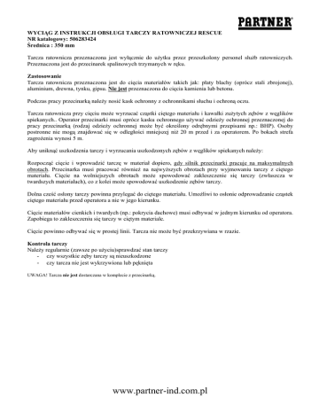 WYCIĄG Z INSTRUKCJI OBSŁUGI TARCZY RATOWNICZEJ RESCUE NR katalogowy: 506283424 Średnica : 350 mm Tarcza ratownicza przeznaczona jest wyłącznie do użytku przez przeszkolony personel służb ratowniczych. Przeznaczona jest do przecinarek spalinowych trzymanych w ręku. Zastosowanie Tarcza ratownicza przeznaczona jest do cięcia materiałów takich jak: płaty blachy (oprócz stali zbrojonej), aluminium, drewna, tynku, gipsu. Nie jest przeznaczona do cięcia kamienia lub betonu. Podczas pracy przecinarką należy nosić kask ochronny z ochronnikami słuchu i ochroną oczu. Tarcza ratownicza przy cięciu może wyrzucać cząstki ciętego materiału i kawałki zużytych zębów z węglików spiekanych.. Operator przecinarki musi oprócz kasku ochronnego używać odzieży ochronnej przeznaczonej do pracy przecinarką (rodzaj odzieży ochronnej może być określony odrębnymi przepisami np.: BHP). Osoby postronne nie mogą znajdować się w odległości mniejszej niż 20 m przed i za operatorem. Po bokach strefa zagrożenia wynosi 5 m. Aby uniknąć uszkodzenia tarczy i wyrzucania uszkodzonych zębów z węglików spiekanych należy: Rozpocząć cięcie i wprowadzić tarczę w materiał dopiero, gdy silnik przecinarki pracuje na maksymalnych obrotach. Przecinarka musi pracować również na najwyższych obrotach przy wyjmowaniu tarczy z ciętego materiału. Cięcie na wolniejszych obrotach może spowodować zakleszczenie się tarczy (zwłaszcza w twardszych materiałach), co z kolei może spowodować uszkodzenie zębów tarczy. Dolna cześć osłony tarczy powinna przylegać do ciętego materiału. Umożliwi to osłonie odprowadzanie cząstek ciętego materiału przed operatora a nie w jego kierunku. Cięcie materiałów cienkich i twardych (np.: pokrycia dachowe) musi odbywać w jednym kierunku od operatora. Zapobiega to zakleszczeniu się tarczy w ciętym materiale. Cięcie powinno odbywać się w prostej linii. Tarcza nie może być przekrzywiana w rzazie. Kontrola tarczy Należy regularnie (zawsze po użyciu)sprawdzać stan tarczy - czy wszystkie zęby tarczy są nieuszkodzone - czy tarcza nie jest wykrzywiona lub pęknięta UWAGA! Tarcza nie jest dostarczana w komplecie z przecinarką. www.partner-ind.com.pl