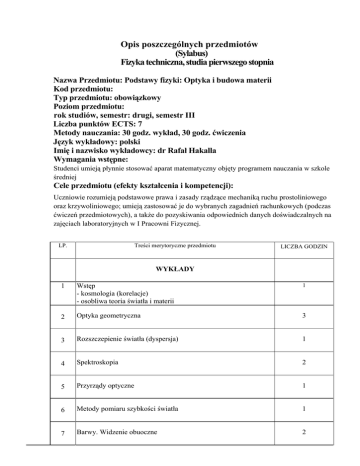 Opis poszczególnych przedmiotów (Sylabus) Fizyka techniczna, studia pierwszego stopnia Nazwa Przedmiotu: Podstawy fizyki: Optyka i budowa materii Kod przedmiotu: Typ przedmiotu: obowiązkowy Poziom przedmiotu: rok studiów, semestr: drugi, semestr III Liczba punktów ECTS: 7 Metody nauczania: 30 godz. wykład, 30 godz. ćwiczenia Język wykładowy: polski Imię i nazwisko wykładowcy: dr Rafał Hakalla Wymagania wstępne: Studenci umieją płynnie stosować aparat matematyczny objęty programem nauczania w szkole średniej Cele przedmiotu (efekty kształcenia i kompetencji): Uczniowie rozumieją podstawowe prawa i zasady rządzące mechaniką ruchu prostoliniowego oraz krzywoliniowego; umieją zastosować je do wybranych zagadnień rachunkowych (podczas ćwiczeń przedmiotowych), a także do pozyskiwania odpowiednich danych doświadczalnych na zajęciach laboratoryjnych w I Pracowni Fizycznej. LP. Treści merytoryczne przedmiotu LICZBA GODZIN WYKŁADY 1 Wstęp - kosmologia (korelacje) - osobliwa teoria światła i materii 1 2 Optyka geometryczna 3 3 Rozszczepienie światła (dyspersja) 1 4 Spektroskopia 2 5 Przyrządy optyczne 1 6 Metody pomiaru szybkości światła 1 7 Barwy. Widzenie obuoczne 2 8 Interferencja światła 1 9 Dyfrakcja światła 2 10 Polaryzacja światła 2 11 Promieniowanie termiczne 2 12 Fotometria 2 13 Światło, a fizyka kwantowa; fale i cząstki 2 14 Optyczne zjawiska atmosferyczne 2 15 Korpuskularno – falowa budowa materii 1 16 Równanie Schrodingera, funkcje stanu, operatorowe ujęcie mechaniki kwantowej Widma atomowe i cząsteczkowe, masery i lasery 1 Własności jąder atomowych - promieniotwórczość naturalna - siły, modele i reakcje jądrowe - reakcje rozszczepienia i syntezy - cząstki elementarne Ewolucja Wszechświata 2 17 18 19 1 11 Razem 30 ĆWICZENIA 1 Optyka geometryczna 8 2 Dyspersja światła 3 3 Spektroskopia 3 4 Przyrządy optyczne 2 5 Interferencja światła 3 6 Dyfrakcja światła 3 7 Polaryzacja światła 2 8 Fotometria 2 9 Kolokwia zaliczeniowe 4 30 Razem Metody oceny: Ćwiczenia: warunkiem zaliczenia ćwiczeń jest zaliczenie kolokwiów cząstkowych następujących działów: 1. Optyka geometryczna. 2. Optyka falowa 3. Budowa materii Termin i zakres kolokwiów oraz kolokwiów poprawkowych ustala prowadzący ćwiczenia. Egzamin: 1. Do egzaminu można przystąpić po zaliczeniu ćwiczeń oraz I Pracowni Fizycznej. Egzamin ma formę pisemną. Spis zalecanych lektur: Sz. Szczeniowski „Fizyka doświadczalna”, cz.IV R. Resnick, D. Halliday „Fizyka”, tom II J. R. Meyer – Arendt „Wstęp do optyki” R. P. Feynman, R. B. Leighton, M. Sands, Feynmana wykłady z fizyki, t.2, 3, PWN B. Jaworski, A. Piński, elementy fizyki t.2, PWN M. Skorko, Fizyka, PWN J. Orear, Fizyka t.2, WNT Przykładowe zbiory zadań : A.G. Grammakow (red.), Zadania z optyki i fizyki atomowej A. N. Kuncenko, J. W. Rublew, Zbiór zadań z fizyki M. S. Cedrik (red.), Zadania z fizyki J. Araminowicz, Zbiór zadań z fizyki J. Jędrzejowski, W. Kruczek, A. Kujawski, Zbiór zadań z fizyki A. Hennel, W. Szuszkiewicz, Zadania i problemy z fizyki, t.1 Z. Kalisz, M. Massalska, J. M. Massalski, Zbiór zadań z fizyki z rozwiązaniami /podpis prowadzącego/ /podpis Kierownika Zakładu/