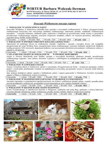 WIRTUR Barbara Walczak-Iterman 04-470 Warszawa, ul. Marsa 130 lok. IV, tel. 22 673 48 58, faks 22 465 14 31 Konto: 50102055581111105240600043 www.wirtur.pl ; [email protected] Zwyczaje Wielkanocne naszego regionu 1. WIELKANOC W LEŚNICZÓWCE PARYŻ niezwykła Wielkanoc w leśniczówce pośrodku lasu: gawęda o zwyczajach wielkanocnych w Polsce, przygotowywanie wielkanocnego koszyczka oraz uroczystego śniadania wielkanocnego: malowanie pisanek, ozdabianie wielkanocnych mazurków – warsztaty kulinarne, zdobienie palm, wędrówka z leśnikiem na poszukiwanie oznak wiosny w przyrodzie: poszukiwanie wielkanocnego zajączka, uroczyste świąteczne śniadanie, zabawy na świeżym powietrzu, odwiedziny w zagrodzie (kozy, króliki, koniki polskie) Cena/osoba 1 dzień 20 osób - 96zł 30 osób - 72zł 40 osób - 68zł 45 osób - 64zł 2. WIELKANOC W DWORZE STRZYŻEW KOŁO ŻELAZOWEJ WOLI zaproszenie do polskiego dworu na wielkanocne obrzędy: wędrówka i gawęda z zarządcą dworu: jak wyglądały przygotowania do świąt Wielkiej Nocy, przygotowanie kosza wielkanocnego, warsztaty kulinarne miodowych słodkości według przepisów XIX wiecznych, degustacja słodkości oraz poczęstunek dworskimi przysmakami, wielkanocne zabawy z jajkami w roli głównej Cena/osoba 1 dzień 20 osób - 119zł 30 osób - 97zł 40 osób - 74zł 45 osób - 69zł 3. SZLACHECKIE TRADYCJE WIELKANOCNE W DWORZE MOŚCIBRODY wizyta w Dworze Mościbrody koło Siedlec: gawęda o zwyczajach dworskich, zdobienie pisanek, poszukiwanie wielkanocnego zajączka i inne zabawy dworskie, wyprawa z ornitologiem na podglądanie ptaków, piknik w dworskich plenerach Cena/osoba 1 dzień 20 osób - 114zł 30 osób - 84zł 40 osób - 78zł 45 osób - 72zł 4. WIELKANOC W ŁOWICKIEJ CHACIE wizyta w łowickiej chacie w Nieborowie, udział w warsztatach „Przygotowania do Świąt – świąteczne sprzątanie, wielkie pranie”, wyrób palm, przebieranki i konkurs na najładniejszą Łowiczankę, poczęstunek, wizyta w muzeum sztuki ludowej w Sromowie Inne atrakcje dodatkowo płatne: ognisko z kiełbaskami, pokaz i zajęcia garncarskie w Bolimowie, łowickie wycinanki, zajęcia w Pałacu w Nieborowie, wizyta w Łowiczu. Cena/osoba 1 dzień 20 osób - 108zł 30 osób - 92zł 40 osób - 82zł 45 osób - 77zł 5. WIELKANOC W MAZOWIECKIM ZAŚCIANKU W GRABOWIE ZA WOŁOMINEM warsztaty regionalne w gospodarstwie agroturystycznym, do wyboru: wielkanocne pisanki, palmy, wypieki, ponadto pokaz starych przedmiotów użytkowych, przejażdżka wozem traperskim po lesie, ognisko (kiełbaski własne) Cena/osoba 1 dzień 20 osób - 125zł 30 osób - 103zł 40 osób - 95zł 45 osób - 89zł 6. WIELKANOC W KRAINIE BAJEK I BAŚNI MAZOWSZA Lustro Twardowskiego w zabytkowym kościele w Węgrowie, wędrówka nad rzekę Bug, spotkanie z twórcą ludowym, warsztaty plastyki obrzędowej: palmy wielkanocne, pisanki, kwiaty z bibuły, obiad w świątecznym nastroju 1 dzień 20 osób - 118zł 30 osób - 90zł 40 osób - 85zł Cena/osoba 45 osób - 80zł
