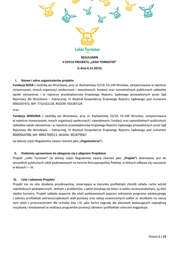 REGULAMIN V EDYCJI PROJEKTU „LEKKI TORNISTER” (z dnia 6.12.2015) I. Nazwa i adres organizatorów projektu Fundacja ROSA z siedzibą we Wrocławiu, przy ul. Racławickiej 15/19, 53-149 Wrocław, zarejestrowana w rejestrze stowarzyszeń, innych organizacji społecznych i zawodowych, fundacji oraz samodzielnych publicznych zakładów opieki zdrowotnej i w rejestrze przedsiębiorców Krajowego Rejestru Sądowego prowadzonych przez Sąd Rejonowy dla Wrocławia – Fabrycznej, VI Wydział Gospodarczy Krajowego Rejestru Sądowego pod numerem 0000207472, NIP: 7732322126, REGON: 592287129 oraz Fundacja SENSORIA z siedzibą we Wrocławiu, przy ul. Racławickiej 15/19, 53-149 Wrocław, zarejestrowana w rejestrze stowarzyszeń, innych organizacji społecznych i zawodowych, fundacji oraz samodzielnych publicznych zakładów opieki zdrowotnej i w rejestrze przedsiębiorców Krajowego Rejestru Sądowego prowadzonych przez Sąd Rejonowy dla Wrocławia – Fabrycznej, VI Wydział Gospodarczy Krajowego Rejestru Sądowego pod numerem 0000564708, NIP: 8992769511, REGON: 361879567 (w dalszej części Regulaminu zwane również jako „Organizatorzy”). II. Podmioty uprawnione do ubiegania się o objęciem Projektem Projekt „Lekki Tornister” (w dalszej części Regulaminu zwany również jako „Projekt”) skierowany jest do wszystkich publicznych szkół podstawowych na terenie Rzeczypospolitej Polskiej, w których odbywa się nauczanie w klasach I – III. III. Cele i założenia Projektu Projekt ma na celu działania prozdrowotne, zmierzające w kierunku profilaktyki chorób układu ruchu wśród najmłodszych podopiecznych. Jednym z problemów, z jakim borykają się dzieci w wieku wczesnoszkolnym, są zbyt ciężkie tornistry. Projekt zakłada wsparcie dla szkół podstawowych poprzez wdrożenie programu edukacyjnego z zakresu profilaktyki pierwszorzędowych wad postawy oraz zakup nowoczesnych szafek ze skrytkami na rzeczy tych szkół z przeznaczeniem dla uczniów klas I-III, jako forma nagrody dla placówek wykazujących największą inicjatywę i kreatywność w realizacji programów promocji zdrowia i profilaktyki schorzeń kręgosłupa. Strona 1 z 15 IV. 1. 2. 3. 4. 5. 6. Procedura ubiegania się o wsparcie w ramach Projektu Organizatorzy skierują do wybranych szkół podstawowych informacje o Projekcie na podstawie uzyskanych od podmiotów trzecich informacji o zainteresowaniu przystąpieniem do Projektu przez konkretne szkoły podstawowe, opinii podopiecznych czy wniosków rodziców i opiekunów prawnych uczniów szkół podstawowych z klas I – III oraz samych szkół podstawowych. Projekt ma zasięg ogólnopolski. W Projekcie może wziąć udział szkoła publiczna i niepubliczna o uprawnieniach szkoły publicznej niezależnie od wielkości miejscowości w której ma siedzibę (w dalszej części Regulaminu szkoła ubiegająca się o udział w Projekcie zwana będzie „Wnioskodawcą”). W celu ubiegania się o udział w Projekcie należy za pośrednictwem www.rekrutacja.lekkitornister.org pobrać formularz zgłoszeniowy do Projektu (dalej jako „Formularz Zgłoszeniowy”), wypełnić go przez osobę upoważnioną do reprezentowania Wnioskodawcy, zeskanować i odesłać na wskazany w regulaminie adres e-mail w terminie określonym w regulaminie. Formularz Zgłoszeniowy stanowi załącznik nr 1 do niniejszego Regulaminu. Wysyłając Formularz Zgłoszenia Wnioskodawca jednocześnie oświadcza, że zapoznał się z niniejszym Regulaminem i akceptuje zasady w nim wyrażone. Formularz Zgłoszeniowy Wnioskodawca przesyła w formie wiadomości e-mail, wysłanej przez osobę upoważnioną do działania w imieniu Wnioskodawcy, na adres [email protected] do 21.02.2016 r. Organizatorzy dokonają wyboru i kwalifikacji Wnioskodawcy do bieżącej edycji Projektu spośród Wnioskodawców, którzy w terminie określonym w pkt. 5 powyżej przesłali prawidłowo wypełnione Formularze Zgłoszeniowe. Wybór Wnioskodawców zostanie dokonany na podstawie kolejności wpływu Formularzy Zgłoszeniowych, z zastrzeżeniem, że maksymalny limit wynosi 1000 szkół. 7. Wnioskodawcy zostaną poinformowani o zakwalifikowaniu do Projektu w formie wiadomości e-mail na adres wskazany w Formularzu Zgłoszeniowym w terminie do 2 tygodni od dnia zakończenia rekrutacji (w dalszej części Regulaminu Wnioskodawca zakwalifikowany do udziału w Projekcie zwany będzie „Uczestnikiem”). 8. Następnym etapem Projektu będzie przygotowanie przez Organizatorów i wysyłka opracowanych materiałów dydaktycznych do Uczestników V edycji Projektu, na które składają się (dalej jako „Pakiet Materiałów”): a) karty edukacyjne w ilości zależnej od liczby uczniów w klasach od I – III, z zastrzeżeniem maksymalnego limitu dla jednej szkoły w wysokości 100 sztuk; b) jeden przewodnik dydaktyczny dla nauczycieli; c) jeden plakat edukacyjny; d) jedną płytę CD ze słuchowiskiem o Projekcie Lekki Tornister. Strona 2 z 15 9. W razie gdy u danego Uczestnika do klas I – III uczęszcza mniejsza liczba uczniów niż wskazana w ust. 8 pkt. a) powyżej, Organizatorzy zastrzegają sobie prawo do przesłania kart edukacyjnych w liczbie stanowiącej różnicę pomiędzy liczbą uczniów a limitem określonym w ust. 8 pkt. a) dowolnie wybranym Uczestnikom. 10. W razie gdy u danego Uczestnika do klas I – III uczęszcza większa liczba uczniów niż wskazana w ust. 8 pkt. a) i nie otrzymał on dodatkowych kart zgodnie z postanowieniem ust. 9, Uczestnik jest uprawniony do zwielokrotnienia kart edukacyjnych w brakującej ilości oraz zobowiązuje się do ich wykorzystywania zgodnie z postanowieniami niniejszego Regulaminu. 11. Uczestnicy Projektu są zobowiązani po dostarczeniu materiałów, o których mowa w ust. 8, do organizacji na terenie szkoły zajęć edukacyjnych dla uczniów klas I-III (zwanych w dalszej części Regulaminu „Kampanią”). 12. Kampania obejmować będzie w szczególności przeprowadzenie w każd