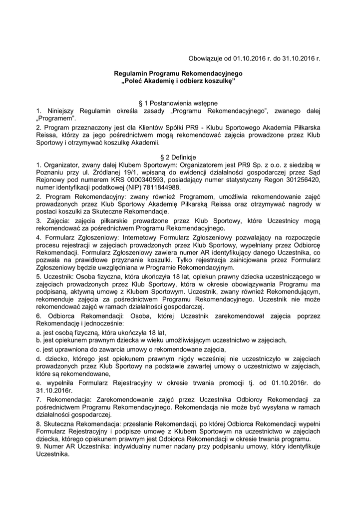 Obowiązuje od 01.10.2016 r. do 31.10.2016 r. Regulamin Programu Rekomendacyjnego „Poleć Akademię i odbierz koszulkę” § 1 Postanowienia wstępne 1. Niniejszy Regulamin określa zasady „Programu Rekomendacyjnego”, zwanego dalej „Programem”. 2. Program przeznaczony jest dla Klientów Spółki PR9 - Klubu Sportowego Akademia Piłkarska Reissa, którzy za jego pośrednictwem mogą rekomendować zajęcia prowadzone przez Klub Sportowy i otrzymywać koszulkę Akademii. § 2 Definicje 1. Organizator, zwany dalej Klubem Sportowym: Organizatorem jest PR9 Sp. z o.o. z siedzibą w Poznaniu przy ul. ródlanej 19/1, wpisaną do ewidencji działalności gospodarczej przez Sąd Rejonowy pod numerem KRS 0000340593, posiadający numer statystyczny Regon 301256420, numer identyfikacji podatkowej (NIP) 7811844988. 2. Program Rekomendacyjny: zwany również Programem, umożliwia rekomendowanie zajęć prowadzonych przez Klub Sportowy Akademię Piłkarską Reissa oraz otrzymywać nagrody w postaci koszulki za Skuteczne Rekomendacje. 3. Zajęcia: zajęcia piłkarskie prowadzone przez Klub Sportowy, które Uczestnicy mogą rekomendować za pośrednictwem Programu Rekomendacyjnego. 4. Formularz Zgłoszeniowy: Internetowy Formularz Zgłoszeniowy pozwalający na rozpoczęcie procesu rejestracji w zajęciach prowadzonych przez Klub Sportowy, wypełniany przez Odbiorcę Rekomendacji. Formularz Zgłoszeniowy zawiera numer AR identyfikujący danego Uczestnika, co pozwala na prawidłowe przyznanie koszulki. Tylko rejestracja zainicjowana przez Formularz Zgłoszeniowy będzie uwzględniana w Programie Rekomendacyjnym. 5. Uczestnik: Osoba fizyczna, która ukończyła 18 lat, opiekun prawny dziecka uczestniczącego w zajęciach prowadzonych przez Klub Sportowy, która w okresie obowiązywania Programu ma podpisaną, aktywną umowę z Klubem Sportowym. Uczestnik, zwany również Rekomendującym, rekomenduje zajęcia za pośrednictwem Programu Rekomendacyjnego. Uczestnik nie może rekomendować zajęć w ramach działalności gospodarczej. 6. Odbiorca Rekomendacji: Osoba, której Uczestnik zarekomendował zajęcia poprzez Rekomendację i jednocześnie: a. jest osobą fizyczną, która ukończyła 18 lat, b. jest opiekunem prawnym dziecka w wieku umożliwiającym uczestnictwo w zajęciach, c. jest uprawniona do zawarcia umowy o rekomendowane zajęcia, d. dziecko, którego jest opiekunem prawnym nigdy wcześniej nie uczestniczyło w zajęciach prowadzonych przez Klub Sportowy na podstawie zawartej umowy o uczestnictwo w zajęciach, które są rekomendowane, e. wypełniła Formularz Rejestracyjny w okresie trwania promocji tj. od 01.10.2016r. do 31.10.2016r. 7. Rekomendacja: Zarekomendowanie zajęć przez Uczestnika Odbiorcy Rekomendacji za pośrednictwem Programu Rekomendacyjnego. Rekomendacja nie może być wysyłana w ramach działalności gospodarczej. 8. Skuteczna Rekomendacja: przesłanie Rekomendacji, po której Odbiorca Rekomendacji wypełni Formularz Rejestracyjny i podpisze umowę z Klubem Sportowym na uczestnictwo w zajęciach dziecka, którego opiekunem prawnym jest Odbiorca Rekomendacji w okresie trwania programu. 9. Numer AR Uczestnika: indywidualny numer nadany przy podpisaniu umowy, który identyfikuje Uczestnika. § 3 Warunki uczestnictwa 1. Program jest przeznaczony dla osób fizycznych, które ukończyły 18 lat i spełniają łącznie poniższe warunki: a. są opiekunem prawnym dziecka, które uczestniczy w zajęciach prowadzonych przez Klub Sportowy, b. w okresie obowiązywania Programu mają podpisaną i aktywną umowę z Klubem Sportowym, c. będą rekomendowały Produkty Odbiorcom Rekomendacji, zgodnie z zasadami zawartymi w niniejszym Regulaminie. § 4 Zasady Programu 1. Program polega na przesyłaniu Rekomendacji przez Uczestników do Odbiorców Rekomendacji w celu Skutecznej Rekomendacji, za co będą przyznawane nagrody w postaci koszulki Akademii. 2. Tylko Formularze Rejestracyjne na Stronie Klubu Sportowego będą zliczane w Programie i za Skuteczne Rekomendacje za ich pośrednictwem będą przyznawane Premie. 3. Nagrodą za Skuteczną Rekomendację jest koszulka Akademii dla osoby, która dokonała polecenia. Po podpisaniu umowy z polecenia, zawodnik polecający otrzymuje koszulkę Akademii. 4. W przypadku Skutecznej Rekomendacji większej liczby osób w danym miesiącu, nagrody w postaci koszulki nie sumują się. 5. Aby koszulka była przyznana, Odbiorca Rekomendacji zobowiązany jest do przesłania informacji o poleceniu do koordynatora danej lokalizacji. W przypadku osób, które nie prześlą wiadomości, koszulka może zostać przyznana z opó nieniem. W treści wiadomości proszę podać imię, nazwisko, lokalizację oraz numer AR osoby polecającej. § 5 Czas trwania Programu 1. Program trwa od 01.10.2016r. do 31.10.2016r. 2. W Programie będą uwzględniane prawidłowo wypełnione i przesłane Formularze Rejestracyjne w okresie obowiązywania Programu na podstawie, których w czasie trwania Programu zostanie podpisana umowa z Odbiorcą Rekomendacji. 3. Przyznanie koszulki zarówno osobie Polecającej jak i Odbiorcy Rekomendacji następuje po miesiącu, w którym nastąpiła Skuteczna Rekomendacja, nawet w przypadku kiedy zakończył się okres obowiązywania programu. 4. Skuteczne Rekomendacje będą uwzględniane tylko w przypadku zawarcia umowy do dnia 31.10.2016 r. (decyduje data otrzymania umowy przez Klub). § 6 Prawa i obowiązki Klubu Sportowego 1. W celu właściwego przeprowadzenia Programu, w szczególności w celu komunikacji z Uczestnikami, Klub Sportowy będzie przetwarzał dane osobowe Uczestników na zasadach przewidzianych ustawą z dnia 29 sierpnia 1997 r. o ochronie danych osobowych (Źz. U. z 2002 r. Nr 101 poz. 926 z pó n. zm.). 2. W przypadku otrzymania informacji o wykorzystywaniu Programu Rekomendującego w sposób naruszający przepisy prawa lub godzący w dobre obyczaje czy powszechnie obowiązujące normy obyczajowe i społeczne, bąd wysyłani