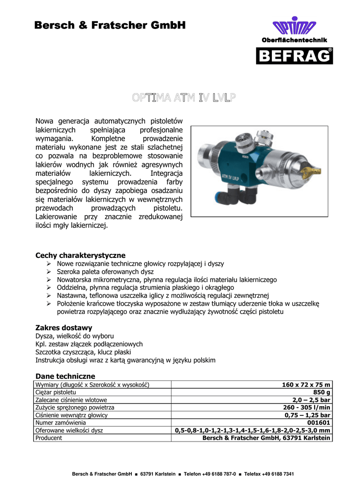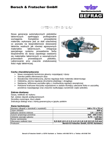 Bersch & Fratscher GmbH Oberflächentechnik ® BEFRAG Nowa generacja automatycznych pistoletów lakierniczych spełniająca profesjonalne wymagania. Kompletne prowadzenie materiału wykonane jest ze stali szlachetnej co pozwala na bezproblemowe stosowanie lakierów wodnych jak równieŜ agresywnych materiałów lakierniczych. Integracja specjalnego systemu prowadzenia farby bezpośrednio do dyszy zapobiega osadzaniu się materiałów lakierniczych w wewnętrznych przewodach prowadzących pistoletu. Lakierowanie przy znacznie zredukowanej ilości mgły lakierniczej. Cechy charakterystyczne Nowe rozwiązanie techniczne głowicy rozpylającej i dyszy Szeroka paleta oferowanych dysz Nowatorska mikrometryczna, płynna regulacja ilości materiału lakierniczego Oddzielna, płynna regulacja strumienia płaskiego i okrągłego Nastawna, teflonowa uszczelka iglicy z moŜliwością regulacji zewnętrznej PołoŜenie krańcowe tłoczyska wyposaŜone w zestaw tłumiący uderzenie tłoka w uszczelkę powietrza rozpylającego oraz znacznie wydłuŜający Ŝywotność części pistoletu Zakres dostawy Dysza, wielkość do wyboru Kpl. zestaw złączek podłączeniowych Szczotka czyszcząca, klucz płaski Instrukcja obsługi wraz z kartą gwarancyjną w języku polskim Dane techniczne Wymiary (długość x Szerokość x wysokość) CięŜar pistoletu Zalecane ciśnienie wlotowe ZuŜycie spręŜonego powietrza Ciśnienie wewnątrz głowicy Numer zamówienia Oferowane wielkości dysz Producent 160 x 72 x 75 m 850 g 2,0 – 2,5 bar 260 - 305 l/min 0,75 – 1,25 bar 001601 0,5-0,8-1,0-1,2-1,3-1,4-1,5-1,6-1,8-2,0-2,5-3,0 mm Bersch & Fratscher GmbH, 63791 Karlstein Bersch & Fratscher GmbH ■ 63791 Karlstein ■ Telefon +49 6188 787-0 ■ Telefax +49 6188 7341