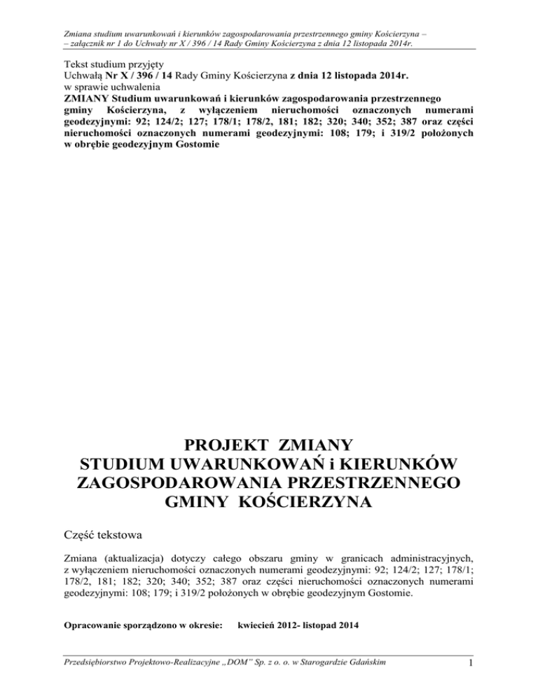 Zmiana studium uwarunkowań i kierunków zagospodarowania przestrzennego gminy Kościerzyna – – załącznik nr 1 do Uchwały nr X / 396 / 14 Rady Gminy Kościerzyna z dnia 12 listopada 2014r. Tekst studium przyjęty Uchwałą Nr X / 396 / 14 Rady Gminy Kościerzyna z dnia 12 listopada 2014r. w sprawie uchwalenia ZMIANY Studium uwarunkowań i kierunków zagospodarowania przestrzennego gminy Kościerzyna, z wyłączeniem nieruchomości oznaczonych numerami geodezyjnymi: 92; 124/2; 127; 178/1; 178/2, 181; 182; 320; 340; 352; 387 oraz części nieruchomości oznaczonych numerami geodezyjnymi: 108; 179; i 319/2 położonych w obrębie geodezyjnym Gostomie PROJEKT ZMIANY STUDIUM UWARUNKOWAŃ i KIERUNKÓW ZAGOSPODAROWANIA PRZESTRZENNEGO GMINY KOŚCIERZYNA Część tekstowa Zmiana (aktualizacja) dotyczy całego obszaru gminy w granicach administracyjnych, z wyłączeniem nieruchomości oznaczonych numerami geodezyjnymi: 92; 124/2; 127; 178/1; 178/2, 181; 182; 320; 340; 352; 387 oraz części nieruchomości oznaczonych numerami geodezyjnymi: 108; 179; i 319/2 położonych w obrębie geodezyjnym Gostomie. Opracowanie sporządzono w okresie: kwiecień 2012- listopad 2014 Przedsiębiorstwo Projektowo-Realizacyjne „DOM” Sp. z o. o. w Starogardzie Gdańskim 1 Zmiana studium uwarunkowań i kierunków zagospodarowania przestrzennego gminy Kościerzyna – – załącznik nr 1 do Uchwały nr X / 396 / 14 Rady Gminy Kościerzyna z dnia 12 listopada 2014r. Skład elaboratu STUDIUM: 1. Część tekstowa – tekst studium załącznik nr 1 do Uchwały Nr X / 396 / 14 Rady Gminy Kościerzyna z dnia 12 listopada 2014r. wraz z załącznikami do tekstu - tabelami: Załącznik do tekstu – tabela nr 1 – Zestawienie obowiązujących planów miejscowych. Załącznik do tekstu – tabela nr 2– Gminna Ewidencja Zabytków – wykaz obiektów. Załącznik do tekstu – tabela nr 3– Zestawienie terenów inwestycyjnych. 2. Część graficzna zał. graficzne od nr 2.1. do 2.7. do Uchwały Nr X / 396 / 14 Rady Gminy Kościerzyna z dnia 12 listopada 2014r. Załącznik graficzny nr 2.1. Uwarunkowania zagospodarowania przestrzennego – skala 1:10 000, Załącznik graficzny nr 2.2. Uwarunkowania infrastruktury wodno - kanalizacyjnej– skala 1:25 000, Załącznik graficzny nr 2.3. Kierunki zagospodarowania przestrzennego – docelowa struktura przestrzenna gminy – skala 1:10 000, Załącznik graficzny nr 2.4. Kierunki zagospodarowania przestrzennego – Zasady ochrony środowiska przyrodniczego, dziedzictwa kulturowego i krajobrazu – skala 1:20 000, Załącznik graficzny nr 2.5. – Kierunki rozwoju sieci infrastruktury technicznej – sieć wodno - kanalizacyjna – skala 1:25 000, Załącznik graficzny nr 2.6. Kierunki zagospodarowania przestrzennego – Kierunki rozwoju systemów komunikacji – skala 1:25 000, Załącznik graficzny nr 2.7. Kierunki zagospodarowania przestrzennego – kierunki rozwoju infrastruktury technicznej – zaopatrzenie w ciepło, gaz - skala 1:25 000, Przedsiębiorstwo Projektowo-Realizacyjne „DOM” Sp. z o. o. w Starogardzie Gdańskim 2 Zmiana studium uwarunkowań i kierunków zagospodarowania przestrzennego gminy Kościerzyna – – załącznik nr 1 do Uchwały nr X / 396 / 14 Rady Gminy Kościerzyna z dnia 12 listopada 2014r. SPIS TREŚCI WSTĘP; CZĘŚĆ OGÓLNA ........................................................................................... 7 1.1 Wstęp .......................................................................................................................... 7 1.2 Podstawa opracowania, materiały wyjściowe. ......................................................... 10 1.3 Zespół autorski zmiany studium. ............................................................................. 12 2 UWARUNKOWANIA ................................................................................................... 12 2.1 Wnioski wynikające z koncepcji przestrzennego zagospodarowania kraju. ............ 12 2.2 Uwarunkowania i wnioski z uwarunkowań wynikające z planu zagospodarowania przestrzennego województwa pomorskiego. ........................................................................ 15 2.2.1 Położenie w strukturze przestrzennej województwa i rola w sieci osadniczej. ... 15 2.2.2 Ochrona środowiska przyrodniczego. .................................................................. 16 2.2.3 Ochrona środowiska kulturowego i system ochrony walorów krajobrazu. ......... 16 2.2.4 Gospodarka turystyczna. ...................................................................................... 17 2.2.5 Komunikacja o znaczeniu ponadlokalnym. ......................................................... 18 2.2.6 Infrastruktura techniczna ponadlokalna. .............................................................. 18 2.2.7 Inne uwarunkowania. ........................................................................................... 19 2.3 Uwarunkowania i wnioski z uwarunkowań wynikające z pozostałych dokumentów – planów i programów województwa pomorskiego............................................................. 20 2.3.1 Wieloletni Program Inwestycyjny Województwa Pomorskiego 2007–2013 Uchwała Sejmiku Województwa Pomorskiego nr 683/XXIX/08 z dnia 29 listopada 2008 r. 20 2.3.2 „Strategia rozwoju województwa pomorskiego” - Uchwała nr 458/XXII/12 Sejmiku Województwa Pomorskiego z dnia 24 września 2012 roku w sprawie przyjęcia Strategii Rozwoju Województwa Pomorskiego 2020. ..................................................... 20 2.3.3 Regionalny Program Operacyjny dla Województwa Pomorskiego 2007–2013. . 21 2.4 Uwarunkowania i wnioski wynikające z polityki przestrzennej w gminach sąsiednich ............................................................................................................................. 21 2.5 Uwarunkowania i wnioski wynikające z lokalnych planów i programów gminy Kościerzyna. .....................