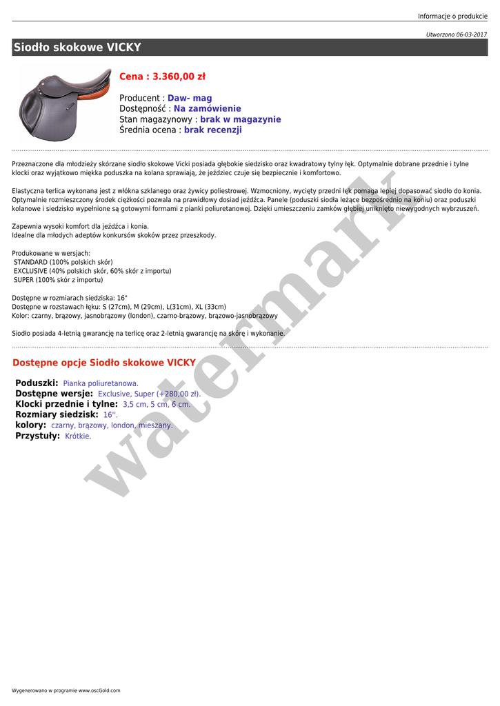 Informacje o produkcie Utworzono 06-03-2017 Siodło skokowe VICKY Cena : 3.360,00 zł Producent : Daw- mag Dostępność : Na zamówienie Stan magazynowy : brak w magazynie Średnia ocena : brak recenzji Przeznaczone dla młodzieży skórzane siodło skokowe Vicki posiada głębokie siedzisko oraz kwadratowy tylny łęk. Optymalnie dobrane przednie i tylne klocki oraz wyjątkowo miękka poduszka na kolana sprawiają, że jeździec czuje się bezpiecznie i komfortowo. er m ar k Elastyczna terlica wykonana jest z włókna szklanego oraz żywicy poliestrowej. Wzmocniony, wycięty przedni łęk pomaga lepiej dopasować siodło do konia. Optymalnie rozmieszczony środek ciężkości pozwala na prawidłowy dosiad jeźdźca. Panele (poduszki siodła leżące bezpośrednio na koniu) oraz poduszki kolanowe i siedzisko wypełnione są gotowymi formami z pianki poliuretanowej. Dzięki umieszczeniu zamków głębiej uniknięto niewygodnych wybrzuszeń. Zapewnia wysoki komfort dla jeźdźca i konia. Idealne dla młodych adeptów konkursów skoków przez przeszkody. Produkowane w wersjach: STANDARD (100% polskich skór) EXCLUSIVE (40% polskich skór, 60% skór z importu) SUPER (100% skór z importu) Dostępne w rozmiarach siedziska: 16" Dostępne w rozstawach łęku: S (27cm), M (29cm), L(31cm), XL (33cm) Kolor: czarny, brązowy, jasnobrązowy (london), czarno-brązowy, brązowo-jasnobrązowy Siodło posiada 4-letnią gwarancję na terlicę oraz 2-letnią gwarancję na skórę i wykonanie. Dostępne opcje Siodło skokowe VICKY w at Poduszki: Pianka poliuretanowa. Dostępne wersje: Exclusive, Super (+280,00 zł). Klocki przednie i tylne: 3,5 cm, 5 cm, 6 cm. Rozmiary siedzisk: 16''. kolory: czarny, brązowy, london, mieszany. Przystuły: Krótkie. Wygenerowano w programie www.oscGold.com
