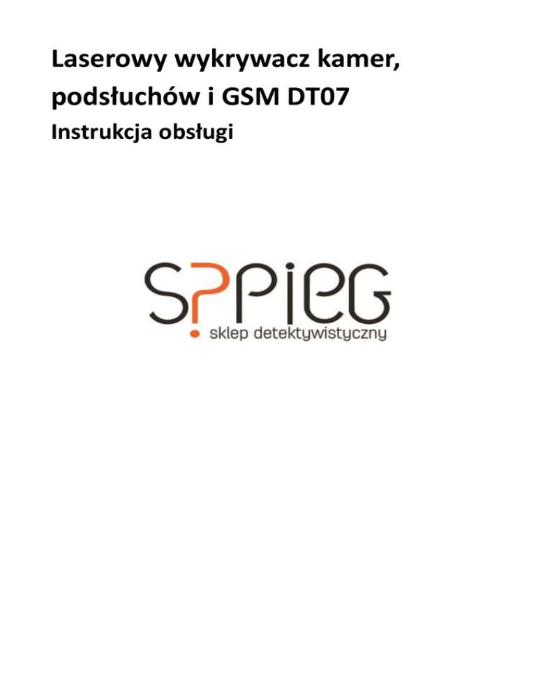 Laserowy wykrywacz kamer, podsłuchów i GSM DT07 Instrukcja obsługi Salon detektywistyczny SZPIEG Kraków, ul. Starowiślna 42 www.szpieg.sklep.pl [email protected] godz. otwarcia: pn-pt: 10-18, sob.10-14 Szybki kontakt 12 426 46 12 Środki ostrożności podczas użytkowania W celu bezpiecznego korzystania z urządzenia przed jego użyciem uważnie przeczytaj instrukcję obsługi. Poniższe informacje opisują właściwy i bezpieczny sposób korzystania z produktu. OSTRZEŻENIE! Zabrania się demontowania lub wprowadzania zmian w zakresie jakiejkolwiek części produktu. Niniejsza instrukcja nie zawiera żadnych informacji na temat demontażu lub modyfikacji jakiejkolwiek części produktu. Nie należy zanurzać tego produktu w wodzie lub innej cieczy. W przypadku wylania wody lub innych płynów na niniejszy produkt, należy wyciągnąć baterię. W przeciwnym razie płyn może spowodować zwarcie połączeń elektrycznych co może doprowadzić do pożaru. Podobnie nie należy dotykać produktu mokrymi rękami. Nie należy umieszczać produktu w pobliżu ognia lub w miejscach o wysokiej temperaturze. Nie należy umieszczać produktu w miejscach dużego zapylenia lub zakurzenia. Urządzenie nie jest odporne na wstrząsy lub drgania, więc umieszczanie urządzenia w miejscach narażonych na nadmierne lub długotrwałe wstrząsy może spowodować uszkodzenie urządzenia. Wykrywanie kamer IR 1. Przesuń przełącznik do i naciśnij przycisk laser, aby rozpocząć pracę z wykrywaczem. 2. Wyceluj w niepewny punkt, jeśli jest tam świecący punkt może to być mini-kamera. : wskaźnik alarmowy oznaczający, aktualne wykrywanie Salon detektywistyczny SZPIEG Kraków, ul. Starowiślna 42 www.szpieg.sklep.pl [email protected] godz. otwarcia: pn-pt: 10-18, sob.10-14 Szybki kontakt 12 426 46 12 : wskaźnik wibracyjny oznaczający, aktualne wykrywanie Wykrywacz bezprzewodowych skanerów: 1. Przesuń przełącznik do lub aby rozpocząć pracę z wykrywaczem. 2. Dostosowuj czułość dopóki pierwsza zielona dioda nie zamiga, po czym zacznij wykrywać bliskie warunki. 3. Zielone diody będą świecić jedna po drugiej co oznacza czy sygnał jest słaby czy silny. Kiedy wszystkie światła zaświecą się i włączy się alarm lub wibrator oznacza to, że cel został odnaleziony. Salon detektywistyczny SZPIEG Kraków, ul. Starowiślna 42 www.szpieg.sklep.pl [email protected] godz. otwarcia: pn-pt: 10-18, sob.10-14 Szybki kontakt 12 426 46 12
