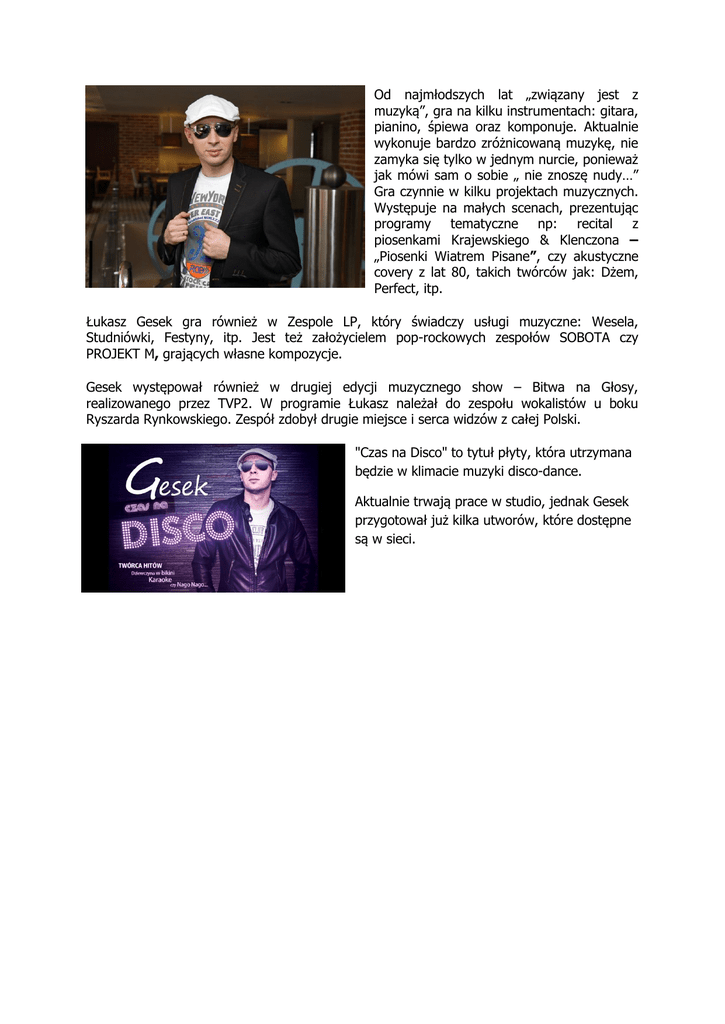 Od najmłodszych lat „związany jest z muzyką”, gra na kilku instrumentach: gitara, pianino, śpiewa oraz komponuje. Aktualnie wykonuje bardzo zróżnicowaną muzykę, nie zamyka się tylko w jednym nurcie, ponieważ jak mówi sam o sobie „ nie znoszę nudy…” Gra czynnie w kilku projektach muzycznych. Występuje na małych scenach, prezentując programy tematyczne np: recital z piosenkami Krajewskiego & Klenczona – „Piosenki Wiatrem Pisane”, czy akustyczne covery z lat 80, takich twórców jak: Dżem, Perfect, itp. Łukasz Gesek gra również w Zespole LP, który świadczy usługi muzyczne: Wesela, Studniówki, Festyny, itp. Jest też założycielem pop-rockowych zespołów SOBOTA czy PROJEKT M, grających własne kompozycje. Gesek występował również w drugiej edycji muzycznego show – Bitwa na Głosy, realizowanego przez TVP2. W programie Łukasz należał do zespołu wokalistów u boku Ryszarda Rynkowskiego. Zespół zdobył drugie miejsce i serca widzów z całej Polski. "Czas na Disco" to tytuł płyty, która utrzymana będzie w klimacie muzyki disco-dance. Aktualnie trwają prace w studio, jednak Gesek przygotował już kilka utworów, które dostępne są w sieci.
