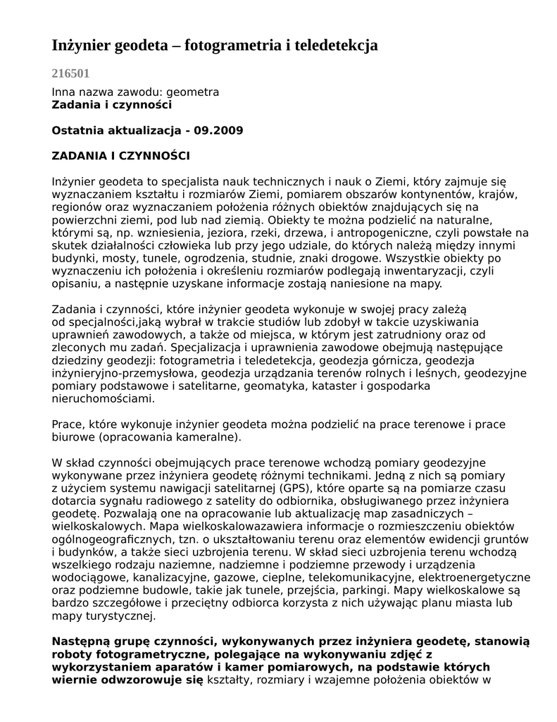Inżynier geodeta – fotogrametria i teledetekcja 216501 Inna nazwa zawodu: geometra Zadania i czynności Ostatnia aktualizacja - 09.2009 ZADANIA I CZYNNOŚCI Inżynier geodeta to specjalista nauk technicznych i nauk o Ziemi, który zajmuje się wyznaczaniem kształtu i rozmiarów Ziemi, pomiarem obszarów kontynentów, krajów, regionów oraz wyznaczaniem położenia różnych obiektów znajdujących się na powierzchni ziemi, pod lub nad ziemią. Obiekty te można podzielić na naturalne, którymi są, np. wzniesienia, jeziora, rzeki, drzewa, i antropogeniczne, czyli powstałe na skutek działalności człowieka lub przy jego udziale, do których należą między innymi budynki, mosty, tunele, ogrodzenia, studnie, znaki drogowe. Wszystkie obiekty po wyznaczeniu ich położenia i określeniu rozmiarów podlegają inwentaryzacji, czyli opisaniu, a następnie uzyskane informacje zostają naniesione na mapy. Zadania i czynności, które inżynier geodeta wykonuje w swojej pracy zależą od specjalności,jaką wybrał w trakcie studiów lub zdobył w takcie uzyskiwania uprawnień zawodowych, a także od miejsca, w którym jest zatrudniony oraz od zleconych mu zadań. Specjalizacja i uprawnienia zawodowe obejmują następujące dziedziny geodezji: fotogrametria i teledetekcja, geodezja górnicza, geodezja inżynieryjno-przemysłowa, geodezja urządzania terenów rolnych i leśnych, geodezyjne pomiary podstawowe i satelitarne, geomatyka, kataster i gospodarka nieruchomościami. Prace, które wykonuje inżynier geodeta można podzielić na prace terenowe i prace biurowe (opracowania kameralne). W skład czynności obejmujących prace terenowe wchodzą pomiary geodezyjne wykonywane przez inżyniera geodetę różnymi technikami. Jedną z nich są pomiary z użyciem systemu nawigacji satelitarnej (GPS), które oparte są na pomiarze czasu dotarcia sygnału radiowego z satelity do odbiornika, obsługiwanego przez inżyniera geodetę. Pozwalają one na opracowanie lub aktualizację map zasadniczych – wielkoskalowych. Mapa wielkoskalowazawiera informacje o rozmieszczeniu obiektów ogólnogeograficznych, tzn. o ukształtowaniu terenu oraz elementów ewidencji gruntów i budynków, a także sieci uzbrojenia terenu. W skład sieci uzbrojenia terenu wchodzą wszelkiego rodzaju naziemne, nadziemne i podziemne przewody i urządzenia wodociągowe, kanalizacyjne, gazowe, cieplne, telekomunikacyjne, elektroenergetyczne oraz podziemne budowle, takie jak tunele, przejścia, parkingi. Mapy wielkoskalowe są bardzo szczegółowe i przeciętny odbiorca korzysta z nich używając planu miasta lub mapy turystycznej. Następną grupę czynności, wykonywanych przez inżyniera geodetę, stanowią roboty fotogrametryczne, polegające na wykonywaniu zdjęć z wykorzystaniem aparatów i kamer pomiarowych, na podstawie których wiernie odwzorowuje się kształty, rozmiary i wzajemne położenia obiektów w terenie. Zdjęcia te wykonywane są ze stanowisk naziemnych lub z samolotów. Uzyskanie przestrzennego obrazu przedmiotu lub terenu możliwe jest za pomocą stereogramu, czyli pary zdjęć wykonanych z dwóch punktów przestrzeni. Na podstawie zdjęć lotniczych dokonuje się opracowań lub aktualizacji map. Innym rodzajem pomiarów wykonywanych przez inżyniera geodetę są pomiary geodezyjne związane z budową obiektów inżynierskich, np. budynków, dróg, mostów, linii kolejowych. Czynności te polegają na odszukaniu punktów istniejącej osnowy geodezyjnej. Osnowę geodezyjną stanowi usystematyzowany zbiór punktów w terenie o precyzyjnie wyznaczonym położeniu obejmującym długość, szerokość geograficzną oraz wysokość n.p.m. Punkty te są trwale oznaczone, często w formie metalowego guza wmurowanego w betonowy słupek, i stanowią podstawę do wykonywania dalszych pomiarów. Korzystając z osnowy inżynier geodeta oblicza miary do tyczenia projektów w terenie, wyznacza w przestrzeni położenie projektowanych budowli i konstrukcji, określa położenie elementów obiektu, np. naroży. Następnie zaznacza w terenie wytyczone przez siebie punkty w taki sposób, aby mogły być wykorzystywane przy wykonywaniu robót budowlano-montażowych oraz dokonuje inwentaryzacji, czyli opisuje i nanosi na mapy szkic uzbrojenia podziemnego i nadziemnego. Inżynier geodeta dokonuje również pomiarów kontrolnych, w takcie wykonywania robót budowlanych. Pomiary kontrolne służą sprawdzeniu, czy położenie szczegółów realizowanych obiektów jest zgodne z projektem oraz czy zmiany w warstwie gruntu stanowiącego podłoże budowlane nie wywołują przemieszczeń i odkształceń, które mogłyby się okazać szkodliwe dla konstrukcji obiektów i ich dalszej eksploatacji. Po zakończeniu prac budowlanych następuje wykonanie geodezyjnej inwentaryzacji powykonawczej. Inżynier geodeta sprawdza wówczas, czy obiekt budowlany został zrealizowany zgodnie z założeniami projektowymi w zakresie dotyczącym kształtu i położenia budowli, a także uzbrojenia terenu. Praca inżyniera geodety związana jest także z projektowaniem, budową, eksploatacją i obsługą różnego rodzaju obiektów inżynierskich znajdujących się pod powierzchnią ziemi. Do tego typu obiektów zalicza się kopalnie ziemne, odkrywkowe, tunele. Czynności inżyniera geodety polegają wówczas na zakładaniu i pomiarach osnowy geodezyjnej pod ziemią i nawiązaniu jej do osnowy naziemnej, prowadzeniu badań deformacji górotworu, powierzchni terenu i budowli, inwentaryzowaniu szkód górniczych poczynionych na powierzchni. Czynności pomiarowe wykonywane przez inżyniera geodetę wykorzystywane są także w gospodarce nieruchomościami gruntowymi i budynkami. Czynności te obejmują przeprowadzanie podziałów, rozgraniczanie, scalanie nieruchomości. Podział geodezyjny obejmuje wydzielenie z dotychczas istniejącej i oznaczonej jednej działki ewidencyjnej, nowo utworzonych dwóch lub więcej działek ewidencyjnych. Inżynier geodeta 