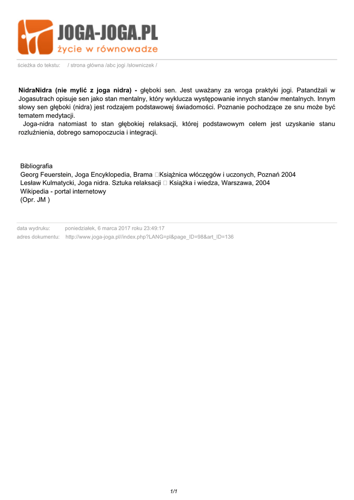 ścieżka do tekstu: / strona główna /abc jogi /słowniczek / NidraNidra (nie mylić z joga nidra) - głęboki sen. Jest uważany za wroga praktyki jogi. Patandżali w Jogasutrach opisuje sen jako stan mentalny, który wyklucza występowanie innych stanów mentalnych. Innym słowy sen głęboki (nidra) jest rodzajem podstawowej świadomości. Poznanie pochodzące ze snu może być tematem medytacji. Joga-nidra natomiast to stan głębokiej relaksacji, której podstawowym celem jest uzyskanie stanu rozluźnienia, dobrego samopoczucia i integracji. Bibliografia Georg Feuerstein, Joga Encyklopedia, Brama Książnica włóczęgów i uczonych, Poznań 2004 Lesław Kulmatycki, Joga nidra. Sztuka relaksacji Książka i wiedza, Warszawa, 2004 Wikipedia - portal internetowy (Opr. JM ) data wydruku: poniedziałek, 6 marca 2017 roku 23:49:17 adres dokumentu: http://www.joga-joga.pl//index.php?LANG=pl&page_ID=98&art_ID=136 1/1