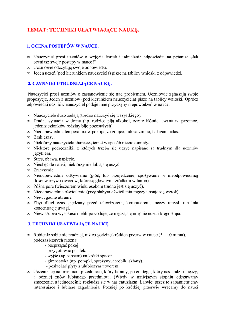 TEMAT: TECHNIKI UŁATWIAJĄCE NAUKĘ. 1. OCENA POSTĘPÓW W NAUCE. • • • Nauczyciel prosi uczniów o wyjęcie kartek i udzielenie odpowiedzi na pytanie: „Jak oceniasz swoje postępy w nauce?” Uczniowie odczytują swoje odpowiedzi. Jeden uczeń (pod kierunkiem nauczyciela) pisze na tablicy wnioski z odpowiedzi. 2. CZYNNIKI UTRUDNIAJĄCE NAUKĘ. Nauczyciel prosi uczniów o zastanowienie się nad problemem. Uczniowie zgłaszają swoje propozycje. Jeden z uczniów (pod kierunkiem nauczyciela) pisze na tablicy wnioski. Oprócz odpowiedzi uczniów nauczyciel podaje inne przyczyny niepowodzeń w nauce: • • • • • • • • • • • • • • • Nauczyciele duŜo zadają (trudno nauczyć się wszystkiego). Trudna sytuacja w domu (np. rodzice piją alkohol, częste kłótnie, awantury, przemoc, jeden z członków rodziny bije pozostałych). Nieodpowiednia temperatura w pokoju, za gorąco, lub za zimno, bałagan, hałas. Brak czasu. Niektórzy nauczyciele tłumaczą temat w sposób niezrozumiały. Niektóre podręczniki, z których trzeba się uczyć napisane są trudnym dla uczniów językiem. Stres, obawa, napięcie. Niechęć do nauki, niektórzy nie lubią się uczyć. Zmęczenie. Nieodpowiednie odŜywianie (głód, lub przejedzenie, spoŜywanie w nieodpowiedniej ilości warzyw i owoców, które są głównymi źródłami witamin). Późna pora (wieczorem wielu osobom trudno jest się uczyć). Nieodpowiednie oświetlenie (przy słabym oświetleniu męczy i psuje się wzrok). Niewygodne ubranie. Zbyt długi czas spędzany przed telewizorem, komputerem, męczy umysł, utrudnia koncentrację uwagi. Niewłaściwa wysokość mebli powoduje, Ŝe męczą się mięśnie oczu i kręgosłupa. 3. TECHNIKI UŁATWIAJĄCE NAUKĘ. • • Robienie sobie nie rzadziej, niŜ co godzinę krótkich przerw w nauce (5 – 10 minut), podczas których moŜna: - posprzątać pokój. - przygotować posiłek. - wyjść (np. z psem) na krótki spacer. - gimnastyka (np. pompki, spręŜyny, aerobik, skłony). - posłuchać płyty z ulubionym utworem. Uczenie się na przemian: przedmiotu, który lubimy, potem tego, który nas nudzi i męczy, a później znów lubianego przedmiotu. (Wtedy w mniejszym stopniu odczuwamy zmęczenie, a jednocześnie rozbudza się w nas entuzjazm. Łatwiej przez to zapamiętujemy interesujące i lubiane zagadnienia. Później po krótkiej przerwie wracamy do nauki • • • • • • • • • • • • • • • • • przedmiotu, którego nie lubimy. Podchodzimy do tego z większym entuzjazmem, a nauka idzie nam łatwiej). WaŜna role odgrywa aktywny wypoczynek (np. ćwiczenia relaksacyjne, uprawianie sportu, spacery. Wtedy rozluźniają się mięśnie oczu i kręgosłupa organizm się dotlenia, co daje nam nowe siły i energię do wysiłku umysłowego). Pozytywne, pełne entuzjazmu podejście do nauki. Dobre samopoczucie. W danej chwili zajmujemy się tylko jedną rzeczą. (Koncentrując się na czytaniu nie moŜna w tym czasie oglądać telewizji i rozmawiać. Nie moŜna wykonywać skutecznie dwóch rzeczy na raz). Zaplanowanie, jakich przedmiotów będziemy się uczyć w danym dniu i w jakiej kolejności. Wykorzystanie okienek między lekcjami w celu uczenia się, powtarzania materiału, czytania lektury, przepisywania notatek. Systematyczne i częste czytanie notatek. Przepisywanie notatek w domu na czysto. (Wtedy materiał z zajęć lepiej się utrwala. Przepisywane notatki moŜna uzupełnić o informacje z podręcznika, literatury pozapodręcznikowej lub innych materiałów. Notatki najlepiej jest przepisywać w tym samym dniu, w którym były zajęcia, gdyŜ w tym dniu najwięcej z zajęć pamiętamy). Próbować znaleźć miejsca, w których moŜna się spokojnie uczyć. WaŜną rolę odgrywa przyjazne otoczenie, odpowiednio ogrzane pomieszczenie, cisza, porządek w miejscu pracy. NaleŜy uczyć się systematycznie i nie odkładać nauki na następny dzień. Dobrze jest głośno opowiadać temat, którego się uczymy. JeŜeli jest taka moŜliwość, to warto poprosić rodziców, lub starsze rodzeństwo, Ŝeby nas przepytali, Ŝeby w trakcie naszego opowiadania zerkali do ksiąŜki, i zwracali nam uwagę, jeśli coś pominiemy. NaleŜy prawidłowo się odŜywiać (powinno się ograniczyć spoŜywanie słodyczy, napojów gazowanych, chipsów, hamburgerów, zapiekanek. Trzeba jeść śniadanie, oraz warzywa i owoce, które są głównym źródłem witamin). WaŜny jest odpowiedni czas snu (minimum 8 godzin na dobę). Higiena czytania (odległość oczu od czytanego tekstu powinna wynosić od 30 do 40 cm). Odpowiednie oświetlenie - najzdrowsze jest światło naturalne. - światło powinno padać z lewej strony dla osób praworęcznych. - światło powinno padać z prawej strony dla osób leworęcznych. - światłem sztucznym najlepiej jest oświetlić całe pomieszczenie. - dodatkowo naleŜy postawić lampkę na biurku. - nie naleŜy mieszać światła naturalnego ze sztucznym. Wysokość mebli powinna być dostosowana do wzrostu ucznia. 4. LITERATURA. 01. Angelow Bosse, Jak uczyć skutecznie, szybko i przyjemnie. Poradnik nowoczesnych metod nauki dla uczniów i studentów, Poznań, Moderski i S-ka, 1998. 02. Filipek Dorota, Higiena pracy umysłowej, "Biblioteka w szkole", 2007, nr 11, s. 16-17.03. 03. Gberek-Bibiek G., Stwarzamy sobie środowisko do procesu uczenia się, "Biblioteka w szkole", 2000, nr 2, s. 8-9. 04. Gordon W Green, Zostań celującym uczniem i studentem, Warszawa 1996. 05. Rudniański J., Jak się uczyć?, Warszawa 2001. 06. Zeman E., Edukacja czytelnicza i informacyjna, Warszawa 1999. Opracował: Artur Słabowski.