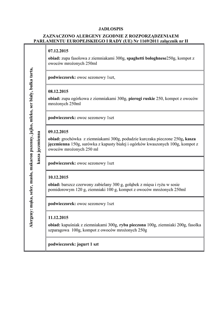 JADŁOSPIS ZAZNACZONO ALERGENY ZGODNIE Z ROZPORZĄDZENIAEM PARLAMENTU EUROPEJSKIEGO I RADY (UE) Nr 1169/2011 załącznik nr II 07.12.2015 podwieczorek: owoc sezonowy 1szt, 08.12.2015 obiad: zupa ogórkowa z ziemniakami 300g, pierogi ruskie 250, kompot z owoców mrożonych 250ml podwieczorek: owoc sezonowy 1szt kasza jęczmienna Alergeny: mąka, seler, masło, makaron pszenny, jajko, mleko, ser biały, bułka tarta, obiad: zupa fasolowa z ziemniakami 300g, spaghetti bologhnese250g, kompot z owoców mrożonych 250ml 09.12.2015 obiad: grochówka z ziemniakami 300g, podudzie kurczaka pieczone 250g, kasza jęczmienna 150g, surówka z kapusty białej i ogórków kwaszonych 100g, kompot z owoców mrożonych 250 ml podwieczorek: owoc sezonowy 1szt 10.12.2015 obiad: barszcz czerwony zabielany 300 g, gołąbek z mięsa i ryżu w sosie pomidorowym 120 g, ziemniaki 100 g, kompot z owoców mrożonych 250ml podwieczorek: owoc sezonowy 1szt 11.12.2015 obiad: kapuśniak z ziemniakami 300g, ryba pieczona 100g, ziemniaki 200g, fasolka szparagowa 100g, kompot z owoców mrożonych 250g podwieczorek: jogurt 1 szt JADŁOSPIS ZAZNACZONO ALERGENY ZGODNIE Z ROZPORZĄDZENIAEM PARLAMENTU EUROPEJSKIEGO I RADY (UE) Nr 1169/2011 załącznik nr II Alergeny: mąka, seler, masło, makaron pszenny, jajko, mleko, ser biały, bułka tarta, kasza jęczmienna 14.12.2015 obiad: zupa zacierkowa 300g, makaron z białym serem 200g, sos jogurtowy 80g, kompot z owoców mrożonych 250ml podwieczorek: owoc sezonowy 1szt 15.12.2015 obiad: zupa jarzynowa z makaronem 300g, ziemniaki200g, pierś z kurczaka duszona 90g, groszek z marchewką 100g, kompot z owoców mrożonych 250ml podwieczorek: owoc sezonowy 1szt, 16.12.2015 obiad: rosół z kaszą manną300g, kotlet mielony 100g, kasza gryczana 175g, surówka z ogórka kiszonego z olejem 100g, kompot z owoców mrożonych 250 ml podwieczorek: owoc sezonowy 1szt, 17.12.215 obiad:zupa ziemniaczana z fasolą 300 g, kotlet schabowy panierowany 100g, ziemniaki 150g, kalafior z bułka tarta 100g kompot z owoców mrożonych 200ml podwieczorek: owoc sezonowy 1szt 18.12.2015 obiad: zupa z porów 300g, filet z ryby panierowany 100g, ziemniaki 150g, surówka z kwaszonej kapusty i marchewki 100g, kompot z owoców mrożonych 250g podwieczorek: jogurt 1 szt Alergeny: mąka, seler, masło, makaron pszenny, jajko, mleko, ser biały, bułka tarta, kasza jęczmienna Jadłospis dieta bezglutenowa ZAZNACZONO ALERGENY ZGODNIE Z ROZPORZĄDZENIAEM PARLAMENTU EUROPEJSKIEGO I RADY (UE) Nr 1169/2011 załącznik nr II obiad: zupa fasolowa z ziemniakami 300g( niezageszczane mąką), spaghetti bologhnese250g(makaron ryżowy), kompot z owoców mrożonych 250ml podwieczorek: owoc sezonowy 1szt, obiad: zupa ogórkowa z ziemniakami 300g( niezageszczane mąką), pierogi ruskie 250g (mąka ryżowa), kompot z owoców mrożonych 250ml podwieczorek: owoc sezonowy 1szt obiad: grochówka z ziemniakami 300g( niezageszczane mąką), podudzie kurczaka pieczone 250g, kasza jaglana 150g, surówka z kapusty białej i ogórków kwaszonh 100g, kompot z owoców mrożonych 250 ml podwieczorek: owoc sezonowy 1szt obiad: barszcz czerwony zabielany 300 g( niezageszczane mąką), gołąbek z mięsa i ryżu w sosie pomidorowym 120 g, ziemniaki 100 g, kompot z owoców mrożonych 250ml podwieczorek: owoc sezonowy 1szt obiad: kapuśniak z ziemniakami 300g( niezageszczane mąką), ryba pieczona 100g, ziemniaki 200g, surówka warzywna 100g, kompot z owoców mrożonych 250g Alergeny: mąka, seler, masło, makaron pszenny, jajko, mleko, ser biały, bułka tarta, kasza jęczmienna Jadłospis dieta bezglutenowa podwieczorek: jogurt 1 szt obiad: zupa zacierkowa 300g( niezageszczane mąką),makaron ryżowy z białym serem 200g, sos jogurtowy 80g, kompot z owoców mrożonych 250ml podwieczorek: owoc sezonowy 1szt obiad: zupa jarzynowa z makaronem ryżowym 300g( niezageszczane mąką), ziemniaki 150g, pierś z kurczaka duszona 90g, groszek z marchewką 100g, kompot z owoców mrożonych 250ml podwieczorek: owoc sezonowy 1szt, obiad: rosół z makaronem ryżowym 300g( niezageszczane mąką), kotlet mielony 100g (bez bułki), kasza gryczana 175g, surówka z ogórka kiszonego z olejem 100g, kompot z owoców mrożonych 250 ml podwieczorek: owoc sezonowy 1szt obiad:zupa ziemniaczana z fasolą 300 ml( niezageszczane mąką), kotlet schabowy saute 100g, ziemniaki 150g, kalafior 100g kompot z owoców mrożonych 200ml podwieczorek: owoc sezonowy 1szt obiad: zupa z porów 300g( niezageszczane mąką), filet z ryby 100g, ziemniaki 150g, surówka z kwaszonej kapusty i marchewki 100g, kompot z owoców mrożonych 250g podwieczorek : owoc sezonowy 1 szt Alergeny: mąka, seler, masło, makaron pszenny, jajko, mleko, ser biały, bułka tarta, kasza jęczmienna Jadłospis dieta bezmleczna ZAZNACZONO ALERGENY ZGODNIE Z ROZPORZĄDZENIAEM PARLAMENTU EUROPEJSKIEGO I RADY (UE) Nr 1169/2011 załącznik nr II obiad: zupa fasolowa z ziemniakami 300g(zupa niezabielana), spaghetti bologhnese250g, kompot z owoców mrożonych 250ml podwieczorek: owoc sezonowy 1szt, obiad: zupa ogórkowa z ziemniakami 300g(zupa niezabielana), pierogi z ziemniakami 250g, kompot z owoców mrożonych 250ml podwieczorek: owoc sezonowy 1szt obiad: grochówka z ziemniakami 300g(zupa niezabielana), podudzie kurczaka pieczone 250g, kasza jęczmienna 150g, surówka z kapusty białej i ogórków kwaszonych 100g, kompot z owoców mrożonych 250 ml podwieczorek: owoc sezonowy 1szt obiad: barszcz czerwony 300 g(zupa niezabielana), gołąbek z mięsa i ryżu w sosie pomidorowym 120 g(sos niezabielany), ziemniaki 100 g, kompot z owoców mrożonych 250ml podwieczorek:owoc sezonowy 1szt obiad: kapuśniak z ziemniakami 300g(zupa niezabielana), filet z ryby soute 100g, ziemniaki 200g, surówka warzywna 100g, kompot z owoców mrożonych 250g Alergeny: mąka, seler, masło, makaron pszenny, jajko, mleko, ser biały, bułka tarta, kasza jęczmienna Jadłospis dieta bezmleczna podwieczorek: galaretka 1 szt obiad: zupa zacierk