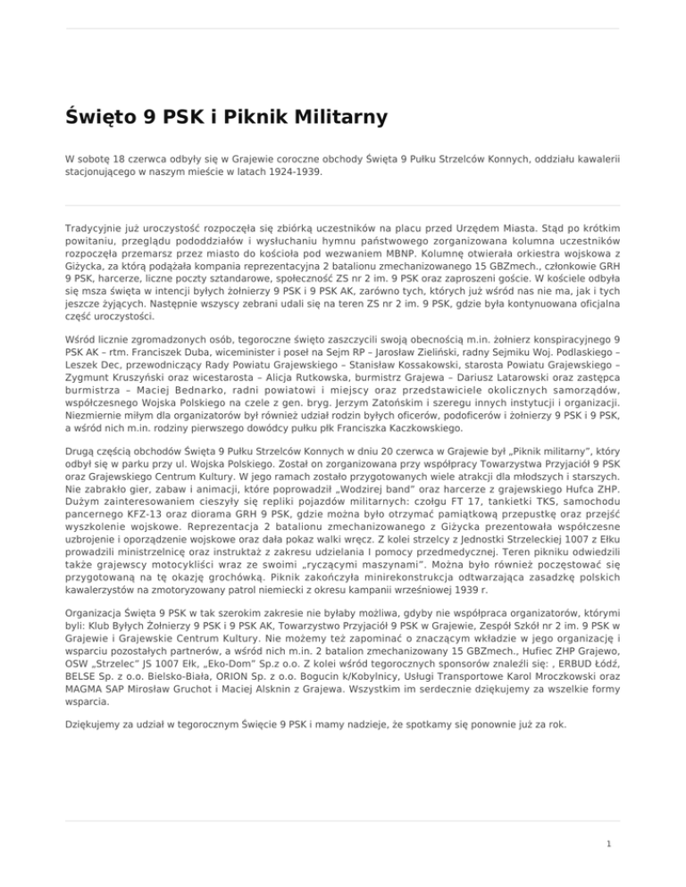 Święto 9 PSK i Piknik Militarny W sobotę 18 czerwca odbyły się w Grajewie coroczne obchody Święta 9 Pułku Strzelców Konnych, oddziału kawalerii stacjonującego w naszym mieście w latach 1924-1939. Tradycyjnie już uroczystość rozpoczęła się zbiórką uczestników na placu przed Urzędem Miasta. Stąd po krótkim powitaniu, przeglądu pododdziałów i wysłuchaniu hymnu państwowego zorganizowana kolumna uczestników rozpoczęła przemarsz przez miasto do kościoła pod wezwaniem MBNP. Kolumnę otwierała orkiestra wojskowa z Giżycka, za którą podążała kompania reprezentacyjna 2 batalionu zmechanizowanego 15 GBZmech., członkowie GRH 9 PSK, harcerze, liczne poczty sztandarowe, społeczność ZS nr 2 im. 9 PSK oraz zaproszeni goście. W kościele odbyła się msza święta w intencji byłych żołnierzy 9 PSK i 9 PSK AK, zarówno tych, których już wśród nas nie ma, jak i tych jeszcze żyjących. Następnie wszyscy zebrani udali się na teren ZS nr 2 im. 9 PSK, gdzie była kontynuowana oficjalna część uroczystości. Wśród licznie zgromadzonych osób, tegoroczne święto zaszczycili swoją obecnością m.in. żołnierz konspiracyjnego 9 PSK AK – rtm. Franciszek Duba, wiceminister i poseł na Sejm RP – Jarosław Zieliński, radny Sejmiku Woj. Podlaskiego – Leszek Dec, przewodniczący Rady Powiatu Grajewskiego – Stanisław Kossakowski, starosta Powiatu Grajewskiego – Zygmunt Kruszyński oraz wicestarosta – Alicja Rutkowska, burmistrz Grajewa – Dariusz Latarowski oraz zastępca burmistrza – Maciej Bednarko, radni powiatowi i miejscy oraz przedstawiciele okolicznych samorządów, współczesnego Wojska Polskiego na czele z gen. bryg. Jerzym Zatońskim i szeregu innych instytucji i organizacji. Niezmiernie miłym dla organizatorów był również udział rodzin byłych oficerów, podoficerów i żołnierzy 9 PSK i 9 PSK, a wśród nich m.in. rodziny pierwszego dowódcy pułku płk Franciszka Kaczkowskiego. Drugą częścią obchodów Święta 9 Pułku Strzelców Konnych w dniu 20 czerwca w Grajewie był „Piknik militarny”, który odbył się w parku przy ul. Wojska Polskiego. Został on zorganizowana przy współpracy Towarzystwa Przyjaciół 9 PSK oraz Grajewskiego Centrum Kultury. W jego ramach zostało przygotowanych wiele atrakcji dla młodszych i starszych. Nie zabrakło gier, zabaw i animacji, które poprowadził „Wodzirej band” oraz harcerze z grajewskiego Hufca ZHP. Dużym zainteresowaniem cieszyły się repliki pojazdów militarnych: czołgu FT 17, tankietki TKS, samochodu pancernego KFZ-13 oraz diorama GRH 9 PSK, gdzie można było otrzymać pamiątkową przepustkę oraz przejść wyszkolenie wojskowe. Reprezentacja 2 batalionu zmechanizowanego z Giżycka prezentowała współczesne uzbrojenie i oporządzenie wojskowe oraz dała pokaz walki wręcz. Z kolei strzelcy z Jednostki Strzeleckiej 1007 z Ełku prowadzili ministrzelnicę oraz instruktaż z zakresu udzielania I pomocy przedmedycznej. Teren pikniku odwiedzili także grajewscy motocykliści wraz ze swoimi „ryczącymi maszynami”. Można było również poczęstować się przygotowaną na tę okazję grochówką. Piknik zakończyła minirekonstrukcja odtwarzająca zasadzkę polskich kawalerzystów na zmotoryzowany patrol niemiecki z okresu kampanii wrześniowej 1939 r. Organizacja Święta 9 PSK w tak szerokim zakresie nie byłaby możliwa, gdyby nie współpraca organizatorów, którymi byli: Klub Byłych Żołnierzy 9 PSK i 9 PSK AK, Towarzystwo Przyjaciół 9 PSK w Grajewie, Zespół Szkół nr 2 im. 9 PSK w Grajewie i Grajewskie Centrum Kultury. Nie możemy też zapominać o znaczącym wkładzie w jego organizację i wsparciu pozostałych partnerów, a wśród nich m.in. 2 batalion zmechanizowany 15 GBZmech., Hufiec ZHP Grajewo, OSW „Strzelec” JS 1007 Ełk, „Eko-Dom” Sp.z o.o. Z kolei wśród tegorocznych sponsorów znaleźli się: , ERBUD Łódź, BELSE Sp. z o.o. Bielsko-Biała, ORION Sp. z o.o. Bogucin k/Kobylnicy, Usługi Transportowe Karol Mroczkowski oraz MAGMA SAP Mirosław Gruchot i Maciej Alsknin z Grajewa. Wszystkim im serdecznie dziękujemy za wszelkie formy wsparcia. Dziękujemy za udział w tegorocznym Święcie 9 PSK i mamy nadzieje, że spotkamy się ponownie już za rok. 1