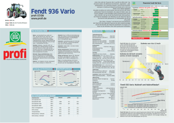 Unten links steht der Powermix-Wert in g/kWh als Mittel aller 7 gemessenen Zyklen. Die Mittelwerte der Bereiche „Zugarbeiten“, „Zapfwellenarbeiten“ und „Gemischte Arbeiten“ sind mit dem Kraftstoffverbrauch in Gramm pro Kilowatt und Stunde und in Litern pro Hektar in der Tabelle angegeben. Die gelbe Grundlinie der Grafik markiert den Durchschnitt aller bisher gemessenen Powermix-Kandidaten. Die Länge der Balken zeigt, wie viel der Schlepper in dem jeweiligen Zyklus prozentual besser (grün) oder schlechter (rot) war als der Durchschnitt aller bisher gemessenen Powermix-Kandidaten. Der Mittelwert für den Powermix liegt im Durchschnitt aller gemessenen 29 Testkandidaten derzeit bei 302 g/kWh. 1) Der Zyklus „Transport“ wird derzeit noch nicht gemessen. Der Fendt 936 Vario liegt beim Powermix bei allen Arbeiten günstiger als der Durchschnitt. Der Powermix-Gesamtwert ist um gute 13 % besser als der Mittelwert aller bisher gemessenen Kandidaten. Fendt 936 Vario profi 07/08 Breite I 267 cm www.profi.de Länge I 586 cm (mit Frontkraftheber) Höhe I 324 cm Die technischen Daten Messwerte des Powermix Fendt 936 Vario -20 % -10 % Zugarbeiten: Mittelwert 263 g/kWh und 9,88 l/ha 0 +10 % +20 % 1 Schwer Pflug (100 % Last) Grubber 2 Mittelschwer Pflug (70 % Last) Grubber Zapfwellenarbeiten: Mittelwert 259 g/kWh und 3,60 l/ha 3 Schwer Kreiselegge (100 % Last) Mähwerk 4 Mittelschwer Kreiselegge (70 % Last) Mähwerk 5 Leicht (40 % Last) Kreiselegge Mähwerk Gemischte Arbeiten: Mittelwert 266 g/kWh und 3,69 l/ha Testzentrums 6 Miststreuer Motor I 243 kW/330 PS bei 2 200 min ; max. 265 kW/360 PS bei 1 900 min-1; wassergekühlter Sechszylindermotor Deutz TCD 2013 L06 4V (Tier 3a) mit Turbolader, Ladeluftkühlung, externer Abgasrückführung und elektronischer Regelung; 7 142 cm³ Hubraum; Kraftstofftank mit 650 l. -1 Getriebe I Stufenlos, „Vario ML 260“ mit lastschaltbarer Wendeschaltung, Tempomat und TMS; 60 km/h („Profi“) oder 40 bzw. 50 km/h, ab 20 m/h. 2 Fahrbereiche bis 34 km/h (rückwärts bis 20 km/h) und bis 60 km/h (rückwärts bis 33 km/h). 0$*$=,1)5352)(66,21(//($*5$57(&+1,. Bremsen I Nasse Lamellenbremse, Zweikreis-Druckluftbremse mit unabhängiger Bremse in jedem Rad und „FSC“ Fahrstabilitätskontrolle. Optional Einkreis-Bremsanlage (50 km/h). Elektrik I 12 V, Batterie 170 Ah, Lichtmaschine 2 x 150 A; Anlasser 4,7 kW/6,4 PS. Hydraulik I Axialkolbenpumpe mit 160 oder 216 l/min, 200 bar, 4 ew/dw Steuergeräte (max. 8); 87 l Öl entnehmbar. Zapfwelle I 540E/1 000; 1 3/4 Zoll, 6 Keile, elektrohydraulisch. Achsen und Fahrwerk I Planetenachse mit Lamellen-Differenzialsperre, vorne einzelradgefederte Querlenkerachse, Testbereifung 600/70 R 34 und 710/75 R 42. 250 Preis I In Grundausstattung mit 60 km/h 204 000 € ohne Mwst; Version „Power“ mit 50 km/h und 18 t Gesamtgewicht 194 000 €. Hubkraft Front I (90 % max. Öldruck, korr.) Unten/Mitte/Oben 3 930/4 290/4 890 daN Hubweg unter Last 60,0 cm (15,4 bis 75,4 cm) Absolut (l/h) 75 Relativ (g/kWh) 45 1600 100 1400 0 1000 1500 8 Transport1) Powermix 261 g/kWh Fendt 936 Vario: Das stufenlose „Vario“-Getriebe der Baureihe ML 260 hat zwei Fahrbereiche für Ackerarbeit und für Transportarbeit und reicht von 20 m/h bis 60 km/h. Es bietet die vollständigsten Einstellmöglichkeiten am Markt. 1200 1000 2000 2500 Motordrehzahl (min-1) 30 300 15 g/kWh 250 0 1000 1500 Zugleistung I Max. 214,6 kW bei 1 800 min-1 Bei Nenndrehzahl 199,4 kW 200 2000 2500 Motordrehzahl (min-1) Der Kraftstoffverbrauch im Kennfeld I Stufenlos bis 60 km/h vorwärts und bis 33 km/h rückwärts II Fahrbereich I 0 268 g/kWh 275 g/kWh 2 4 6 8 10 12 14 16 18km/h Fahrbereich II Abbremsung I Maximale mittlere Verzögerung Pedalkraft 5,8 m/s² 50 daN Wendekreis I Ohne Frontantrieb Mit Frontantrieb 13,75 m 14,35 m Testgewicht I Vorder-/Hinterachse 4 400 kg/5 920 kg Leergewicht 10 320 kg Zulässiges Gesamtgewicht 16 000 kg Nutzlast 5 700 kg (bei 50 km/h 18 t zul. Ges.gew., 7 700 kg Nutzlast) Leistungsgewicht 42 kg/kW Radstand 305 cm Spurweite vorne/hinten 209/200 cm Bodenfreiheit 38,0 cm -50 -40 l/h — Sparzapfwelle 540E 100 % 1600 213 62,3 4 000 68,2 3 000 227 — — Motor im Abregelbereich 80 % max. 230 51,5 Hohe Leistung 80 % 90 % 225 50,1 Transportarbeiten 40 % 90 % 253 28,2 Wenig Leistung, ½ Drehzahl 40 % 60 % 225 25,1 Hohe Leistung, ½ Drehzahl 60 % 60 % — — 30 40 50km/h Bestellkombination 5 000 kg 7 000 — — 20 8 000 g/kWh 2030 10 9 000 — 100 % 0 10 000 Drehzahl 100 % -10 11 000 100 % Sparzapfwelle 1000E -20 Fendt 936 Vario: Hubkraft und Hubkraftbedarf Leistung Normzapfwelle 1000 -30 Hubkraft (daN) 12 000 Normzapfwelle 540 Arbeitsbereiche Stufenlos von 4 bis 12 km/h Lautstärke I (unter Last am Fahrer-Ohr) Kabine geschlossen/offen 76,6/83,3 dB(A) l/h kW 150 Nm Drehmoment I Maximal 1 450 Nm (1 400 min-1) Drehmomentanstieg 45,5 % Drehzahlabfall 36,0 % Anfahrmoment Nicht messbar Getriebe I Gangzahl von 4 bis 12 km/h Stufenlos Hubkraft Heck I (90 % max. Öldruck, korr.) Unten/Mitte/Oben 7 460/9 500/10 280 daN Hubweg unter Last 84,4 cm (23 bis 107,4 cm) 60 50 Dieselverbrauch I Spezifisch bei max. Leistung 214 g/kWh Spezifisch bei Nenndrehzahl 225 g/kWh Max./Nenndrehzahl 65,74 bzw. 61,75 l/h Pflege und Wartung I Motoröl 38 l (Wechsel alle 500 h); Getriebeöl 67 l (2 000 h), Hydrauliköl 109 l (1 000 h); Kühlsystem 30 l. Kraftstoffverbrauch Drehmoment (Nm) 200 7 Presse 256,5 kW 229,5 kW Hydraulikleistung I (über 3 Steuergeräte) Betriebsdruck/Max. Menge 209 bar/222,2 l/min Max. Leistung 61,9 kW (205,9 l/min, 181 bar) Leistung und Drehmoment Leistung (kW) 300 Hubwerk I Kat. III; EHR mit Unterlenkerregelung, dw-Funktion und Schwingungstilgung; Schlupfregelung Option. Frontkraftheber Serie, Frontzapfwelle Option. Zapfwellenleistung I Maximal (1 800 min-1) Bei Nenndrehzahl (2 200 min-1) 6 000 5 000 Pflug 2 000 kg Bezeichnungen bitte nachtraHubstreben lang: Durchgehend gen! 7 460 daN, Hubweg 84,4 cm Hubstreben kurz: Durchgehend 8 690 daN, Hubweg 74,1