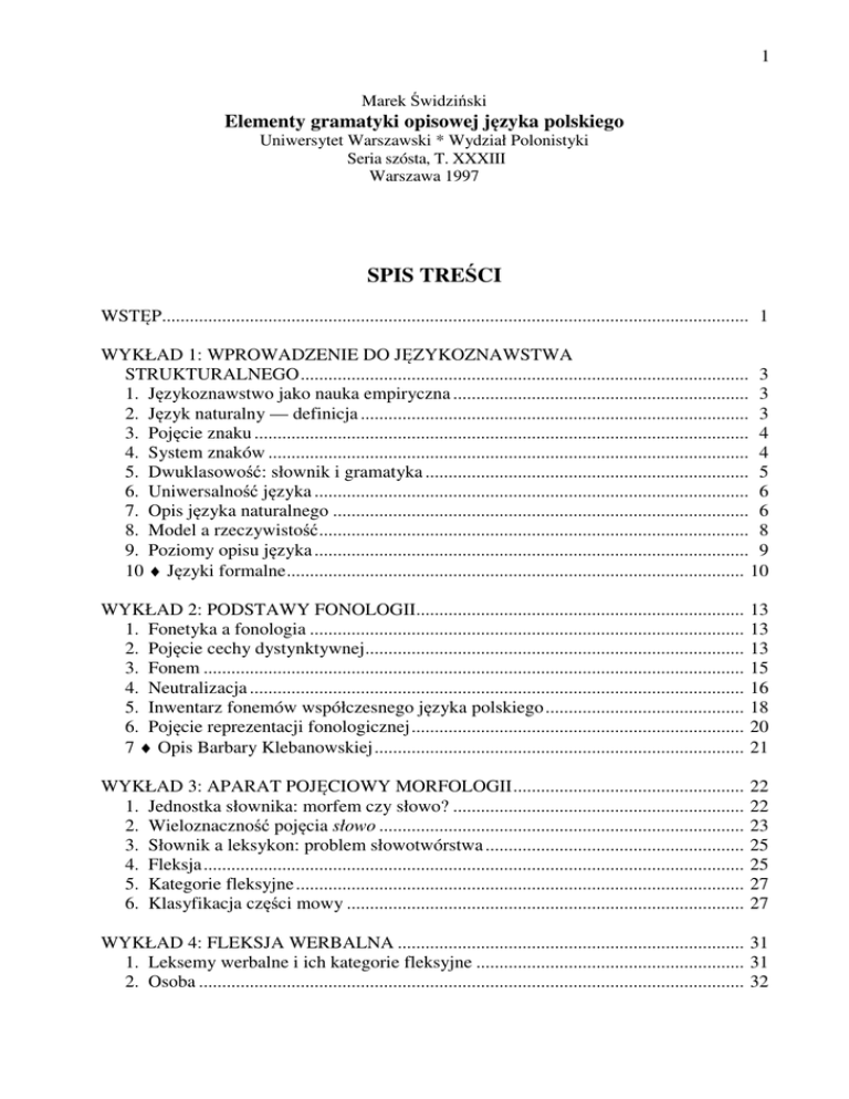 1 Marek Świdziński Elementy gramatyki opisowej języka polskiego Uniwersytet Warszawski * Wydział Polonistyki Seria szósta, T. XXXIII Warszawa 1997 SPIS TREŚCI WSTĘP............................................................................................................................... 1 WYKŁAD 1: WPROWADZENIE DO JĘZYKOZNAWSTWA STRUKTURALNEGO ................................................................................................. 3 1. Językoznawstwo jako nauka empiryczna ................................................................ 3 2. Język naturalny — definicja .................................................................................... 3 3. Pojęcie znaku ........................................................................................................... 4 4. System znaków ........................................................................................................ 4 5. Dwuklasowość: słownik i gramatyka ...................................................................... 5 6. Uniwersalność języka .............................................................................................. 6 7. Opis języka naturalnego .......................................................................................... 6 8. Model a rzeczywistość ............................................................................................. 8 9. Poziomy opisu języka .............................................................................................. 9 10 ♦ Języki formalne ................................................................................................... 10 WYKŁAD 2: PODSTAWY FONOLOGII....................................................................... 1. Fonetyka a fonologia .............................................................................................. 2. Pojęcie cechy dystynktywnej .................................................................................. 3. Fonem ..................................................................................................................... 4. Neutralizacja ........................................................................................................... 5. Inwentarz fonemów współczesnego języka polskiego ........................................... 6. Pojęcie reprezentacji fonologicznej ........................................................................ 7 ♦ Opis Barbary Klebanowskiej ................................................................................ 13 13 13 15 16 18 20 21 WYKŁAD 3: APARAT POJĘCIOWY MORFOLOGII .................................................. 1. Jednostka słownika: morfem czy słowo? ............................................................... 2. Wieloznaczność pojęcia słowo ............................................................................... 3. Słownik a leksykon: problem słowotwórstwa ........................................................ 4. Fleksja ..................................................................................................................... 5. Kategorie fleksyjne ................................................................................................. 6. Klasyfikacja części mowy ...................................................................................... 22 22 23 25 25 27 27 WYKŁAD 4: FLEKSJA WERBALNA ........................................................................... 31 1. Leksemy werbalne i ich kategorie fleksyjne .......................................................... 31 2. Osoba ...................................................................................................................... 32 2 3. 4. 5. 6. 7. 8. 9. Liczba...................................................................................................................... Rodzaj ..................................................................................................................... Wtórne funkcje osoby, liczby i rodzaju .................................................................. Tryb ......................................................................................................................... Czas ......................................................................................................................... ♦ Czas względny .................................................................................................... Paradygmat ............................................................................................................. 32 33 33 34 35 36 37 WYKŁAD 5: FLEKSJA IMIENNA................................................................................. 1. Rzeczownik i jego kategorie fleksyjne ................................................................... 2. Liczba...................................................................................................................... 3. Przypadek ............................................................................................................... 4. ♦ Inne kategorie fleksyjne ...................................................................................... 5. Paradygmat ............................................................................................................. 6. Rodzaj ..................................................................................................................... 7. Przymiotnik i jego kategorie fleksyjne ................................................................... 8. Paradygmat ............................................................................................................. 9. ♦ Liczebniki ........................................................................................................... 44 44 44 45 46 46 47 48 49 50 WYKŁAD 6: PARADYGMATYKA ............................................................................... 1. Fle