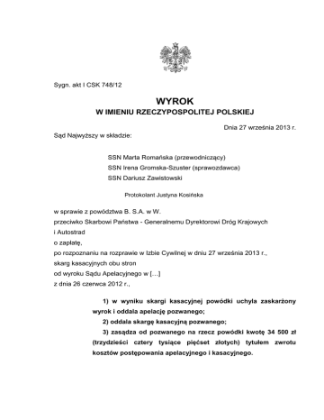 Sygn. akt I CSK 748/12 WYROK W IMIENIU RZECZYPOSPOLITEJ POLSKIEJ Dnia 27 września 2013 r. Sąd Najwyższy w składzie: SSN Marta Romańska (przewodniczący) SSN Irena Gromska-Szuster (sprawozdawca) SSN Dariusz Zawistowski Protokolant Justyna Kosińska w sprawie z powództwa B. S.A. w W. przeciwko Skarbowi Państwa - Generalnemu Dyrektorowi Dróg Krajowych i Autostrad o zapłatę, po rozpoznaniu na rozprawie w Izbie Cywilnej w dniu 27 września 2013 r., skarg kasacyjnych obu stron od wyroku Sądu Apelacyjnego w […] z dnia 26 czerwca 2012 r., 1) w wyniku skargi kasacyjnej powódki uchyla zaskarżony wyrok i oddala apelację pozwanego; 2) oddala skargę kasacyjną pozwanego; 3) zasądza od pozwanego na rzecz powódki kwotę 34 500 zł (trzydzieści cztery tysiące pięćset złotych) tytułem zwrotu kosztów postępowania apelacyjnego i kasacyjnego. 2 UZASADNIENIE Powódka wnosiła o zasądzenie od strony pozwanej kwoty 1 290 696,29 zł z ustawowymi odsetkami i kosztami procesu tytułem reszty wynagrodzenia za budowę odcinka autostrady. Wskazała, że cała należność z tego tytułu wynosiła 4 282 047,03 zł, z czego strona pozwana zapłaciła łącznie kwotę 2 948 977,27 zł, a resztę, tj. kwotę 1 333 069,76 zł potrąciła jako karę umowną. Strona powodowa uznając karę umowną w kwocie 42 373,47 zł odliczyła ją od swojej należności i uwzględniając także wypłaconą przez pozwaną kwotę 2 948 977,27 zł dochodzi 1 290 696,29 zł. Strona pozwana wnosiła o oddalenie powództwa. Sąd Okręgowy w W. wyrokiem z dnia 23 listopada 2011 r. uwzględnił powództwo w całości. Ustalił między innymi, że w dniu 8 lutego 2000 r. strony zawarły umowę o budowę określonego odcinka autostrady, w której strona powodowa jako wykonawca zobowiązała się do wykonania do dnia 8 lipca 2002 r. prac opisanych w ofercie i innych dokumentach przetargowych, w tym warunkach FIDIC, zaś strona pozwana jako zamawiający zobowiązała się zapłacić określone w umowie wynagrodzenie. Z przyczyn leżących po stronie zamawiającego doszło do opóźnienia w przekazaniu terenu budowy, a w trakcie budowy ujawniono występowanie skał wapiennych i skał słabonośnych w związku z czym wykonawca wystąpił o przedłużenie wykonania umowy na podstawie klauzuli 42.2 i 44.1 warunków kontraktu, z przyczyn spowodowanych przez zamawiającego i aneksem z dnia 27 czerwca 2002 r. strony określiły termin zakończenia robót na dzień 30 listopada 2002 r. W toku dalszej budowy zamawiający na bieżąco wprowadzał zmiany do projektu, ogółem wydając 263 polecenia zmian, wykonawca informował zamawiającego o utrudnieniach w realizacji kontraktu, wystąpił wobec niego z 26 roszczeniami. Strony na bieżąco omawiały występujące utrudnienia i uzgadniały prace konieczne do wykonania, by w zaplanowanym czasie mogło nastąpić otwarcie autostrady. Wykonawca nie wystąpił ponownie o przedłużenie 3 wykonania umowy, choć istniały ku temu podstawy leżące po stronie zamawiającego. Do zakończenia i oddania robót doszło w dniu 18 grudnia 2002 r., a w dniu 19 grudnia 2002 r. nastąpiło zaplanowane otwarcie autostrady. Sąd Okręgowy przeprowadził dowody z opinii biegłego sądowego R. D. oraz Instytutu Badawczego Dróg i Mostów w W. celem ustalenia przyczyn opóźnienia wykonania umowy o 18 dni. W oparciu o obie opinie, zgodne w tym zakresie, ustalił, że opóźnienie powstało z przyczyn leżących po stronie zamawiającego, zaś wykonawca w żadnym stopniu nie przyczynił się do niewykonania umowy w terminie. W tej sytuacji Sąd Okręgowy uznał roszczenie powoda za uzasadnione w całości. Analizując treść postanowień kontraktu dotyczących niewykonania umowy w terminie i kar umownych stwierdził, że zgodnie z klauzulą 47.1 w zw. z klauzulami 48 i 42 kontraktu kara umowna przysługuje zamawiającemu za zwłokę w niewykonaniu kontraktu w terminie a nie za samo niedotrzymanie terminu przez wykonawcę, co wynika także z tytułu tej części kontraktu nazwanej „odszkodowaniem za zwłokę”. Kara umowna należy się zatem za kwalifikowaną, zawinioną przez wykonawcę formę opóźnienia, a ponieważ powodowi nie można przypisać niedbalstwa w tym zakresie, pozwanemu nie należy się kara umowna. Niezależnie od tego Sąd Okręgowy stwierdził, że nawet gdyby uznać, że kara taka należy się zamawiającemu, to zasadne byłoby jej miarkowanie na podstawie art. 484 § 2 k.c. do wysokości uznanej przez powoda, gdyż wykonał on w terminie 96,67% robót, a więc przeważający ich zakres, opóźnienie wynosiło jedynie 18 dni i nie spowodowało żadnej szkody po stronie zamawiającego a w okolicznościach sprawy potrąconą przez pozwanego wysokość kary umownej należy uznać za rażąco wygórowaną. W wyniku apelacji pozwanego Sąd Apelacyjny wyrokiem z dnia 26 czerwca 2012 r. zmienił zaskarżony wyrok w ten sposób, że zasądzoną kwotę 1 290 696,29 zł obniżył do kwoty 888 713,17 zł, oddalając powództwo w pozostałej części, jak również obniżył zasądzoną z tytułu kosztów procesu kwotę 77 146,75 zł do kwoty 25 715,50 zł, oddalił apelację w pozostałej części i orzekł o kosztach postępowania apelacyjnego. 4 Sąd Apelacyjny uznał za trafne zarzuty apelacji dotyczące błędnej interpretacji przez Sąd Okręgowy warunków kontraktu w zakresie kar umownych oraz oceny o braku odpowiedzialności wykonawcy za opóźnienie w zakończeniu robót. Dokonując wykładni klauzuli 47.1 kontraktu stwierdził, że nie należy brać pod uwagę tytułu tej części umowy a jedynie treść klauzuli 47.1, która stanowi, że „jeżeli wykonawca nie dotrzyma czasu wykonania określonego w klauzuli 48 dla całości robót lub jeśli to ma zastosowanie w odpowiednim czasie ustalonym zgodnie z klauzulą 42, to wykonawca zapłaci zamawiającemu odpowiednią kwotę ustaloną w załączniku do oferty jako odszkodowanie, a nie jako karę (która to kwota będzie jedyną n