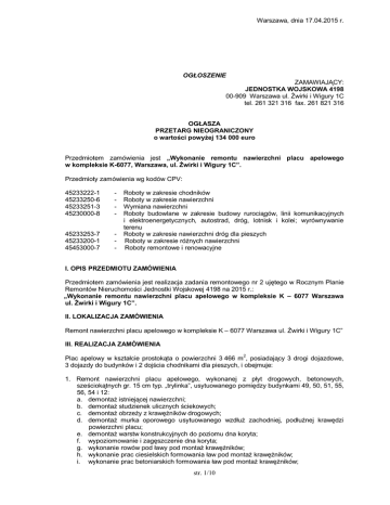 Warszawa, dnia 17.04.2015 r. OGŁOSZENIE ZAMAWIAJĄCY: JEDNOSTKA WOJSKOWA 4198 00-909 Warszawa ul. Żwirki i Wigury 1C tel. 261 321 316 fax. 261 821 316 OGŁASZA PRZETARG NIEOGRANICZONY o wartości powyżej 134 000 euro Przedmiotem zamówienia jest „Wykonanie remontu nawierzchni placu apelowego w kompleksie K-6077, Warszawa, ul. Żwirki i Wigury 1C”. Przedmioty zamówienia wg kodów CPV: 45233222-1 45233250-6 45233251-3 45230000-8 - 45233253-7 45233200-1 45453000-7 - Roboty w zakresie chodników Roboty w zakresie nawierzchni Wymiana nawierzchni Roboty budowlane w zakresie budowy rurociągów, linii komunikacyjnych i elektroenergetycznych, autostrad, dróg, lotnisk i kolei; wyrównywanie terenu Roboty w zakresie nawierzchni dróg dla pieszych Roboty w zakresie różnych nawierzchni Roboty remontowe i renowacyjne I. OPIS PRZEDMIOTU ZAMÓWIENIA Przedmiotem zamówienia jest realizacja zadania remontowego nr 2 ujętego w Rocznym Planie Remontów Nieruchomości Jednostki Wojskowej 4198 na 2015 r.: „Wykonanie remontu nawierzchni placu apelowego w kompleksie K – 6077 Warszawa ul. Żwirki i Wigury 1C”. II. LOKALIZACJA ZAMÓWIENIA Remont nawierzchni placu apelowego w kompleksie K – 6077 Warszawa ul. Żwirki i Wigury 1C” III. REALIZACJA ZAMÓWIENIA Plac apelowy w kształcie prostokąta o powierzchni 3 466 m2, posiadający 3 drogi dojazdowe, 3 dojazdy do budynków i 2 dojścia chodnikami dla pieszych, i obejmuje: 1. Remont nawierzchni placu apelowego, wykonanej z płyt drogowych, betonowych, sześciokątnych gr. 15 cm typ. „trylinka”, usytuowanego pomiędzy budynkami 49, 50, 51, 55, 56, 54 i 12: a. demontaż istniejącej nawierzchni; b. demontaż studzienek ulicznych ściekowych; c. demontaż obrzeży z krawężników drogowych; d. demontaż murka oporowego usytuowanego wzdłuż zachodniej, podłużnej krawędzi powierzchni placu; e. demontaż warstw konstrukcyjnych do poziomu dna koryta; f. wypoziomowanie i zagęszczenie dna koryta; g. wykonanie rowów pod ławy pod montaż krawężników; h. wykonanie prac ciesielskich formowania ław pod montaż krawężników; i. wykonanie prac betoniarskich formowania ław pod montaż krawężników; str. 1/10 j. montaż krawężników drogowych; k. wykonanie warstw konstrukcyjnych podbudowy; l. przeczyszczenie lub naprawa istniejącej sieci kanalizacji ściekowej wzdłuż wschodniej podłużnej krawędzi placu; m. montaż studzienek ulicznych ściekowych; n. montaż podsypki pod powierzchnię z kostki betonowej; o. montaż powierzchni z kostki betonowej. 2. Remont nawierzchni fragmentu drogi dojazdowej do placu apelowego wykonanej z masy asfaltowo – bitumicznej, usytuowanej pomiędzy budynkami 51 i 55: a. demontaż krawężników drogowych jezdni; b. demontaż ław pod krawężnikami drogowymi; c. wykonanie rowów pod ławy pod montaż krawężników; d. wykonanie prac ciesielskich formowania ław pod montaż krawężników; e. wykonanie prac betoniarskich formowania ław pod montaż krawężników; f. montaż krawężników drogowych; g. miejscowa naprawa nierówności powierzchni; h. montaż nowej nawierzchni na całości określonego fragmentu drogi. 3. Remont nawierzchni drogi dojścia do placu apelowego wykonanej z kostki kamiennej łupanej, usytuowanej pomiędzy budynkami 54 i 55: a. demontaż istniejącej nawierzchni; b. demontaż obrzeży drogi; c. demontaż podłoża do poziomu uwzględniającego grubość podsypki i wierzchniej warstwy z kostki; d. zagęszczenie dna podłoża; e. wykonanie rowów pod montaż obrzeży chodnika; f. montaż obrzeży chodnika; g. montaż podsypki pod powierzchnię z kostki betonowej; h. montaż powierzchni z kostki betonowej. IV. OGÓLNE WYMAGANIA Przedmiotem zamówienia są wymagania dotyczące wykonania i odbioru prac remontowych nawierzchni utwardzonych z kostek brukowych betonowych. Sporządzony opis przedmiotu zamówienia to dokument przetargowy niezbędny do przeprowadzenia stosownej procedury i kontraktowy przy zlecaniu i realizacji robót. Ustalenia zawarte w opisie przedmiotu zamówienia dotyczą prowadzenia robót w ramach remontu nawierzchni placu apelowego, fragmentu wewnętrznej drogi dojazdowej kompleksu i chodnika dojścia. Ilości robót do wykonania ujęty jest w przedmiarze robót do wyceny. Określenia podstawowe: nawierzchnie utwardzone - wydzielone i umocnione powierzchnie placu, drogi, lub chodnika przeznaczone dla ruchu pieszego lub samochodowego; betonowa kostka brukowa - kształtka wytwarzana z betonu metodą wibroprasowania, produkowana jako kształtka jednowarstwowa lub w dwóch warstwach połączonych trwale w fazie produkcji; krawężnik betonowy - prefabrykat betonowy, jako oddzielny element lub w połączeniu z innymi elementami, przeznaczony do oddzielania powierzchni znajdujących się na tym samym poziomie lub na różnych poziomach, stosowany w celu ograniczania albo wyznaczania granicy rzeczywistej lub wizualnej oraz jako oddzielenie pomiędzy powierzchniami poddanymi różnym rodzajom ruchu drogowego; obrzeża chodnikowe - prefabrykowane belki betonowe, rozgraniczające jednostronnie lub dwustronnie ciągi komunikacyjne od terenów nie przeznaczonych dla komunikacji; koryto - wykop służący do wbudowania konstrukcyjnych elementów chodnika lub drogi, wykonany zgodnie z projektowanym przekrojem; podłoże - grunt rodzimy lub nasypowy zagęszczony, w którym wykonano koryto placu, drogi lub chodnika; podsypka - warstwa wyrównawcza ułożona na podłożu, mająca za zadanie wyrównanie różnic w grubości warstw materiału zastosowanego do wykonania nawierzchni chodnikowych lub jezdni oraz uzyskanie właściwego spadku nawierzchni. Pozostałe określenia są zgodne z obowiązującymi, odpowiednimi polskimi normami. str. 2/10 V. ZAKRES ROBÓT Zamówienie obejmuje: rozbiórkę nawierzchni istniejącego placu apelowego wykonanej z płyt drogowych, betonowych, sześciokątnych gr. 15 cm typ. „trylinka” usytuowanego pomiędzy 2 budynkami 49, 50, 51, 55, 56, 54 i 12