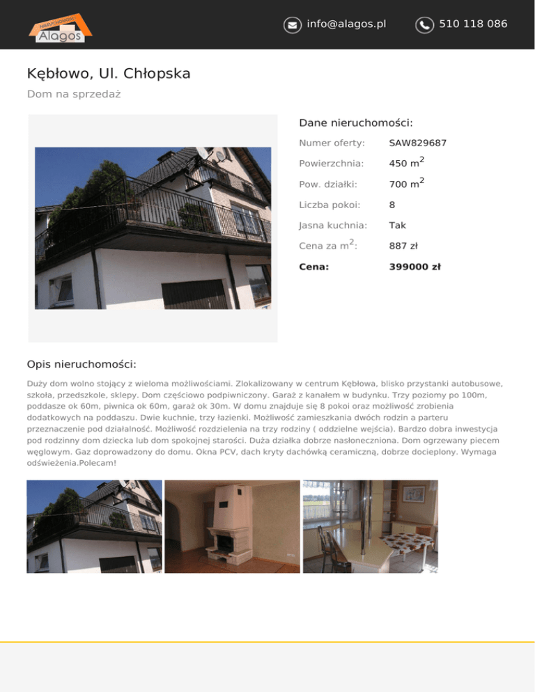[email protected] 510 118 086 Kębłowo, Ul. Chłopska Dom na sprzedaż Dane nieruchomości: Numer oferty: SAW829687 Powierzchnia: 450 m Pow. działki: 700 m Liczba pokoi: 8 Jasna kuchnia: Tak 2 2 2 Cena za m : 887 zł Cena: 399000 zł Opis nieruchomości: Duży dom wolno stojący z wieloma możliwościami. Zlokalizowany w centrum Kębłowa, blisko przystanki autobusowe, szkoła, przedszkole, sklepy. Dom częściowo podpiwniczony. Garaż z kanałem w budynku. Trzy poziomy po 100m, poddasze ok 60m, piwnica ok 60m, garaż ok 30m. W domu znajduje się 8 pokoi oraz możliwość zrobienia dodatkowych na poddaszu. Dwie kuchnie, trzy łazienki. Możliwość zamieszkania dwóch rodzin a parteru przeznaczenie pod działalność. Możliwość rozdzielenia na trzy rodziny ( oddzielne wejścia). Bardzo dobra inwestycja pod rodzinny dom dziecka lub dom spokojnej starości. Duża działka dobrze nasłoneczniona. Dom ogrzewany piecem węglowym. Gaz doprowadzony do domu. Okna PCV, dach kryty dachówką ceramiczną, dobrze docieplony. Wymaga odświeżenia.Polecam! [email protected] 510 118 086