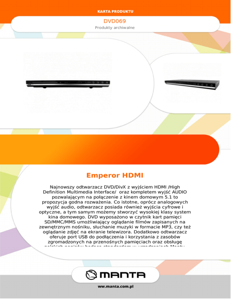 DVD069 Produktyarchiwalne EmperorHDMI NajnowszyodtwarzaczDVD/DivXzwyjściemHDMI/High DefinitionMultimediaInterface/orazkompletemwyjśćAUDIO pozwalającymnapołączeniezkinemdomowym5.1to propozycjagodnarozważenia.Coistotne,opróczanalogowych wyjśćaudio,odtwarzaczposiadarównieżwyjściacyfrowei optyczne,atymsamymmożemystworzyćwysokiejklasysystem kinadomowego.DVDwyposażonowczytnikkartpamięci SD/MMC/MMSumożliwiającyoglądaniefilmówzapisanychna zewnętrznymnośniku,słuchaniemuzykiwformacieMP3,czyteż oglądaniezdjęćnaekranietelewizora.Dodatkowoodtwarzacz oferujeportUSBdopodłączeniaikorzystaniazzasobów zgromadzonychnaprzenośnychpamięciachorazobsługę polskichnapisówbędącąstandardemwurządzeniachManty. DVD069 Produktyarchiwalne Specyfikacja http://www.manta.com.pl/pl/dvd069 EAN:5907642613634