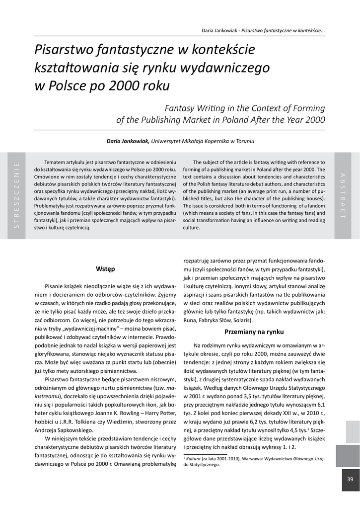 Daria Jankowiak - Pisarstwo fantastyczne w kontekście... Pisarstwo fantastyczne w kontekście kształtowania się rynku wydawniczego w Polsce po 2000 roku Fantasy Writing in the Context of Forming of the Publishing Market in Poland After the Year 2000 Tematem artykułu jest pisarstwo fantastyczne w odniesieniu do kształtowania się rynku wydawniczego w Polsce po 2000 roku. Omówione w nim zostały tendencje i cechy charakterystyczne debiutów pisarskich polskich twórców literatury fantastycznej oraz specyfika rynku wydawniczego (przeciętny nakład, ilość wydawanych tytułów, a także charakter wydawnictw fantastyki). Problematyka jest rozpatrywana zarówno poprzez pryzmat funkcjonowania fandomu (czyli społeczności fanów, w tym przypadku fantastyki), jak i przemian społecznych mających wpływ na pisarstwo i kulturę czytelniczą. Wstęp Pisanie książek nieodłącznie wiąże się z ich wydawaniem i docieraniem do odbiorców-czytelników. Żyjemy w czasach, w których nie rzadko padają głosy przekonujące, że nie tylko pisać każdy może, ale też swoje dzieło przekazać odbiorcom. Co więcej, nie potrzebuje do tego wkraczania w tryby „wydawniczej machiny” – można bowiem pisać, publikować i zdobywać czytelników w internecie. Prawdopodobnie jednak to nadal książka w wersji papierowej jest gloryfikowana, stanowiąc niejako wyznacznik statusu pisarza. Może być więc uważana za punkt startu lub (obecnie) już tylko mety autorskiego piśmiennictwa. Pisarstwo fantastyczne będące pisarstwem niszowym, odróżnianym od głównego nurtu piśmiennictwa (tzw. mainstreamu), doczekało się upowszechnienia dzięki pojawieniu się i popularności takich popkulturowych ikon, jak bohater cyklu książkowego Joanne K. Rowling – Harry Potter, hobbici u J.R.R. Tolkiena czy Wiedźmin, stworzony przez Andrzeja Sapkowskiego. W niniejszym tekście przedstawiam tendencje i cechy charakterystyczne debiutów pisarskich twórców literatury fantastycznej, odnosząc je do kształtowania się rynku wydawniczego w Polsce po 2000 r. Omawianą problematykę The subject of the article is fantasy writing with reference to forming of a publishing market in Poland after the year 2000. The text contains a discussion about tendencies and characteristics of the Polish fantasy literature debut authors, and characteristics of the publishing market (an average print run, a number of published titles, but also the character of the publishing houses). The issue is considered both in terms of functioning of a fandom (which means a society of fans, in this case the fantasy fans) and social transformation having an influence on writing and reading culture. ABSTRACT STRESZCZENIE Daria Jankowiak, Uniwersytet Mikołaja Kopernika w Toruniu rozpatruję zarówno przez pryzmat funkcjonowania fandomu (czyli społeczności fanów, w tym przypadku fantastyki), jak i przemian społecznych mających wpływ na pisarstwo i kulturę czytelniczą. Innymi słowy, artykuł stanowi analizę aspiracji i szans pisarskich fantastów na tle publikowania w sieci oraz realiów polskich wydawnictw publikujących głównie lub tylko fantastykę (np. takich wydawnictw jak: Runa, Fabryka Słów, Solaris). Przemiany na rynku Na rodzimym rynku wydawniczym w omawianym w artykule okresie, czyli po roku 2000, można zauważyć dwie tendencje: z jednej strony z każdym rokiem zwiększa się ilość wydawanych tytułów literatury pięknej (w tym fantastyki), z drugiej systematycznie spada nakład wydawanych książek. Według danych Głównego Urzędu Statystycznego w 2001 r. wydano ponad 3,5 tys. tytułów literatury pięknej, przy przeciętnym nakładzie jednego tytułu wynoszącym 6,1 tys. Z kolei pod koniec pierwszej dekady XXI w., w 2010 r., w kraju wydano już prawie 6,2 tys. tytułów literatury pięknej, a przeciętny nakład tytułu wynosił tylko 4,5 tys.1 Szczegółowe dane przedstawiające liczbę wydawanych książek i przeciętny ich nakład obrazują wykresy 1. i 2. 1 Kultura (za lata 2001-2010), Warszawa: Wydawnictwo Głównego Urzędu Statystycznego. 39 Rynek - Społeczeństwo - Kultura | nr 3/2012 Wykres 1. Liczba wydawanych tytułów literatury pięknej 8 000 6 000 4 973 4 429 4 000 3 523 3 303 2001 2002 5 935 5 884 2008 2009 6 190 5 334 4 782 4 308 2 000 0 2003 2004 2005 2006 2007 2010 Źródło: opracowanie własne na podstawie danych GUS. Choć można przypuszczać, że zmniejszenie nakładu wydawniczego książek wiąże się z pozytywnym dla czytelnika-konsumenta zwiększeniem różnorodności kierowanej do niego przez wydawnictwa oferty, trudno uznać taki stan rzeczy za prostą zależność. Trzeba mieć bowiem na uwadze również to, że w Polsce od lat spada czytelnictwo – potwierdza to cyklicznie ogólnopolskie badanie czytelnictwa realizowane przez Bibliotekę Narodową. W edycji badania z 2000 r. 46% Polaków przyznało, że nie ma kontaktu z książką (jakąkolwiek – pytanie dotyczyło nie tylko beletrystyki, ale również takich książek, jak słowniki czy książki kucharskie). W 2010 r. taki stan rzeczy dotyczył już 10% więcej populacji, czyli 56% Polaków. Spośród mniejszości czytających Polaków, w 2000 r. 46% zadeklarowało dokonanie indywidualnego zakupu książek, a w 2010 r. – kupujący książki stanowili już tylko 38% czytających.2 Przechodząc do fantastyki, według badań Biblioteki Narodowej, w 2010 r. zainteresowanie tego typu książkami deklarowało 10% czytających. Tym samym fantastyka znalazła się na czwartym miejscu zainteresowania poszczególnymi typami beletrystyki (po sensacji, romansie i literaturze wysokoartystycznej).3 Wynik ten nie wydaje się szczególnie imponujący i potwierdza niszowość fantastyki. Stąd też miała szansę zaistnieć sytuacja, gdzie zarówno czytelnictwo, jak i wydawnictwa specjalizujące się w wydawaniu fantastyki, rządzą się niejako własnymi prawami, pozostając w pewnym stopniu w oderwaniu od czytelniczego ogółu. Potwier