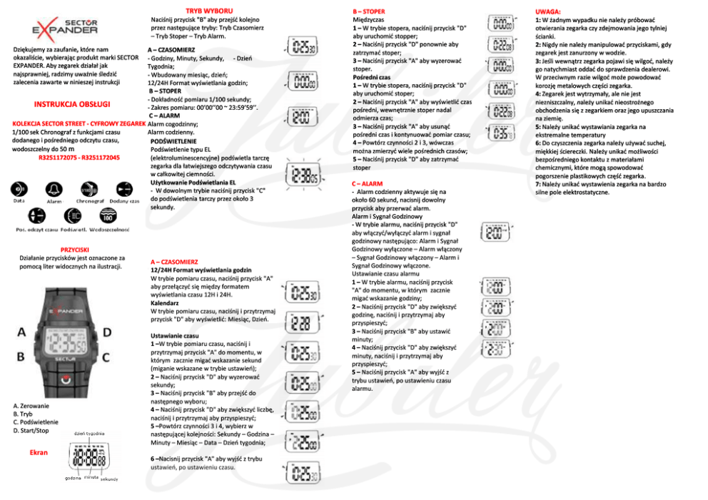 TRYB WYBORU Naciśnij przycisk "B" aby przejść kolejno przez następujące tryby: Tryb Czasomierz – Tryb Stoper – Tryb Alarm. Dziękujemy za zaufanie, które nam okazaliście, wybierając produkt marki SECTOR EXPANDER. Aby zegarek działał jak najsprawniej, radzimy uważnie śledzić zalecenia zawarte w ninieszej instrukcji A – CZASOMIERZ - Godziny, Minuty, Sekundy, - Dzień Tygodnia; - Wbudowany miesiąc, dzień; 12/24H Format wyświetlania godzin; B – STOPER - Dokładność pomiaru 1/100 sekundy; INSTRUKCJA OBSŁUGI - Zakres pomiaru: 00’00’’00 ~ 23:59’59’’. C – ALARM KOLEKCJA SECTOR STREET - CYFROWY ZEGAREK Alarm cogodzinny; 1/100 sek Chronograf z funkcjami czasu Alarm codzienny. dodanego i pośredniego odczytu czasu, PODŚWIETLENIE wodoszczelny do 50 m Podświetlenie typu EL R3251172075 - R3251172045 (elektroluminescencyjne) podświetla tarczę zegarka dla łatwiejszego odczytywania czasu w całkowitej ciemności. Użytkowanie Podświetlania EL - W dowolnym trybie naciśnij przycisk "C" do podświetlenia tarczy przez około 3 sekundy. PRZYCISKI Działanie przycisków jest oznaczone za pomocą liter widocznych na ilustracji. A. Zerowanie B. Tryb C. Podświetlenie D. Start/Stop Ekran A – CZASOMIERZ 12/24H Format wyświetlania godzin W trybie pomiaru czasu, naciśnij przycisk "A" aby przełączyć się między formatem wyświetlania czasu 12H i 24H. Kalendarz W trybie pomiaru czasu, naciśnij i przytrzymaj przycisk "D" aby wyświetlić: Miesiąc, Dzień. Ustawianie czasu 1 –W trybie pomiaru czasu, naciśnij i przytrzymaj przycisk "A" do momentu, w którym zacznie migać wskazanie sekund (miganie wskazane w trybie ustawień); 2 – Naciśnij przycisk "D" aby wyzerować sekundy; 3 – Naciśnij przycisk "B" aby przejść do następnego wyboru; 4 – Naciśnij przycisk "D" aby zwiększyć liczbę, naciśnij i przytrzymaj aby przyspieszyć; 5 –Powtórz czynności 3 i 4, wybierz w następującej kolejności: Sekundy – Godzina – Minuty – Miesiąc – Data – Dzień tygodnia; 6 –Nacisnij przycisk "A" aby wyjść z trybu ustawień, po ustawieniu czasu. B – STOPER Międzyczas 1 – W trybie stopera, naciśnij przycisk "D" aby uruchomić stopper; 2 – Naciśnij przycisk "D" ponownie aby zatrzymać stoper; 3 – Naciśnij przycisk "A" aby wyzerować stoper. Pośredni czas 1 – W trybie stopera, naciśnij przycisk "D" aby uruchomić stoper; 2 – Naciśnij przycisk "A" aby wyświetlić czas pośredni, wewnętrznie stoper nadal odmierza czas; 3 – Naciśnij przycisk "A" aby usunąć pośredni czas i kontynuować pomiar czasu; 4 – Powtórz czynności 2 i 3, wówczas można zmierzyć wiele pośrednich czasów; 5 – Naciśnij przycisk "D" aby zatrzymać stoper C – ALARM - Alarm codzienny aktywuje się na około 60 sekund, nacisnij dowolny przycisk aby przerwać alarm. Alarm i Sygnał Godzinowy - W trybie alarmu, naciśnij przycisk "D" aby włączyć/wyłączyć alarm i sygnał godzinowy następująco: Alarm i Sygnał Godzinowy wyłączone – Alarm włączony – Sygnał Godzinowy włączony – Alarm i Sygnał Godzinowy włączone. Ustawianie czasu alarmu 1 – W trybie alarmu, naciśnij przycisk "A" do momentu, w którym zacznie migać wskazanie godziny; 2 – Naciśnij przycisk "D" aby zwiększyć godzinę, naciśnij i przytrzymaj aby przyspieszyć; 3 – Naciśnij przycisk "B" aby ustawić minuty; 4 – Naciśnij przycisk "D" aby zwiększyć minuty, naciśnij i przytrzymaj aby przyspieszyć; 5 – Naciśnij przycisk "A" aby wyjść z trybu ustawień, po ustawieniu czasu alarmu. UWAGA: 1: W żadnym wypadku nie należy próbować otwierania zegarka czy zdejmowania jego tylniej ścianki. 2: Nigdy nie należy manipulować przyciskami, gdy zegarek jest zanurzony w wodzie. 3: Jeśli wewnątrz zegarka pojawi się wilgoć, należy go natychmiast oddać do sprawdzenia dealerowi. W przeciwnym razie wilgoć może powodować korozję metalowych części zegarka. 4: Zegarek jest wytrzymały, ale nie jest niezniszczalny, należy unikać nieostrożnego obchodzenia się z zegarkiem oraz jego upuszczania na ziemię. 5: Należy unikać wystawiania zegarka na ekstremalne temperatury 6: Do czyszczenia zegarka należy używać suchej, miękkiej ściereczki. Należy unikać możliwości bezpośredniego kontaktu z materiałami chemicznymi, które mogą spowodować pogorszenie plastikowych część zegarka. 7: Należy unikać wystawienia zegarka na bardzo silne pole elektrostatyczne.