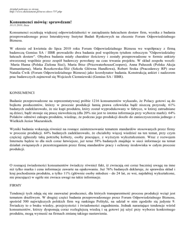 Artykuł pobrany ze strony http://www.ekonsument.pl/news-show-757.php Konsumenci mówią: sprawdzam! 10.11.2010, Zuza Konsumenci oczekują większej odpowiedzialności w zarządzaniu łańcuchem dostaw firm, wynika z badania przeprowadzonego przez Interaktywny Instytut Badań Rynkowych na zlecenie Forum Odpowiedzialnego Biznesu. W okresie od kwietnia do lipca 2010 roku Forum Odpowiedzialnego Biznesu we współpracy z firmą badawczą Gemius SA / IIBR prowadziło dwa badania pod wspólnym tytułem roboczym "Odpowiedzialny łańcuch dostaw". Obydwa badania miały charakter ilościowy i zostały przeprowadzone w formie ankiety stworzonej wspólnie przez zespół badawczy powołany na czas trwania projektu. W skład zespołu weszli: Maria Huma (Polska Zielona Sieć), Maria Ibisz (PricewaterhouseCoopers), Anna Paluszek (Polska Akcja Humanitarna), Maria Roszkowska-Śliż (Szkoła Główna Handlowa), Robert Sroka (Pracodawcy RP) oraz Natalia Ćwik (Forum Odpowiedzialnego Biznesu) jako koordynator badania. Konstrukcją ankiet i nadzorem prac badawczych zajmował się Wojciech Ciemniewski (Gemius SA / IIBR). KONSUMENCI Badanie przeprowadzone na reprezentatywnej próbie 1216 konsumentów wykazało, że Polacy gotowi są do bojkotu producentów, którzy w procesie produkcji łamią prawa człowieka bądź niszczą przyrodę. 61% badanych zadeklarowało, że nie kupi produktu, który został wyprodukowany w fabryce, w której zatrudniane są dzieci, bądź stosuje się pracę niewolniczą (dla 20% nie jest to istotna informacja przy wyborze marki). 64% Polaków odmówi zakupu produktu, wiedząc, że podczas jego produkcji doszło do zanieczyszczenia jednego z Wielkich Jezior Mazurskich. Wyniki badania wskazują również na rosnące zainteresowanie tematem standardów stosowanych przez firmy w procesie produkcji. 64% badanych zadeklarowało, że chciałoby więcej wiedzieć na ten temat, przy czym częściej zgłaszały taką potrzebę kobiety, osoby pracujące, z wyższym wykształceniem. Wraz z rozwojem Internetu będzie to dla nich coraz łatwiejsze, już teraz 58% badanych znajduje w sieci informacje na temat działań związanych z przestrzeganiem przez firmę standardów pracy i ochrony środowiska w całym procesie produkcji. O rosnącej świadomości konsumentów świadczy również fakt, iż zwracają oni coraz baczniej uwagę na inne niż tylko marka i cena informacje zawarte na opakowaniu. Już 76% badanych deklaruje, że sprawdza skład i kraj pochodzenia produktu, a tylko 11% (głównie osoby młodsze - do 24 lat, ze wsi, najsłabiej wykształcone, nie pracujące) w ogóle nie zwraca uwagi na takie informacje. FIRMY Tendencji tych zdają się nie zauważać producenci, dla których transparentność procesu produkcji wciąż jest tematem drażliwym. W drugiej części badania przeprowadzonego przez Forum Odpowiedzialnego Biznesu, spośród 500 największych polskich firm wg rankingu Polityki, na udział w nim zgodziło się jedynie 9. Świadczy to o braku wiedzy, przejrzystości i świadomości zagadnienia. Jednak narastające tendencje wśród konsumentów, którzy dysponują coraz rozleglejszą wiedzą i są gotowi jej użyć przy wyborze konkretnego produktu, mogą wymusić na firmach zmianę takiego nastawienia. Badanie na zlecenie Forum Odpowiedzialnego Biznesu przeprowadzone zostało przez Interaktywny Instytut Badań Rynkowych. Część pierwsza, konsumencka, przeprowadzona została w lipcu 2010 r. na grupie 1216 internautów w wieku 15 i więcej lat. Część druga, przeprowadzona we wrześniu 2010 r. objęła 9 osób odpowiedzialnych za zarządzanie łańcuchem dostaw w swoich firmach. Szczegółowe raporty dostępne z boku. Na podstawie: Forum Odpowiedzialnego Biznesu (http://www.fob.org.pl/badanie-odpowiedzialny-lancuch-dostaw--257_4074.htm)