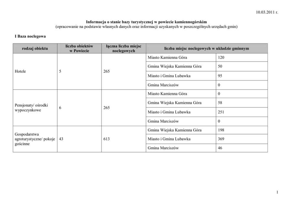 1 10.03.2011 r. Informacja o stanie bazy turystycznej w powiecie