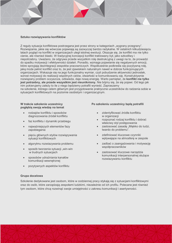 Sztuka rozwiązywania konfliktów Z reguły sytuacja konfliktowa postrzegana jest przez strony w kategoriach „wygrany przegrany”. Rozwiązania, jakie się wówczas pojawiają są zazwyczaj bardzo radykalne. W ostatnich kilkudziesięciu latach pogląd na konflikt w organizacjach uległ istotnej ewolucji. Okazuje się, że konflikt ma nie tylko cienie, ale również blaski. W tradycyjnej koncepcji konflikt traktowany był, jako szkodliwy i niepotrzebny. Uważano, że odgrywa przede wszystkim rolę destrukcyjną z uwagi na to, że prowadzi do spadku motywacji i efektywności działań. Ponadto, wzmaga pojawianie się negatywnych emocji, które sprzyjają dezintegracji zespołów pracowniczych. Współcześnie podkreśla się pozytywną rolę, jaką może pełnić konflikt oraz to, że jest zjawiskiem naturalnym nawet w dobrze funkcjonujących organizacjach. Wskazuje się na jego funkcjonalny wymiar, czyli pobudzenie aktywności jednostek, wzrost motywacji do realizacji wspólnych celów, otwartość w komunikowaniu się. Konstruktywnie rozwiązany problem oczyszcza, odświeża, daje nową energię. Warto pamiętać, że konflikt nie tylko jest potrzebny, ale przede wszystkim jest nieunikniony. Nie bójmy się, że się pojawi. Od tego jak nim pokierujemy zależy to ile z niego będziemy potrafili wynieść. Zapraszamy na szkolenie, którego celem głównym jest przygotowanie praktyczne uczestników do radzenia sobie w sytuacjach konfliktowych na poziomie osobistym i organizacyjnym. W trakcie szkolenie uczestnicy pogłębią swoją wiedzę na temat Po szkoleniu uczestnicy będą potrafili rodzajów konfliktu i sposobów diagnozowania źródeł konfliktu faz konfliktu i dynamiki przebiegu najważniejszych elementów fazy zapobiegania pięciu głównych stylów rozwiązywania sytuacji konfliktowych zdefiniować kluczowe czynniki wpływające na atmosferę w zespole algorytmu rozwiazywania problemu sposób tworzenia sytuacji „win-win w trudnych sytuacjach zadbać o zaangażowania i motywację współpracowników sposobów udrażniania kanałów komunikacji wewnętrznej zastosować kluczowe narzędzia komunikacji interpersonalnej służące rozwiazywaniu konfliktu pozytywnych aspektów konfliktu zidentyfikować źródła konfliktu w organizacji rozpoznać rodzaj konfliktu i dobrać właściwy styl postępowania zastosować zasadę „Miękko do ludzi, twardo do problemu”. Grupa docelowa Szkolenie dedykowane jest osobom, które w codziennej pracy stykają się z sytuacjami konfliktowymi oraz do osób, które zarządzają zespołami ludzkimi, niezależnie od ich profilu. Polecane jest również tym osobom, które chcą rozwinąć swoje umiejętności z zakresu komunikacji i asertywności. Wyślij zapytanie, a przedstawimy Ci szkolenie dostosowane do specyfiki i potrzeb Twojej firmy! Zapraszamy do kontaktu, tel. 22/ 839 55 99 wew. 225 MCS sp. z o.o. sp. k., ul. Czerska 14, 00-732 Warszawa [email protected], www.mcs.edu.pl