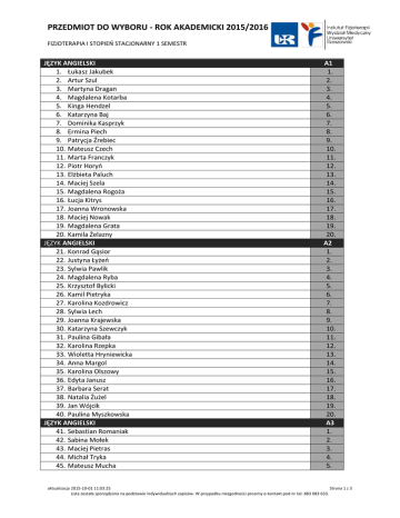 PRZEDMIOT DO WYBORU - ROK AKADEMICKI 2015/2016 FIZJOTERAPIA I STOPIEŃ STACJONARNY 1 SEMESTR JĘZYK ANGIELSKI 1. Łukasz Jakubek 2. Artur Szul 3. Martyna Dragan 4. Magdalena Kotarba 5. Kinga Hendzel 6. Katarzyna Baj 7. Dominika Kasprzyk 8. Ermina Piech 9. Patrycja Źrebiec 10. Mateusz Czech 11. Marta Franczyk 12. Piotr Horyń 13. Elżbieta Paluch 14. Maciej Szela 15. Magdalena Rogoża 16. Łucja Kitrys 17. Joanna Wronowska 18. Maciej Nowak 19. Magdalena Grata 20. Kamila Żelazny JĘZYK ANGIELSKI 21. Konrad Gąsior 22. Justyna Łyżeń 23. Sylwia Pawlik 24. Magdalena Ryba 25. Krzysztof Bylicki 26. Kamil Pietryka 27. Karolina Kozdrowicz 28. Sylwia Lech 29. Joanna Krajewska 30. Katarzyna Szewczyk 31. Paulina Gibała 32. Karolina Rzepka 33. Wioletta Hryniewicka 34. Anna Margol 35. Karolina Olszowy 36. Edyta Janusz 37. Barbara Serat 38. Natalia Żużel 39. Jan Wójcik 40. Paulina Myszkowska JĘZYK ANGIELSKI 41. Sebastian Romaniak 42. Sabina Mołek 43. Maciej Pietras 44. Michał Tryka 45. Mateusz Mucha A1 1. 2. 3. 4. 5. 6. 7. 8. 9. 10. 11. 12. 13. 14. 15. 16. 17. 18. 19. 20. A2 1. 2. 3. 4. 5. 6. 7. 8. 9. 10. 11. 12. 13. 14. 15. 16. 17. 18. 19. 20. A3 1. 2. 3. 4. 5. aktualizacja 2015-10-01 11:03:25 Strona 1 z 3 Lista została sporządzona na podstawie indywidualnych zapisów. W przypadku niezgodności prosimy o kontakt pod nr tel. 883 083 633. PRZEDMIOT DO WYBORU - ROK AKADEMICKI 2015/2016 FIZJOTERAPIA I STOPIEŃ STACJONARNY 1 SEMESTR 46. Grzegorz Błądziński 47. Justyna Jakubek 48. Grzegorz Ciężobka 49. Katarzyna Zając 50. Krystian Mudel 51. Joanna Kopnyk 52. Patrycja Szymaszek 53. Marzena Bylak 54. Barbara Augustyn 55. Patrycja Kmon 56. Kinga Krauz 57. Joanna Czechyra 58. Olaf Wójcik 59. Iga Ciemienga 60. Emilia Łukaszewska JĘZYK ANGIELSKI 61. Anna Gil 62. Aleksandra Łukasiewicz 63. Ewelina Wierdak 64. Szczepan Jakubowicz 65. Agnieszka Pociecha 66. Magdalena Paśko 67. Klaudia Pęcak 68. Emilia Hayder 69. Wioletta Trzeciak 70. Marta Trela 71. Iwona Łakoma 72. Monika Rzucidło 73. Małgorzata Lehan 74. Józef Czerkies 75. Michalina Garbacka 76. Barbara Hennel 77. Wioletta Mazur 78. Izabela Hop 79. Tomasz Kolasa 80. Marzena Kryza JĘZYK ANGIELSKI 81. Arkadiusz Ziarnik 82. Justyna Zagórska 83. Andrzej Sieniawski 84. Daniel Zapasek 85. Mikolaj Gargała 86. Aleksandra Olbrycht 87. Robert Bentkowski 88. Joanna Czaplińska 89. Gabriela Zygmunt 90. Monika Ziółkowska 91. Kinga Stachura 92. Marzena Mól 6. 7. 8. 9. 10. 11. 12. 13. 14. 15. 16. 17. 18. 19. 20. A4 1. 2. 3. 4. 5. 6. 7. 8. 9. 10. 11. 12. 13. 14. 15. 16. 17. 18. 19. 20. A5 1. 2. 3. 4. 5. 6. 7. 8. 9. 10. 11. 12. aktualizacja 2015-10-01 11:03:25 Strona 2 z 3 Lista została sporządzona na podstawie indywidualnych zapisów. W przypadku niezgodności prosimy o kontakt pod nr tel. 883 083 633. PRZEDMIOT DO WYBORU - ROK AKADEMICKI 2015/2016 FIZJOTERAPIA I STOPIEŃ STACJONARNY 1 SEMESTR 93. Natalia Gaweł 94. Małgorzata Rec 95. Martyna Węgrzyniak 96. Kinga Wilk 97. Mikolaj Lichończak JĘZYK ANGIELSKI 98. Karol Drelich 99. Dariusz Midura 100. Oliwia Soboń 101. Anita Zielińska 102. Aleksander Kaźmierczak 103. Anna Fil 104. Justyna Kantor 105. Sylwia Kipczak 106. Bernadetta Mróz 107. Edyta Figiela 108. Angelika Owerko 109. Małgorzata Ogiba 110. Aleksandra Wakurka 111. Miłosz Kubit 112. Magdalena Gardulska 113. Joanna Zdziebko 114. Damian Markowicz 115. Przemysław Świeworski 13. 14. 15. 16. 17. A6 1. 2. 3. 4. 5. 6. 7. 8. 9. 10. 11. 12. 13. 14. 15. 16. 17. 18. JĘZYK NIEMIECKI 1. Łukasz Olszowy 2. Marzena Mól 3. Kinga Stachura 4. Karolina Krawczyk 5. Paweł Gałek 6. Karolina Letniowska 7. Barbara Miś 8. Aleksander Ziobro N1 1. 2. 3. 4. 5. 6. 7. 8. aktualizacja 2015-10-01 11:03:25 Strona 3 z 3 Lista została sporządzona na podstawie indywidualnych zapisów. W przypadku niezgodności prosimy o kontakt pod nr tel. 883 083 633.