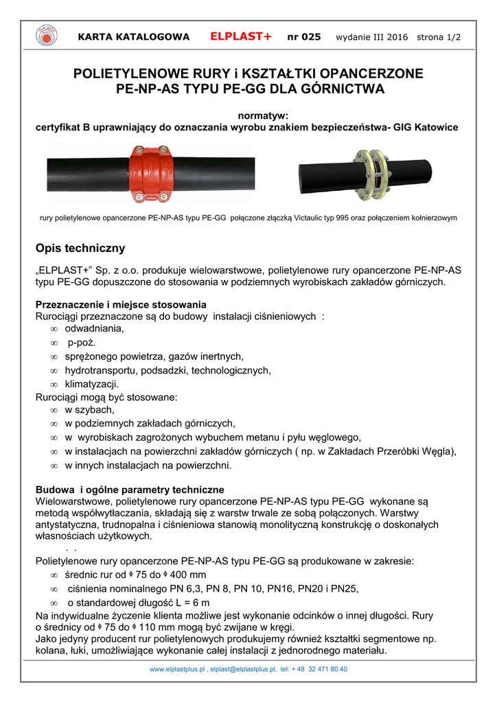 KARTA KATALOGOWA ELPLAST+ nr 025 wydanie III 2016 strona 1/2 POLIETYLENOWE RURY i KSZTAŁTKI OPANCERZONE PE-NP-AS TYPU PE-GG DLA GÓRNICTWA normatyw: certyfikat B uprawniający do oznaczania wyrobu znakiem bezpieczeństwa- GIG Katowice rury polietylenowe opancerzone PE-NP-AS typu PE-GG połączone złączką Victaulic typ 995 oraz połączeniem kołnierzowym Opis techniczny „ELPLAST+” Sp. z o.o. produkuje wielowarstwowe, polietylenowe rury opancerzone PE-NP-AS typu PE-GG dopuszczone do stosowania w podziemnych wyrobiskach zakładów górniczych. Przeznaczenie i miejsce stosowania Rurociągi przeznaczone są do budowy instalacji ciśnieniowych : • odwadniania, • p-poż. • sprężonego powietrza, gazów inertnych, • hydrotransportu, podsadzki, technologicznych, • klimatyzacji. Rurociągi mogą być stosowane: • w szybach, • w podziemnych zakładach górniczych, • w wyrobiskach zagrożonych wybuchem metanu i pyłu węglowego, • w instalacjach na powierzchni zakładów górniczych ( np. w Zakładach Przeróbki Węgla), • w innych instalacjach na powierzchni. Budowa i ogólne parametry techniczne Wielowarstwowe, polietylenowe rury opancerzone PE-NP-AS typu PE-GG wykonane są metodą współwytłaczania, składają się z warstw trwale ze sobą połączonych. Warstwy antystatyczna, trudnopalna i ciśnieniowa stanowią monolityczną konstrukcję o doskonałych własnościach użytkowych. . . Polietylenowe rury opancerzone PE-NP-AS typu PE-GG są produkowane w zakresie: • średnic rur od ᶲ 75 do ᶲ 400 mm • ciśnienia nominalnego PN 6,3, PN 8, PN 10, PN16, PN20 i PN25, • o standardowej długość L = 6 m Na indywidualne życzenie klienta możliwe jest wykonanie odcinków o innej długości. Rury o średnicy od ᶲ 75 do ᶲ 110 mm mogą być zwijane w kręgi. Jako jedyny producent rur polietylenowych produkujemy również kształtki segmentowe np. kolana, łuki, umożliwiające wykonanie całej instalacji z jednorodnego materiału. www.elplastplus.pl , [email protected], tel: + 48 32 471 80 40 KARTA KATALOGOWA ELPLAST+ nr 025 wydanie III 2016 strona 2/2 Sposoby łączenia rur: • mechanicznie złączkami zaciskowymi VICTAULIC typ 995,typ 905 lub łącznikiem kołnierzowym, • połączenia kołnierzowe ( tuleja PE i luźny kołnierz stalowy), • poprzez obejmy z odejściem gwintowanym ( połączenie z armaturą np. z hydrantem ), • przejściem PE/stal, • za pomocą złączek skręcanych (tam, gdzie jest to dopuszczalne). . • zgrzewanie doczołowe, elektrooporowe (tam, gdzie jest to dopuszczalne). Zalety • rury uniwersalne przeznaczone do przesyłu zarówno wody jaki i sprężonego powietrza, • jedyne rurociągi z tworzyw sztucznych , które dają możliwość : o wykonania całego rurociągu z jednorodnego materiału łącznie z kształtkami, o cięcia i połączenia na żądaną długość w miejscu montażu, o zabudowy hydrantu w dowolnym miejscu na rurze ( poprzez obejmy GW ), o gięcia rur bez konieczności stosowania kolan ( duża elastyczność) , • możliwość zastosowanie złączek VICTAULIC znacznie przyspiesza montaż i demontaż, • niskie koszty eksploatacji uzyskane poprzez: o wysoką trwałość rurociągu ( kilkakrotnie wyższa niż rur stalowych), o obniżenie strat przepływu i ciśnienia, o brak korozji, zarastania wewnętrznego, o obniżone koszty transportu, montażu ze względu na niską wagę rur, • wysoka odporność na : o ścieranie (przy hydrotransporcie), o uderzenia i kruche pęknięcia, o odporność na ciecze agresywne chemicznie, solanki, o propagację pęknięć w wyniku uszkodzeń zewnętrznych. Dokumenty związane • • • • • • • • • • • • „DTR -instrukcja stosowania polietylenowych rur i kształtek opancerzonych PE-NP-AS typu PE-GG do budowy rurociągów w zakładach górniczych”,nr EL-71 „Instrukcja montażu złączek Victaulic typ 995 na rurach HDPE”, Nr EL- 36 "Instrukcja montażu złączek typu 905"- IT-905 – źródło Victaulic, (wersja PL) Certyfikat B uprawniający do oznaczania wyrobu znakiem bezpieczeństwa – rury i kształtki opancerzone PE-NP-AS typu PE-GG - GIG Katowice Certyfikat B uprawniający do oznaczania wyrobu znakiem bezpieczeństwa - Złączki żeliwne Victaulic wydanie GIG Katowice Certyfikat B uprawniający do oznaczania wyrobu znakiem bezpieczeństwa – Łączniki rurowe i zawory wydanie KOMAG - Gliwice karty techniczne -Łącznik do rur z HDPE typ S/995- 19.02 -źródło Victaulic karty techniczne -Łącznik do rur z HDPE typ S/905- 19.07 -źródło Victaulic Karta katalogowa ELPLAST nr 045-Obejma żeliwna z odejściem GW2"-typ 3150 deklaracje zgodności nr 30b – rury i kształtki opancerzone PE-NP-AS typu PE-GG deklaracje zgodności nr 26 – złączki żeliwne Victaulic deklaracja zgodności nr 36 - obejmy żeliwne z odejściem GW 2"- typ 3150 www.elplastplus.pl , [email protected], tel: + 48 32 471 80 40