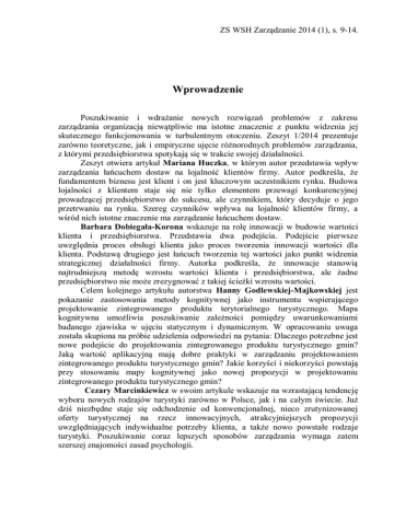 ZS WSH Zarządzanie 2014 (1), s. 9-14. Wprowadzenie Poszukiwanie i wdrażanie nowych rozwiązań problemów z zakresu zarządzania organizacją niewątpliwie ma istotne znaczenie z punktu widzenia jej skutecznego funkcjonowania w turbulentnym otoczeniu. Zeszyt 1/2014 prezentuje zarówno teoretyczne, jak i empiryczne ujęcie różnorodnych problemów zarządzania, z którymi przedsiębiorstwa spotykają się w trakcie swojej działalności. Zeszyt otwiera artykuł Mariana Huczka, w którym autor przedstawia wpływ zarządzania łańcuchem dostaw na lojalność klientów firmy. Autor podkreśla, że fundamentem biznesu jest klient i on jest kluczowym uczestnikiem rynku. Budowa lojalności z klientem staje się nie tylko elementem przewagi konkurencyjnej prowadzącej przedsiębiorstwo do sukcesu, ale czynnikiem, który decyduje o jego przetrwaniu na rynku. Szereg czynników wpływa na lojalność klientów firmy, a wśród nich istotne znaczenie ma zarządzanie łańcuchem dostaw. Barbara Dobiegała-Korona wskazuje na rolę innowacji w budowie wartości klienta i przedsiębiorstwa. Przedstawia dwa podejścia. Podejście pierwsze uwzględnia proces obsługi klienta jako proces tworzenia innowacji wartości dla klienta. Podstawą drugiego jest łańcuch tworzenia tej wartości jako punkt widzenia strategicznej działalności firmy. Autorka podkreśla, że innowacje stanowią najtrudniejszą metodę wzrostu wartości klienta i przedsiębiorstwa, ale żadne przedsiębiorstwo nie może zrezygnować z takiej ścieżki wzrostu wartości. Celem kolejnego artykułu autorstwa Hanny Godlewskiej-Majkowskiej jest pokazanie zastosowania metody kognitywnej jako instrumentu wspierającego projektowanie zintegrowanego produktu terytorialnego turystycznego. Mapa kognitywna umożliwia poszukiwanie zależności pomiędzy uwarunkowaniami badanego zjawiska w ujęciu statycznym i dynamicznym. W opracowaniu uwaga została skupiona na próbie udzielenia odpowiedzi na pytania: Dlaczego potrzebne jest nowe podejście do projektowania zintegrowanego produktu turystycznego gmin? Jaką wartość aplikacyjną mają dobre praktyki w zarządzaniu projektowaniem zintegrowanego produktu turystycznego gmin? Jakie korzyści i niekorzyści powstają przy stosowaniu mapy kognitywnej jako nowej propozycji w projektowaniu zintegrowanego produktu turystycznego gmin? Cezary Marcinkiewicz w swoim artykule wskazuje na wzrastającą tendencję wyboru nowych rodzajów turystyki zarówno w Polsce, jak i na całym świecie. Już dziś niezbędne staje się odchodzenie od konwencjonalnej, nieco zrutynizowanej oferty turystycznej na rzecz innowacyjnych, atrakcyjniejszych propozycji uwzględniających indywidualne potrzeby klienta, a także nowo powstałe rodzaje turystyki. Poszukiwanie coraz lepszych sposobów zarządzania wymaga zatem szerszej znajomości zasad psychologii. ZS WSH Zarządzanie 2014 (1), s. 9-14. Piotr Masiukiewicz prezentuje natomiast problemy ryzyka systemowego dużych korporacji w skali kraju i globalnej oraz możliwe instrumenty ograniczania wzrostu korporacji. Autor wskazuje, że duże korporacje mają zalety, ale i wiele wad. Nowe regulacje zarządzania ryzykiem bankowym w UE oraz w USA będą miały szczególnie szeroki wpływ na działalność i wzrost wartości dużych banków. Budowa regulacji dla dużych korporacji jest ważna dla stabilności gospodarki. Należy jednak uwzględnić, że choć wpływ państwa na gospodarkę jest ważny, to nie powinien być ani za mały, ani za duży. Tematem artykułu Joanny M. Moczydłowskiej jest empowerment, który należy do aktualnych i w wysokim stopniu utylitarnych zagadnień rozpatrywanych na gruncie teorii i praktyki zarządzania ludźmi. Artykuł ma charakter teoriopoznawczy, a jego celem jest systematyzacja wiedzy na temat empowermentu oraz sformułowanie na tej podstawie problemów do dalszych badań naukowych. Małgorzata Smolarek i Joanna Dzieńdziora uważają, że obecnie coraz bardziej zauważalna jest tendencja do wzbogacania narzędzi i metod zarządzania w małych i średnich przedsiębiorstwach. Jest to wynik m.in. coraz częściej organizowanych dla pracowników MŚP szkoleń oraz uruchamiania studiów o kierunkach i specjalnościach dostosowanych do potrzeb praktyki gospodarczej. Szczególny nacisk kładą w artykule na analizę potrzeb rynku pracy w zakresie podnoszenia kwalifikacji pracowników MŚP w obszarze nauk o zarządzaniu. Celem kolejnego artykułu, autorstwa Barbary Kamińskiej, jest zaprezentowanie teorii wyjaśniających mobbing i mechanizmy, na których się opiera, wskazanie przyczyn i skutków jego występowania oraz sposobów jego zwalczania. Autorka, zestawiając wyniki badań z ostatnich dziesięciu lat, wykazuje wzrost zachowań patologicznych w środowisku pracy, które w świetle prawa można zaklasyfikować jako mobbing. Katarzyna Szczepańska-Woszczyna wskazuje, że kreatywność i innowacyjność to działania, za pomocą których przedsiębiorstwo zmierza do sukcesu na rynku, a jednocześnie składniki kompetencji menadżerskich zwiększają skuteczność menedżerów w warunkach dynamicznie zmieniającego się otoczenia. Damian Michalik uważa, że w zarządzaniu zasobami ludzkimi przedsiębiorstwa coraz częściej dostrzega się potrzebę wdrażania nowszych i skuteczniejszych metod motywowania kadr, w celu zwiększania efektywności i poprawy wyników firmy. Menadżerowie przedsiębiorstw w stałym dążeniu do doskonałości i rozwoju swoich firm dostrzegają coraz skuteczniejszy wpływ coachingu na zwiększenie motywacji pracowników, a co za tym idzie – na wzrost dochodów firmy. Skuteczny coaching prowadzi do wizji pożądanych sukcesów, a stąd już tylko krok do ich realizacji. Beata Chmielewiec z kolei zauważa, iż w sytuacji ograniczonej dostępności obcych źródeł pozyskiwania kapitału dla zdecydowanej większości polskich firm i przy jednoczesnej konieczności obniżania (lub przynajmniej niepodwyższania) po