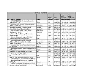 STAN NA 26.06.2008 r. Lp 1 2 3 4 5 6 7 8 9 10 11 12 Nazwa zakładu WIENERBERGER Honoratka, Ceramika Budowlana S.A. Gospodarstwo Hodowlane Joanna Kierzek Krzysztof Kierzek Słodownia Soufflet Polska Sp. z o.o. Cegielnia Cienia I Sieradzcy Sp.J. Gospodarstwo Rolne - Ferma Drobiu Krzysztof Pachura Hodowla Drobiu Rzeźnego Genowefa Grochulska Miejska Energetyka Cieplna Spółka z ograniczoną odpowiedzialnością Ferma Drobiu TOPFERM - Ireneusz Sobczak/ferma w m.Topola Osiedle AMI spółka jawna Gospodarstwo Rolne Ferma Drobiu Roman Jęśkowiak Ferma Drobiu Jacek Stachowiak/Ferma w m. Niesłabin Ferma Drobiu, Gałęzowski Stanisław Philips Lighting Poland S.A. 13 14 DROP S.A. Zakład Drobiarski w Kępnie Zakład Rolniczo - Przemysłowy FARMUTIL HS Śmiłowo/Zakład Utylizacji Odpadów 15 PILUTIL Zakłady Drobiarskie "Koziegłowy" Sp. z o.o., 16 ferma drobiu w Heliodorowie Data Data wydania ważności pozwolenia pozwolenia Miasto Branże z Data instalacji złożenia Konin 3.5 2006-02-10 2006-08-24 2016-08-18 Szamotuły Poznań Opatówek Murzynowo Kościelne 6.8 a) 6.5 b) 3.5 2015-01-01 2007-07-02 2007-04-30 2008-04-16 2018-04-16 2007-09-11 2017-09-11 6.8 a) 2005-12-30 2006-08-04 2016-08-07 Skulsk 6.8 a) 2007-04-01 2007-12-12 2017-12-12 1 2006-06-12 2006-11-27 2016-11-26 Piła Przygodzice Mikstat 6.8 a) 6.4 2005-12-05 2007-01-12 2007-10-25 2007-04-16 2017-10-25 2017-03-31 Wijewo 6.8 a) 2006-03-01 2006-10-20 2016-09-30 Złotniki Obra 6.8 a) 6.8 a) 2006-03-24 2005-01-09 2007-10-12 2006-11-07 2017-10-12 2016-11-10 Piła Kępno 5.1, 3.3 6.4 2006-08-29 2006-02-06 2006-03-09 2007-09-28 2007-09-28 2006-10-10 2017-09-28 2017-09-28 2016-10-10 Kaczory 6.7 2005-10-25 2005-12-28 2015-12-31 Koziegłowy 6.8 a) 2004-03-18 2005-02-28 2015-02-28 PRIMA Sp. z o.o., Zakład Produkcji Trzody 17 Chlewnej w Turostowie Gospodarstwo Rolne Hodowla Drobiu 18 Małgorzata i Roman Chlasta Ferma Drobiu Małgorzata i Mirosław 19 Frąckowiak System Gazociągów Tranzytowych EuroPolGaz S.A., Tłocznia Gazu w 20 Szamotułach METALPLAST LOB S.A. z siedzibą w 21 Lesznie Przedsiębiorstwo Rolno - Produkcyjne 22 "Kobylniki" sp. z o.o. Produkcja Materiałów Budowlanych 23 W.Rachwał - Cegielnia Klapki Spółdzielnia Mleczarska - Zakład Główny w 24 Gostyniu Zakłady Drobiarskie "Koziegłowy" Sp. z o.o., 25 ferma drobiu w Kadłubku 26 SANITEC KOŁO Sp. z o.o. 27 Przedsiębiorstwo ADROS Sp. z o.o. Pfeifer & Langen Polska S.A. - Cukrownia 28 "Gosławice" 29 Cegielnia Podzamcze/Marek Długaszewski Przedsiębiorstwo Produkcyjno – Handlowo - Usługowe „GAP” 30 Sp. z o.o. Czaplinek Nowe Skalmierzyce 6.8 b) 2005-05-04 2006-04-28 2016-04-28 6.8 a) 2005-11-29 2006-10-18 2016-10-18 Sieraków 6.8 a) 2006-02-28 2006-10-16 2016-10-16 1 2005-02-10 2005-05-27 2015-05-27 Warszawa Leszno 2.7 2007-06-06 2007-12-10 2017-12-10 Obrzycko 6.8 a) 2006-02-06 2006-09-06 2016-09-06 Grabów n/Prosną 3.5 2006-03-03 2006-10-04 2016-06-30 Gostyń 6.6 2006-03-24 2006-10-05 2016-08-31 Koziegłowy Koło Dobrzyca 2005-02-07 2007-04-20 2004-12-30 2015-02-07 2017-04-20 2014-01-14 Konin Kepno 6.8 a) 2004-03-18 3.5 2007-01-01 6.4 2004-04-21 1, 3.1, 6.5 b) 2006-05-31 3.5 2006-12-28 2006-10-18 2007-05-21 2015-12-31 2017-05-20 Swarzędz 6.8 a) 2005-01-01 2006-10-25 2016-10-25 6.8 a) 2004-07-12 2004-12-07 2014-12-07 5.4 2007-03-02 2007-07-10 2017-07-10 6.4 2005-12-16 2006-10-09 2016-09-30 Specjalistyczne Gospodarstwo Rolne Ferma 31 Drobiu - Sprzedaż Jaj Mariusz Pachura Chocicza Przedsiębiorstwo Gospodarki Komunalnej i Mieszkaniowej Sp. z o.o./ Składowisko 32 odpadów w m. Uścikowiec / kwatera nr I Oborniki „ZAKŁADY DROBIARSKIE 33 LANGNER” Spółka z o.o. Miejska Górka 34 35 36 37 38 39 40 41 42 43 44 45 46 47 48 49 50 51 52 53 54 Przedsiębiorstwo Pfeifer & Langen „Polska” S.A/.Cukrownia „Miejska Górka" OXYTOP Sp. z o.o. GOSPODARSTWO ROLNE I FERMA DROBIU Józef Rimke Gospodarstwo Rolne Jarosław Janiszewski Przedsiębiorstwo Energetyki Cieplnej Sp. z o.o. w Gnieźnie, Ciepłownia C-13 Zakłady Drobiarskie Koziegłowy Sp. z o.o. Ferma Drobiu "Szamocin" Zakład Oczyszczania i Gospodarki Odpadami MZO SA w Ostrowie Wlkp. Ferma Drobiu Jakub Jokiel w m. Wroniawy Ferma Brojlerów w Śmiardowie Krajeńskim Ferma Drobiu Zbigniew Woźniak Metalplast - System Spółka z o. o. Gospodarstwo Rolne Dr Sławomir Piasecki Ferma Drobiu w Kajewie PHU "ROL-BIG" Sp. z o.o. w Brzeźnie Ferma Brojlerów Kurzych w Bronisławkach Gospodarstwo Rolne FARMEX Małgorzata Dąbrowska/ Ferma Drobiu Przedsiębiorstwo Wielobranżowe "Gallus" Sp. z o. o. Ferma drobiu - brojlery Zakład Utylizacji Odpadów CLEAN CITY Sp. z o.o. Ferma Drobiu - Brojlerów Zbigniew Tomiak, m. Zamysłowo OWENS ILLINOIS POLSKA S.A./Zakład Produkcyjny Huta Szkła Antoninek Sapa Aluminium Sp. z o.o. Ferma Drobiu Wioleta Łukaszewska i Edward Roszak Poznań Stęszew 1, 6.5 b), 3.1 4.1 Wijewo 6.8 a) Murowana Goślina 6.8 b) Gniezno 2006-04-07 2004-12-27 2006-09-11 2004-12-31 2015-12-31 2014-12-31 2006-06-30 2005-06-30 2007-03-19 2006-09-29 2017-02-28 2016-09-29 1 2005-11-29 2006-06-29 2016-06-28 Koziegłowy Ostrów Wielkopolski Wolsztyn Krajenka Rawicz Wrocław 6.8 a) 2004-11-29 2004-11-30 2014-11-30 5.4 6.8 a) 6.8 a) 6.8 a) 2.7 2004-07-10 2006-01-12 2004-04-01 2004-12-02 2006-09-29 2005-01-31 2007-07-06 2004-12-21 2005-02-04 2007-05-16 2015-01-31 2017-07-05 2014-12-21 2015-01-31 2017-05-16 Gołuchów 6.8 a) 2005-12-21 2006-05-12 2016-05-12 Czarnków 6.8 a) 2004-12-20 2004-12-21 2014-12-21 Wągrowiec 6.8 a) 2007-05-29 2007-10-19 2017-10-19 Brodnica Słupca 6.8 a) 6.8 a) 2005-10-14 2004-11-22 2006-08-30 2004-12-23 2016-08-31 2014-12-30 Międzychód 5.4 2004-11-18 2004-11-30 2014-11-30 Stęszew 6.8 a) 2005-12-12 2006-04-28 2016-04-30 Poznań Trzcianka 3.3 2.7 2006-06-29 2005-08-10 2007-03-01 2005-12-30 2017-01-31 2015-12-30 Opalenica 6.8 a) 2005-11-29 2006-03-15 2016-03-16 55 Ferma Drobiu Jerzy Zieliński Krotoszyńskie Przedsiębiorstwo Ceramiki Budowlanej CERABUD S.A./ Wydział 56 Ceramiczny KROTOSZYN 57 F