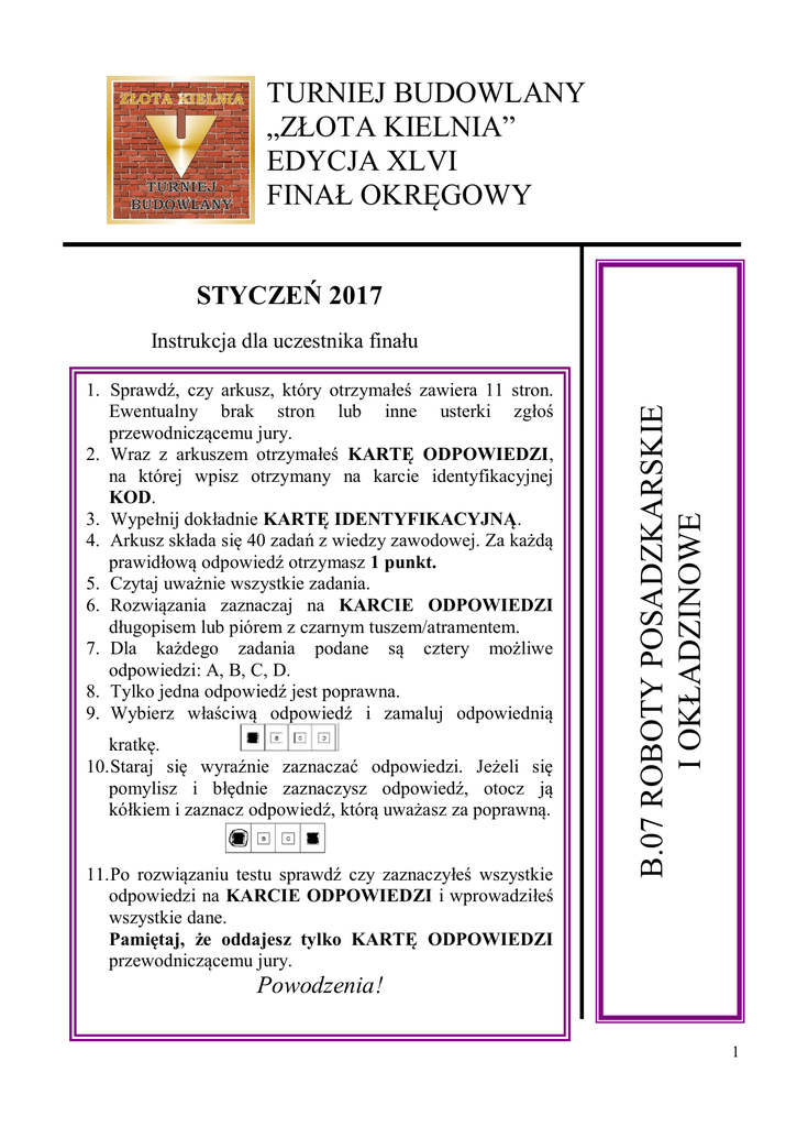 TURNIEJ BUDOWLANY „ZŁOTA KIELNIA” EDYCJA XLVI FINAŁ OKRĘGOWY STYCZEŃ 2017 1. Sprawdź, czy arkusz, który otrzymałeś zawiera 11 stron. Ewentualny brak stron lub inne usterki zgłoś przewodniczącemu jury. 2. Wraz z arkuszem otrzymałeś KARTĘ ODPOWIEDZI, na której wpisz otrzymany na karcie identyfikacyjnej KOD. 3. Wypełnij dokładnie KARTĘ IDENTYFIKACYJNĄ. 4. Arkusz składa się 40 zadań z wiedzy zawodowej. Za każdą prawidłową odpowiedź otrzymasz 1 punkt. 5. Czytaj uważnie wszystkie zadania. 6. Rozwiązania zaznaczaj na KARCIE ODPOWIEDZI długopisem lub piórem z czarnym tuszem/atramentem. 7. Dla każdego zadania podane są cztery możliwe odpowiedzi: A, B, C, D. 8. Tylko jedna odpowiedź jest poprawna. 9. Wybierz właściwą odpowiedź i zamaluj odpowiednią kratkę. 10. Staraj się wyraźnie zaznaczać odpowiedzi. Jeżeli się pomylisz i błędnie zaznaczysz odpowiedź, otocz ją kółkiem i zaznacz odpowiedź, którą uważasz za poprawną. 11. Po rozwiązaniu testu sprawdź czy zaznaczyłeś wszystkie odpowiedzi na KARCIE ODPOWIEDZI i wprowadziłeś wszystkie dane. Pamiętaj, że oddajesz tylko KARTĘ ODPOWIEDZI przewodniczącemu jury. B.07 ROBOTY POSADZKARSKIE I OKŁADZINOWE Instrukcja dla uczestnika finału Powodzenia! 1 Zadanie 1. Obiekt budowlany przedstawiony na rysunku to budynek A. zamieszkania zbiorowego. B. użyteczności publicznej. C. przemysłowy. D. mieszkalny. Zadanie 2. Podkład w podłodze jest to element, na którym bezpośrednio układa się A. izolację przeciwwilgociową lub paroszczelną. B. izolację cieplną lub akustyczną. C. warstwę ochronną. D. posadzkę. Zadanie 3. Nadanie określonego spadku w podłodze wykonuje się w A. warstwie wyrównawczej. B. podkładzie. C. posadzce. D. podłożu. Zadanie 4. Na gromadzenie się ładunków elektryczności statycznej najbardziej narażone są posadzki wykonane z A. materiałów mineralnych. B. tworzyw sztucznych. C. włókien naturalnych. D. drewna. Zadanie 5. Urządzenie przedstawione na rysunku to A. zacieraczka do betonu. B. cykliniarka. C. szlifierka. D. strugarka. 2 Zadanie 6. Dobierając uziarnienie kruszywa należy kierować się zasadą, że stosunek średnicy największego ziarna kruszywa do wysokości podkładu nie powinien być większe niż A. 1/2. B. 1/3. C. 1/4. D. 1/5. Zadanie 7. Do podkładów monolitycznych ze spoiwem cementowym dodaje się tyle wody, aby uzyskać konsystencję A. plastyczną. B. wilgotną. C. ciekłą. D. sypką. Zadanie 8. Ile kg cementu należy dodać do przygotowania mieszanki betonowej o proporcjach 1 : 1,5 : 3 jeśli użyto 600 kg piasku? A. 300 kg. B. 200 kg. C. 150 kg. D. 100 kg. Zadanie 9. Przy wykonaniu powłoki gruntującej z roztworu asfaltowego o konsystencji rzadkiej zużycie emulsji wynosi 0,6 kg / m2. Ilość emulsji potrzebna do dwukrotnego zagruntowania powierzchni o wymiarach 20 x 5 metrów wynosi: A. 200 kg. B. 150 kg. C. 120 kg. D. 100 kg. 3 Zadanie 10. Przyklejenie deszczułek o normowej wilgotności do zbyt wilgotnego podkładu spowoduje A. oderwanie skrajnych listewek od podkładu. B. łuszczenie powłoki lakierowej. C. powstanie zbyt grubych spoin. D. wybrzuszenie się posadzki. Zadanie 11. Na rysunku numerem 5 oznaczono A. izolację przeciwdźwiękową. B. płytę mozaikową. C. podkład. D. strop. Zadanie 12. Posadzka składająca się z drobnowymiarowych, luźno zestawionych obok siebie listewek przyklejonych do mocnego podkładu to posadzka z A. ceramicznych płytek mozaikowych. B. płyt mozaikowych. C. desek sosnowych. D. deszczułek. Zadanie 13. Przy układaniu skośnym pod kątem 45 stopni posadzki z płyt klejonych, pracę należy rozpocząć od A. środka pomieszczenia, na skrzyżowaniu jego osi. B. ściany przeciwległej do drzwi wejściowych. C. najdłuższej ściany pomieszczenia. D. dowolnego naroża. 4 Zadanie 14. Legary pod podłogę z nawierzchnią z desek układa się w rozstawie A. 85 - 90 cm. B. 65 - 70 cm. C. 45 - 50 cm. D. 35 - 45 cm. Zadanie 15. Podkład pod posadzki z PVC po przyłożeniu łaty kontrolnej długości 2 m nie powinien wykazywać prześwitów między nią a podkładem większych niż A. 4 mm. B. 3 mm. C. 2 mm. D. 1 mm. Zadanie 16. W czasie wykonywania posadzki z tworzyw sztucznych temperatura w pomieszczeniu powinna wnosić co najmniej A. 20oC. B. 15oC. C. 10oC. D. 5oC. Zadanie 17. Zdjęcie przedstawia A. spoinowanie płytek ceramicznych. B. zszywanie wykładzin. C. spawanie wykładzin. D. barwienie spoin. Zadanie 18 Przy układaniu arkuszy wykładziny z PCV bez warstwy izolacyjnej, układ arkuszy wykładziny powinien być A. prostopadły do najdłuższej ściany. B. równoległy do najdłuższej ściany. C. prostopadły do ściany okiennej. D. równoległy do ściany okiennej. 5 Zadanie 19. Wykonanie obmiaru posadzki z płytek ceramicznych polega na obliczeniu A. powierzchni i obwodu posadzki. B. powierzchni posadzki. C. ilości płytek i kleju. D. ilości płytek Zadanie 20. Worki z zaprawą spoinującą na budowie należy przechowywać A. w magazynach półotwartych. B. na składowiskach otwartych. C. w magazynach zamkniętych. D. w silosach. Zadanie 21. Zgodnie z poniższym fragmentem Specyfikacji Technicznej Wykonania i Odbioru Robót, posadzkę z płyt kamiennych należy wykonywać po zakończeniu A. robót instalacyjnych w temperaturze nie niższej niż 5 oC. B. robót malarskich w temperaturze nie niższej niż 5 oC. C. robót instalacyjnych w temperaturze niższej niż 5 oC. D. robót malarskich w temperaturze niższej niż 5oC. Zadanie 22. Przyklejenie wykładzin z PVC klejami kontaktowymi polega na A. wykorzystaniu właściwości samoprzylepnych wykładzin naniesionych fabrycznie. B. nakładaniu kleju na obie sklejane powierzchnie. C. nakładaniu kleju na arkusz wykładziny. D. nakładaniu kleju na podkład. 6 Zadanie 23. Podaj ile sztuk płytek 20 x 20 cm, bez uwzględniania zapasu na ubytki, potrzeba do oblicowania ściany o powierzchni 10 m2. A. 200 szt. B. 225 szt. C. 250 szt. D. 255