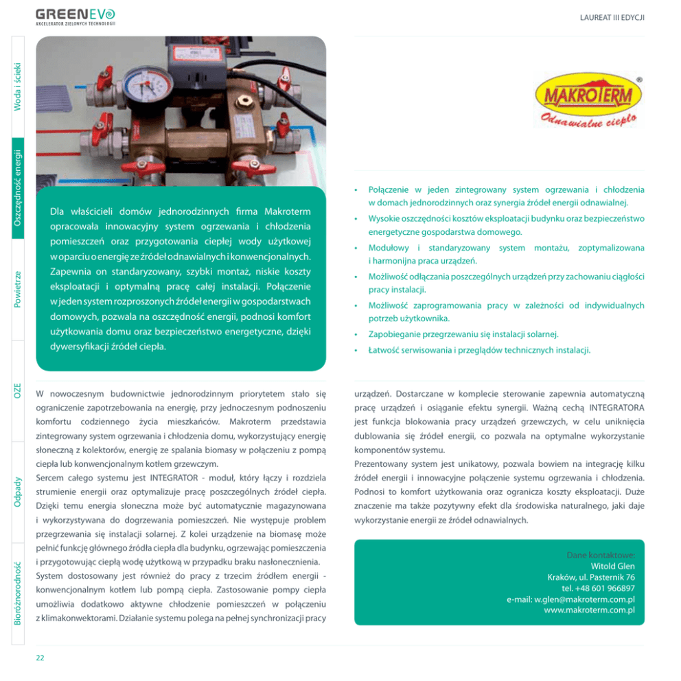 Oszczędność energii Woda i ścieki LAUREAT III EDYCJI • Połączenie w jeden zintegrowany system ogrzewania i chłodzenia Odpady OZE Powietrze Dla właścicieli domów jednorodzinnych firma Makroterm opracowała innowacyjny system ogrzewania i chłodzenia pomieszczeń oraz przygotowania ciepłej wody użytkowej w oparciu o energię ze źródeł odnawialnych i konwencjonalnych. Zapewnia on standaryzowany, szybki montaż, niskie koszty eksploatacji i optymalną pracę całej instalacji. Połączenie w jeden system rozproszonych źródeł energii w gospodarstwach domowych, pozwala na oszczędność energii, podnosi komfort użytkowania domu oraz bezpieczeństwo energetyczne, dzięki dywersyfikacji źródeł ciepła. w domach jednorodzinnych oraz synergia źródeł energii odnawialnej. • Wysokie oszczędności kosztów eksploatacji budynku oraz bezpieczeństwo energetyczne gospodarstwa domowego. • Modułowy i standaryzowany system montażu, zoptymalizowana i harmonijna praca urządzeń. • Możliwość odłączania poszczególnych urządzeń przy zachowaniu ciągłości pracy instalacji. • Możliwość zaprogramowania pracy w zależności od indywidualnych potrzeb użytkownika. • Zapobieganie przegrzewaniu się instalacji solarnej. • Łatwość serwisowania i przeglądów technicznych instalacji. W nowoczesnym budownictwie jednorodzinnym priorytetem stało się urządzeń. Dostarczane w komplecie sterowanie zapewnia automatyczną ograniczenie zapotrzebowania na energię, przy jednoczesnym podnoszeniu pracę urządzeń i osiąganie efektu synergii. Ważną cechą INTEGRATORA komfortu przedstawia jest funkcja blokowania pracy urządzeń grzewczych, w celu uniknięcia zintegrowany system ogrzewania i chłodzenia domu, wykorzystujący energię codziennego życia mieszkańców. Makroterm dublowania się źródeł energii, co pozwala na optymalne wykorzystanie słoneczną z kolektorów, energię ze spalania biomasy w połączeniu z pompą komponentów systemu. ciepła lub konwencjonalnym kotłem grzewczym. Prezentowany system jest unikatowy, pozwala bowiem na integrację kilku Sercem całego systemu jest INTEGRATOR - moduł, który łączy i rozdziela źródeł energii i innowacyjne połączenie systemu ogrzewania i chłodzenia. strumienie energii oraz optymalizuje pracę poszczególnych źródeł ciepła. Podnosi to komfort użytkowania oraz ogranicza koszty eksploatacji. Duże Dzięki temu energia słoneczna może być automatycznie magazynowana znaczenie ma także pozytywny efekt dla środowiska naturalnego, jaki daje i wykorzystywana do dogrzewania pomieszczeń. Nie występuje problem wykorzystanie energii ze źródeł odnawialnych. przegrzewania się instalacji solarnej. Z kolei urządzenie na biomasę może Bioróżnorodność pełnić funkcję głównego źródła ciepła dla budynku, ogrzewając pomieszczenia i przygotowując ciepłą wodę użytkową w przypadku braku nasłonecznienia. System dostosowany jest również do pracy z trzecim źródłem energii konwencjonalnym kotłem lub pompą ciepła. Zastosowanie pompy ciepła umożliwia dodatkowo aktywne chłodzenie pomieszczeń w połączeniu z klimakonwektorami. Działanie systemu polega na pełnej synchronizacji pracy 22 Dane kontaktowe: Witold Glen Kraków, ul. Pasternik 76 tel. +48 601 966897 e-mail: [email protected] www.makroterm.com.pl