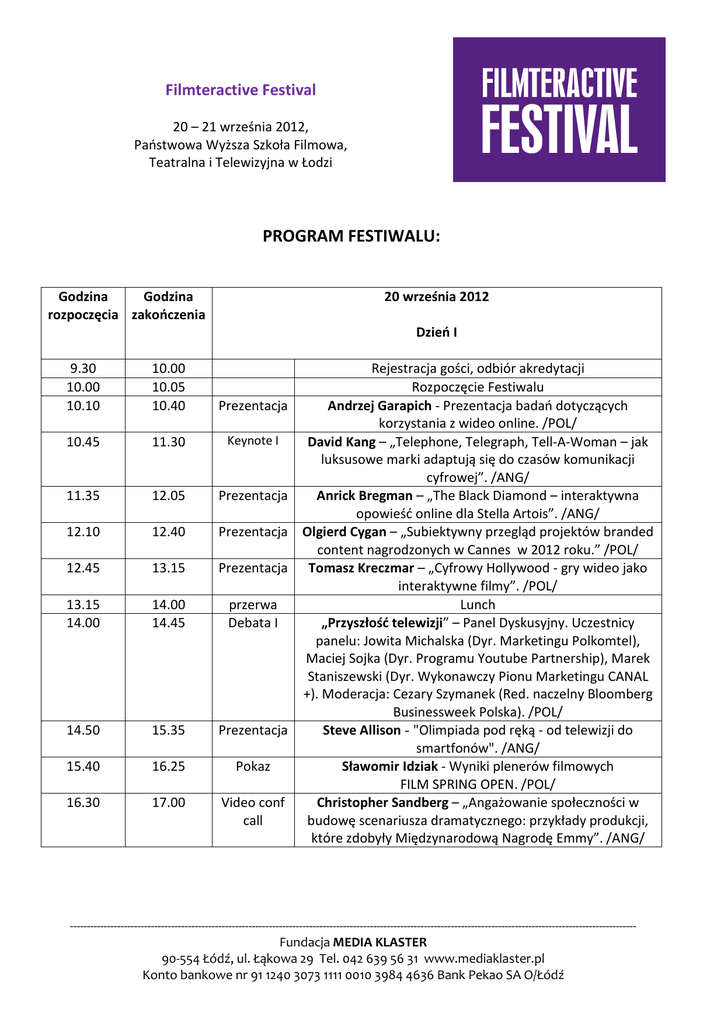 Filmteractive Festival 20 – 21 września 2012, Państwowa Wyższa Szkoła Filmowa, Teatralna i Telewizyjna w Łodzi PROGRAM FESTIWALU: Godzina Godzina rozpoczęcia zakończenia 20 września 2012 Dzień I 9.30 10.00 10.10 10.00 10.05 10.40 Prezentacja 10.45 11.30 Keynote I 11.35 12.05 Prezentacja 12.10 12.40 Prezentacja 12.45 13.15 Prezentacja 13.15 14.00 14.00 14.45 przerwa Debata I 14.50 15.35 Prezentacja 15.40 16.25 Pokaz 16.30 17.00 Video conf call Rejestracja gości, odbiór akredytacji Rozpoczęcie Festiwalu Andrzej Garapich - Prezentacja badań dotyczących korzystania z wideo online. /POL/ David Kang – „Telephone, Telegraph, Tell-A-Woman – jak luksusowe marki adaptują się do czasów komunikacji cyfrowej”. /ANG/ Anrick Bregman – „The Black Diamond – interaktywna opowieść online dla Stella Artois”. /ANG/ Olgierd Cygan – „Subiektywny przegląd projektów branded content nagrodzonych w Cannes w 2012 roku.” /POL/ Tomasz Kreczmar – „Cyfrowy Hollywood - gry wideo jako interaktywne filmy”. /POL/ Lunch „Przyszłość telewizji” – Panel Dyskusyjny. Uczestnicy panelu: Jowita Michalska (Dyr. Marketingu Polkomtel), Maciej Sojka (Dyr. Programu Youtube Partnership), Marek Staniszewski (Dyr. Wykonawczy Pionu Marketingu CANAL +). Moderacja: Cezary Szymanek (Red. naczelny Bloomberg Businessweek Polska). /POL/ Steve Allison - "Olimpiada pod ręką - od telewizji do smartfonów". /ANG/ Sławomir Idziak - Wyniki plenerów filmowych FILM SPRING OPEN. /POL/ Christopher Sandberg – „Angażowanie społeczności w budowę scenariusza dramatycznego: przykłady produkcji, które zdobyły Międzynarodową Nagrodę Emmy”. /ANG/ -----------------------------------------------------------------------------------------------------------------------------------------------------------------------Fundacja MEDIA KLASTER 90-554 Łódź, ul. Łąkowa 29 Tel. 042 639 56 31 www.mediaklaster.pl Konto bankowe nr 91 1240 3073 1111 0010 3984 4636 Bank Pekao SA O/Łódź Godzina Godzina rozpoczęcia zakończenia 21 września 2012 Dzień II 9.25 9.30 Wprowadzenie do crowdsourcingu 9.35 10.20 Prezentacja Helena Granqvist – ”Granny’s Dancing On The Table – transmedia&crowdfunding”. /ANG/ 10.25 11.10 Debata II 11.15 11.45 Pokaz „Crowdsourcing & crowdfunding” – Panel Dyskusyjny. Uczestnicy panelu: Tomasz Kurzątkowski (MillionYou.com), Mariusz Drożdż (Megatotal.pl). Moderacja: Olgierd Porębski, prezes Polskiego Towarzystwa Crowdfundingu. /POL/ Shoot the Brand – pokaz nagrodzonych filmów konkursowych. /POL/ 11.50 12.35 Keynote II Jak marka Pepsi wykorzystuje różne formaty i treści w swoich działań marketingowych? /ANG/ 12.40 13.15 13.10 14.00 Prezentacja Przerwa TBC Lunch 14.05 14.50 Prezentacja Yomi Ayeni – Clockwork Watch (pokaz projektu transmedialnego). /ANG/ 14.25 14.55 Prezentacja Mariusz Stecki – „Konwergencja mediów -projekty multiplatformowe”. /POL/ 15.00 15.30 Prezentacja Dorota Szostek – „Videoblogging – miliony oglądających nie mogą się mylić!”. /POL/ 15.35 16.05 Prezentacja Marcin Jaśkiewicz - „Telewizja nie tylko w telewizji”./POL/ 16.10 16.55 Debata III „Legalność w Sieci” – Panel Dyskusyjny. Uczestnicy panelu: Kamil Przełęcki (Dyrektor ds. rozwoju i konwergencji multimediów Agora), Gabriela Zoltaniecka (Prezes Fundacji Legalna Kultura), Piotr Hałasiewicz (Rzecznik serwisu Chomikuj.pl). Moderacja: Sergiusz Wasilewski, Magazyn Purpose. /POL/ Organizatorzy zastrzegają sobie prawo do ustalenia zmian w przebiegu festiwalu z uzasadnionych powodów, w tym prawo do zmiany terminów oraz kolejności prezentacji i debat. Ewentualna modyfikacja programu festiwalu nie będzie podstawą do żadnej rekompensaty z tego tytułu, w tym do zwrotu kosztów wejścowek. UWAGA! Część wystąpień odbywać się będzie w języku angielskim. Nie przewidujemy tłumaczeń. -----------------------------------------------------------------------------------------------------------------------------------------------------------------------Fundacja MEDIA KLASTER 90-554 Łódź, ul. Łąkowa 29 Tel. 042 639 56 31 www.mediaklaster.pl Konto bankowe nr 91 1240 3073 1111 0010 3984 4636 Bank Pekao SA O/Łódź