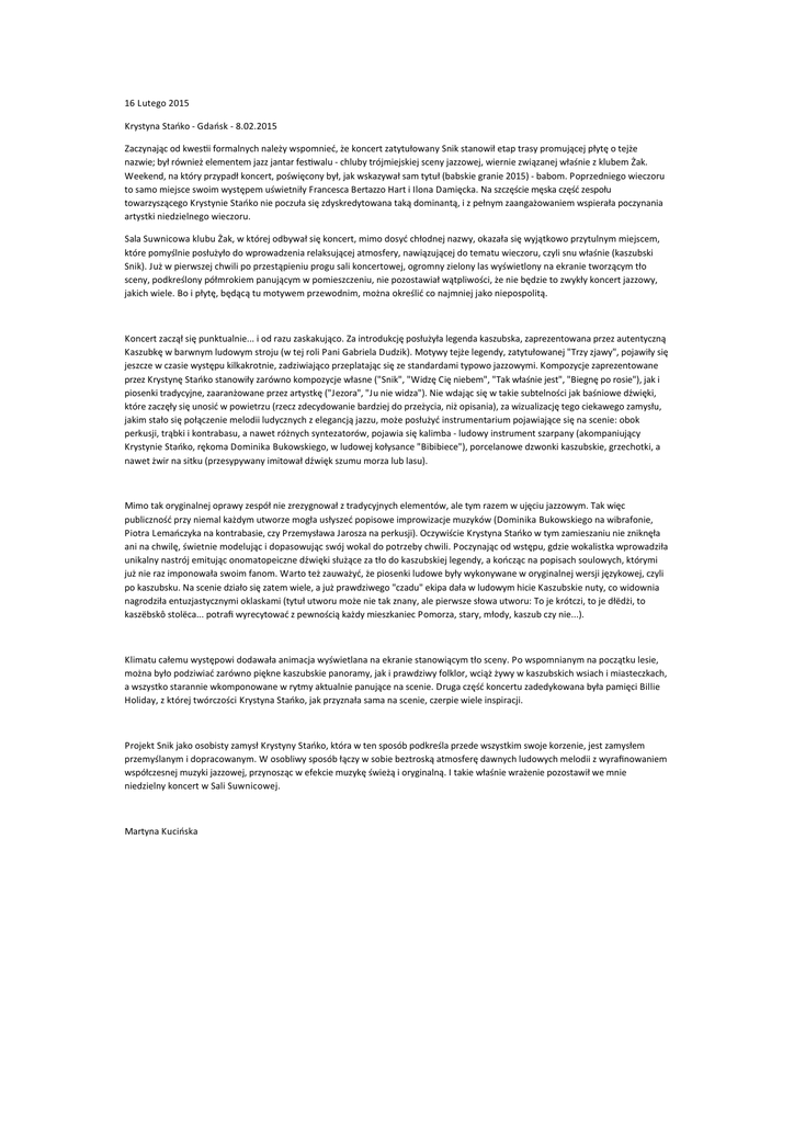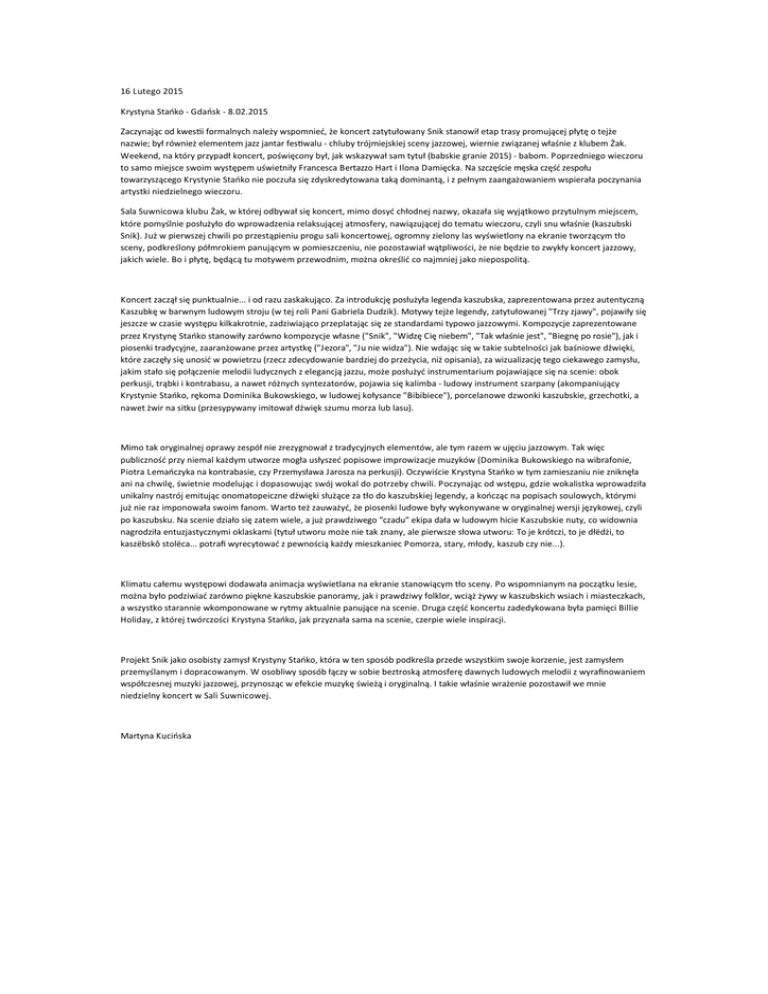 Zaczynając od kwesAi formalnych należy wspomnieć, że koncert zatytułowany Snik stanowił etap trasy promującej płytę o tejże nazwie; był również elementem jazz jantar fesAwalu -‐ chluby trójmiejskiej sceny jazzowej, wiernie związanej właśnie z klubem Żak. Weekend, na który przypadł koncert, poświęcony był, jak wskazywał sam tytuł (babskie granie 2015) -‐ babom. P oprzedniego wieczoru to samo miejsce swoim występem uświetniły Francesca Bertazzo H art i I lona D amięcka. Na szczęście męska część zespołu towarzyszącego K rystynie Stańko nie poczuła się zdyskredytowana taką dominantą, i z pełnym zaangażowaniem wspierała poczynania artystki niedzielnego wieczoru.